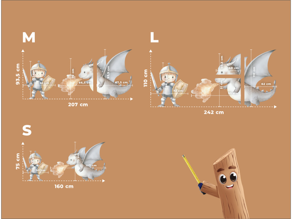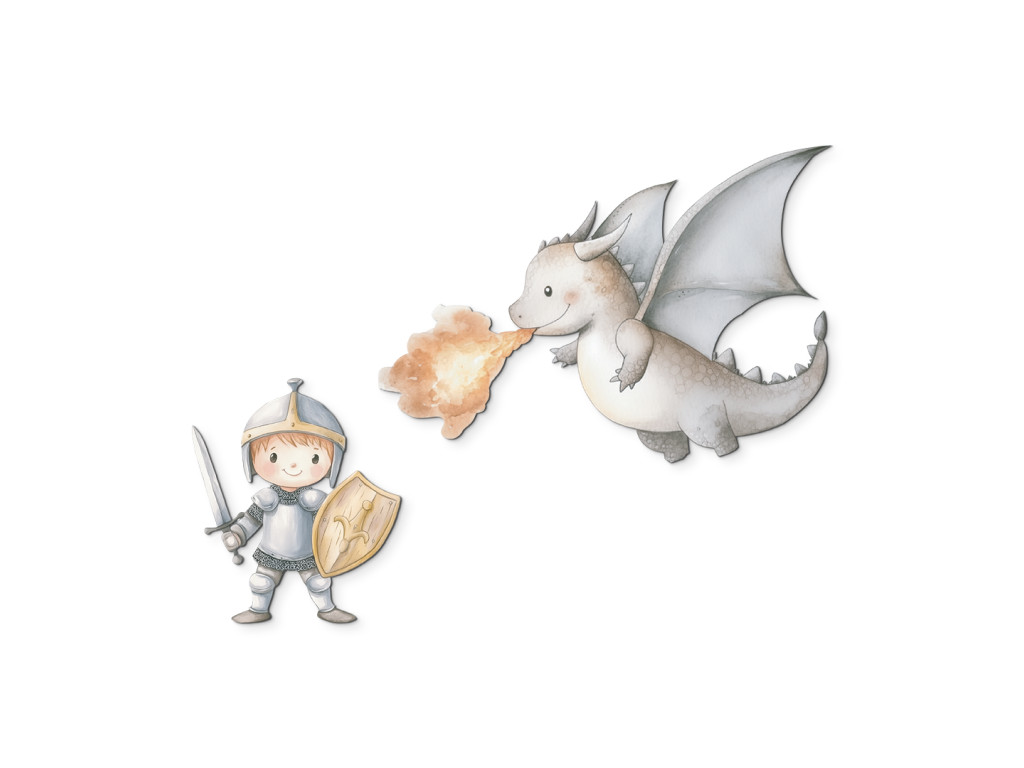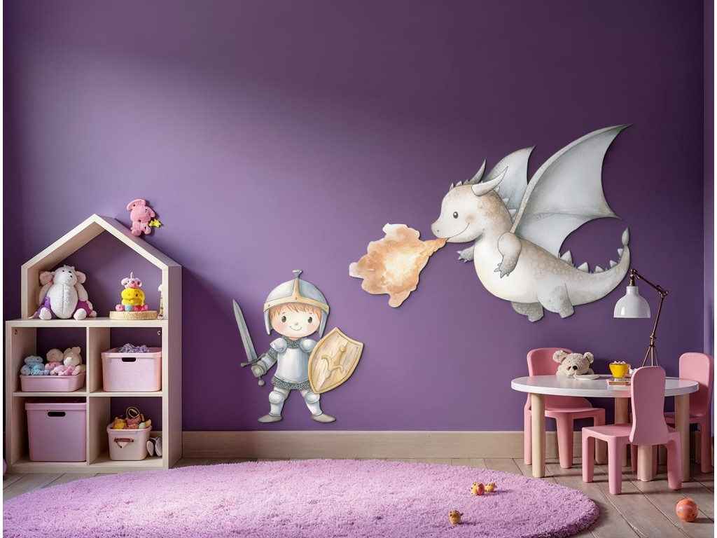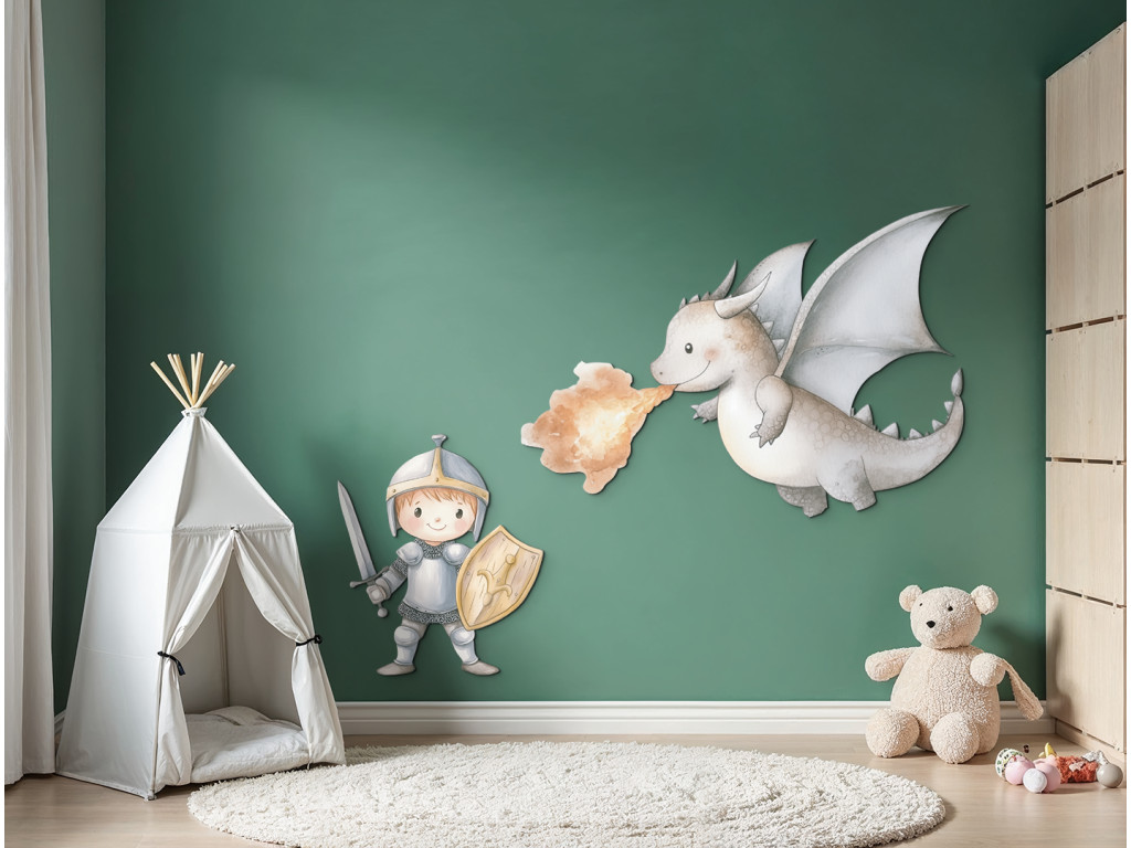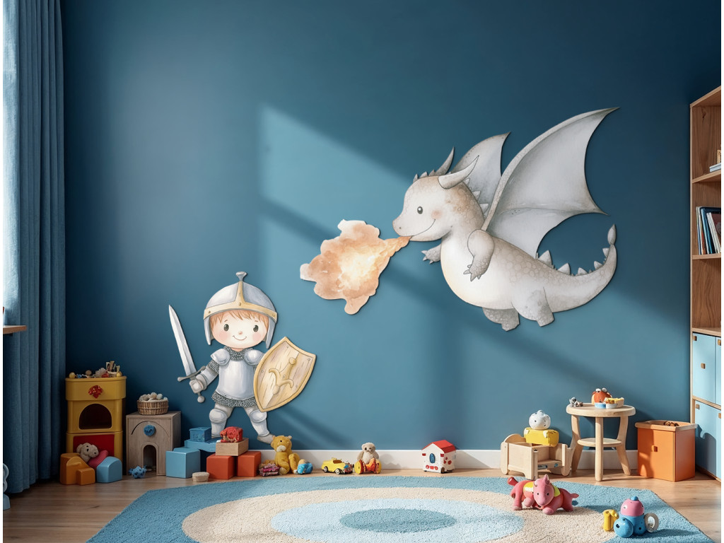 Egy imádnivaló rajzolt lovag bátran csatába száll egy aranyos tűzokádó sárkánnyal. A színes és vidám motívum játékos és kalandos hangulatot kölcsönöz a gyermek szobájának, serkentve a fantáziájukat.