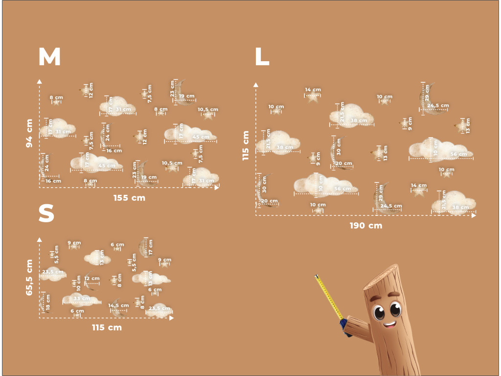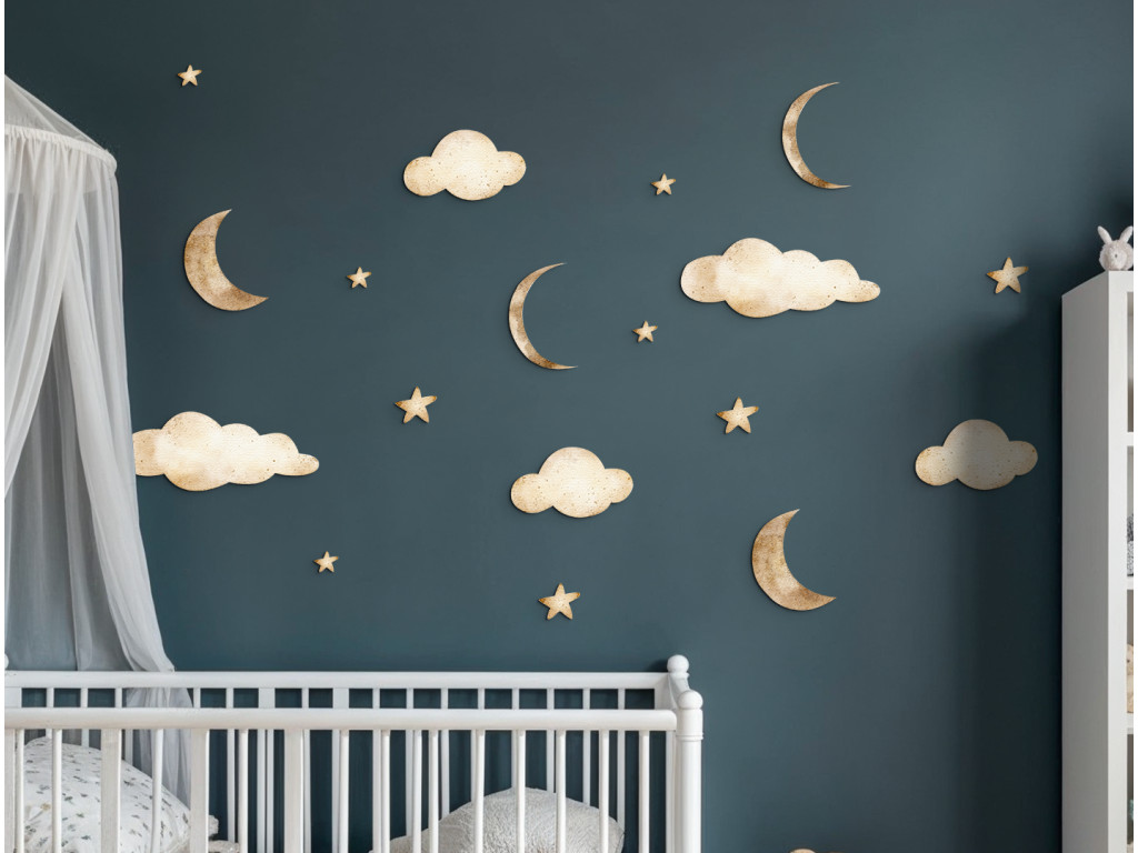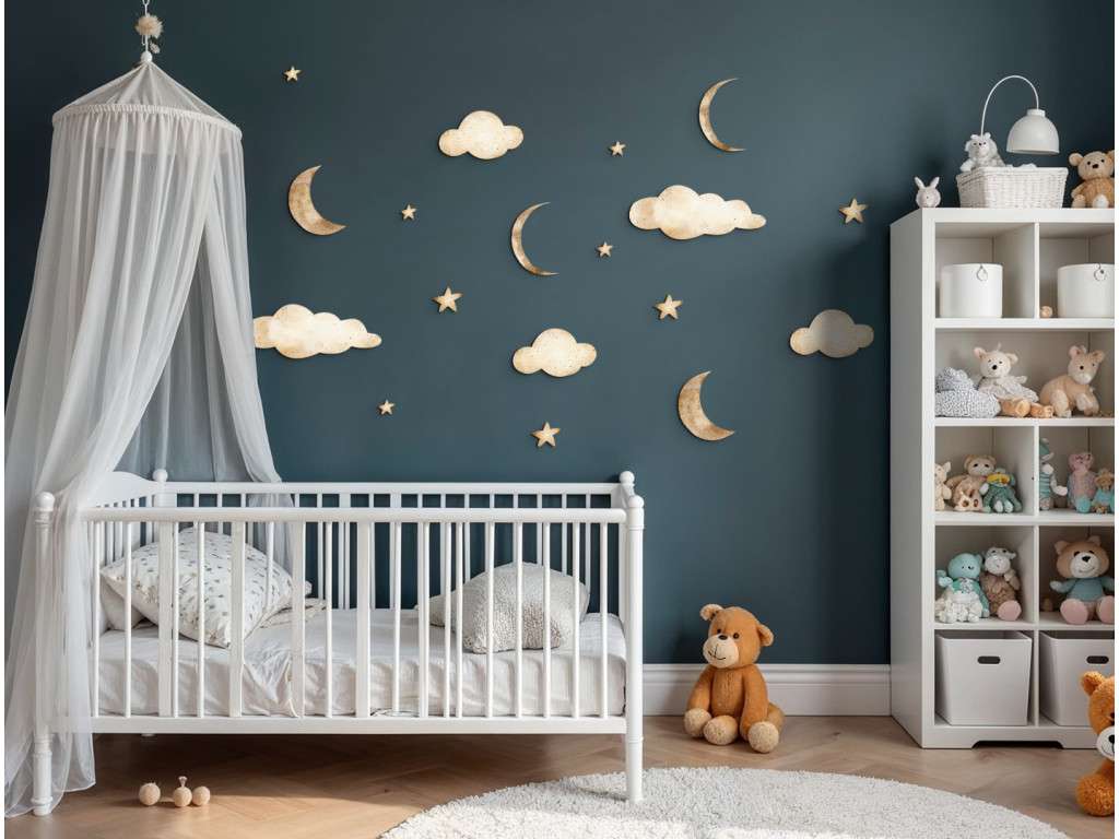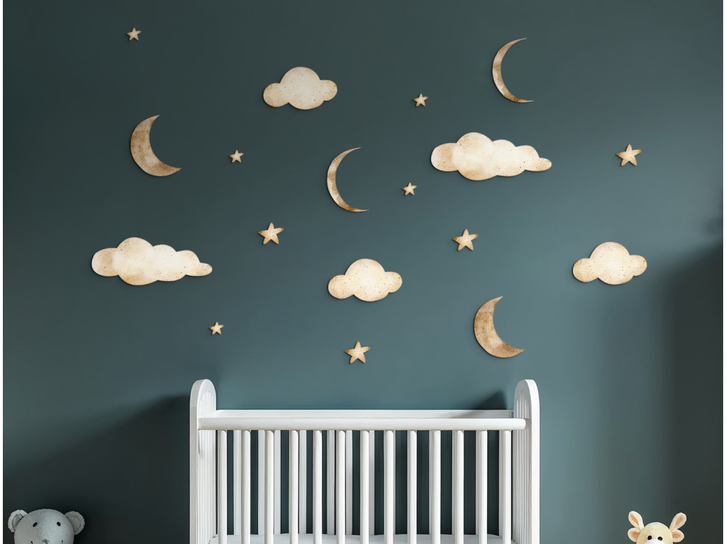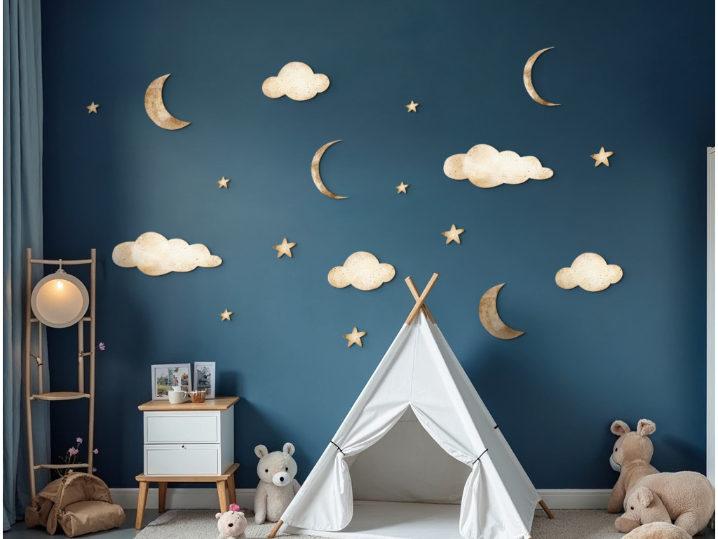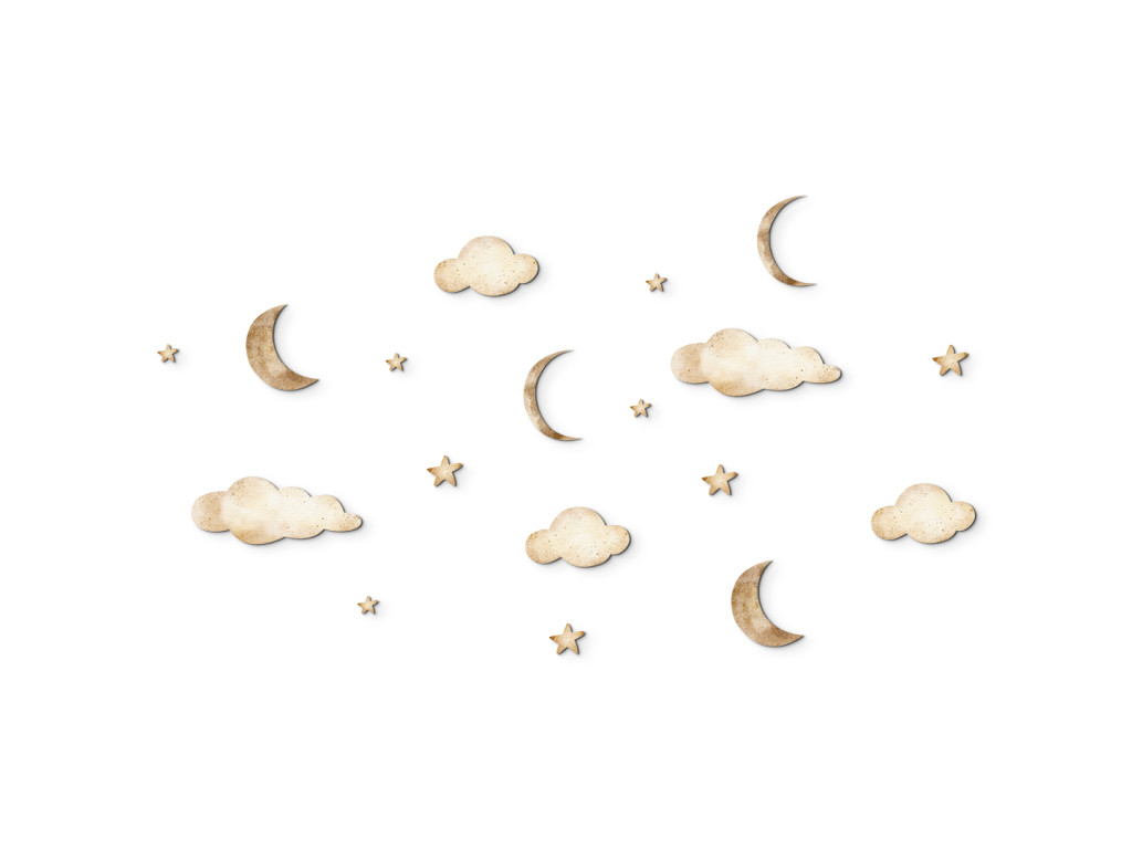 Egy finom és játékos matricakészlet holdakkal, felhőkkel és csillagokkal, amely békét és álomszerű hangulatot teremt a gyerekszobában. Ideális egy hangulatos környezet megteremtéséhez alváshoz vagy pihenéshez.