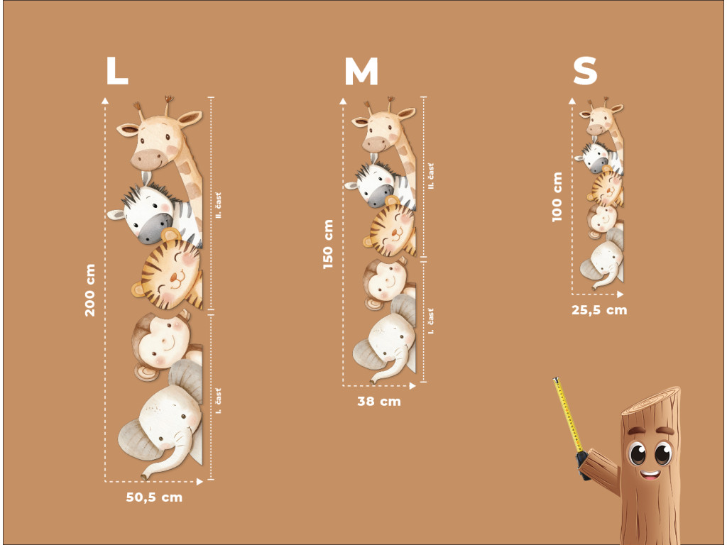 Vidám faldekoráció aranyos rajzolt állatokkal a szavannáról, mint például zsiráf, zebra, oroszlán, majom és elefánt, lágy pasztellszínekben. A motívum úgy lett kialakítva, mintha az állatok a fal sarka vagy egy ajtó mögül kukucskálnának ki, játékos és barátságos hangulatot kölcsönözve a gyerekszobának.