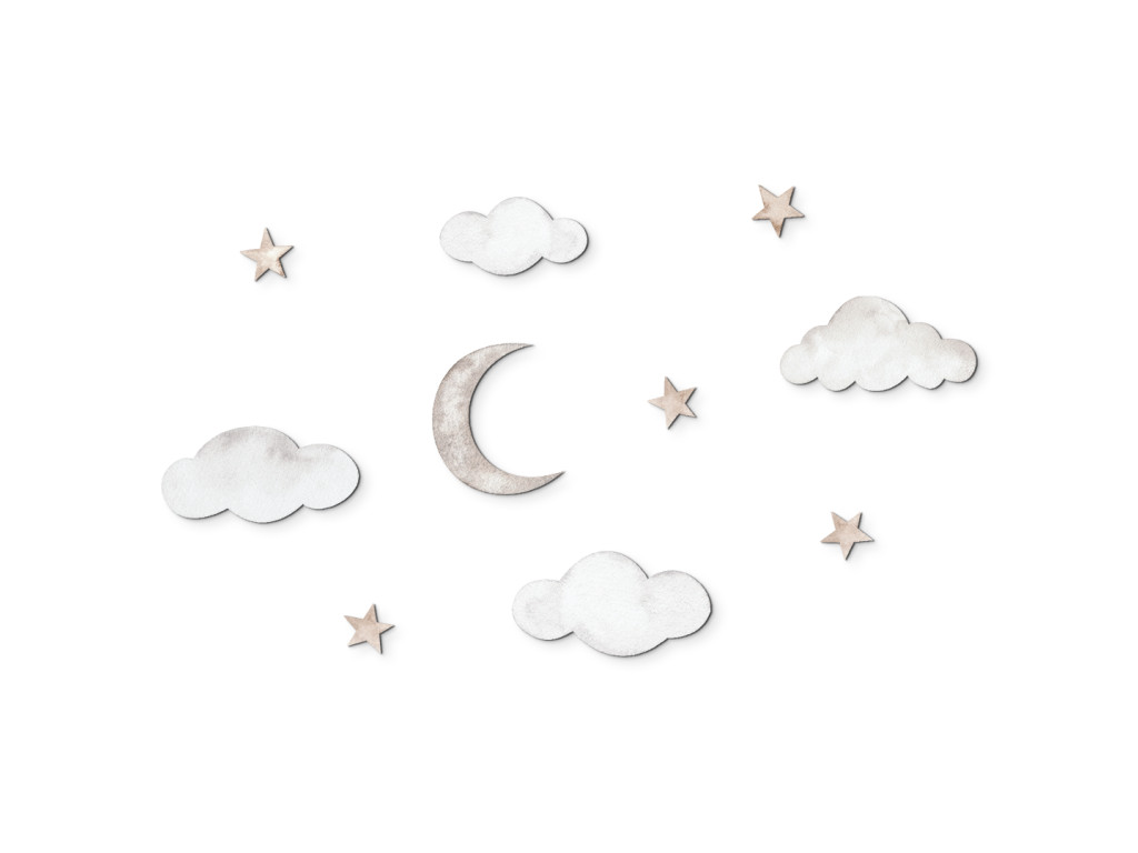 Finom, lágy hangulatú összeállítás, amely az éjszakai ég varázsát és nyugalmat hozza a térbe. Felhők, ragyogó csillagok és egy finom holdsarló együtt álomszerű és kellemes atmoszférát teremtenek az alvó vagy a pihenősarokban.