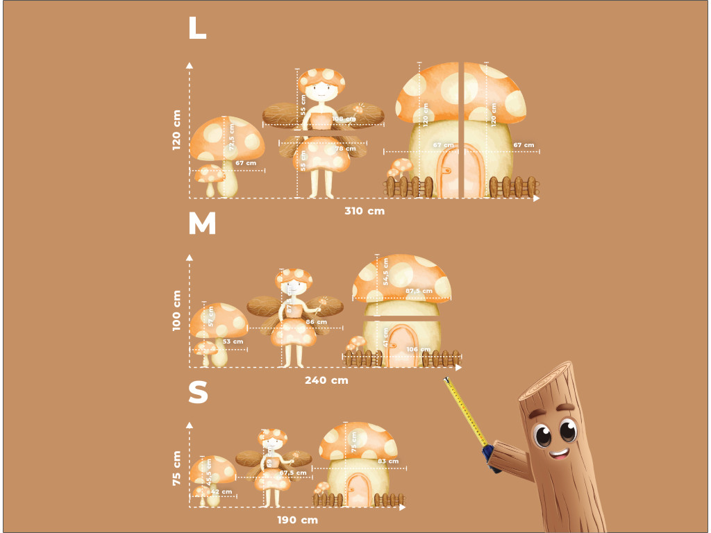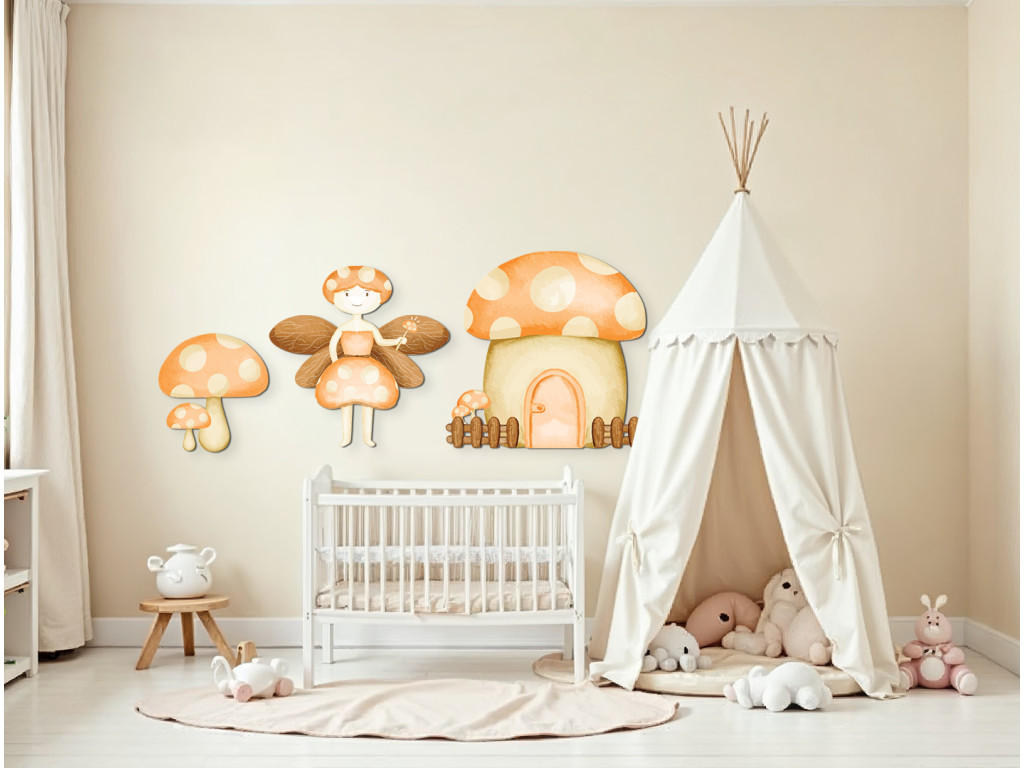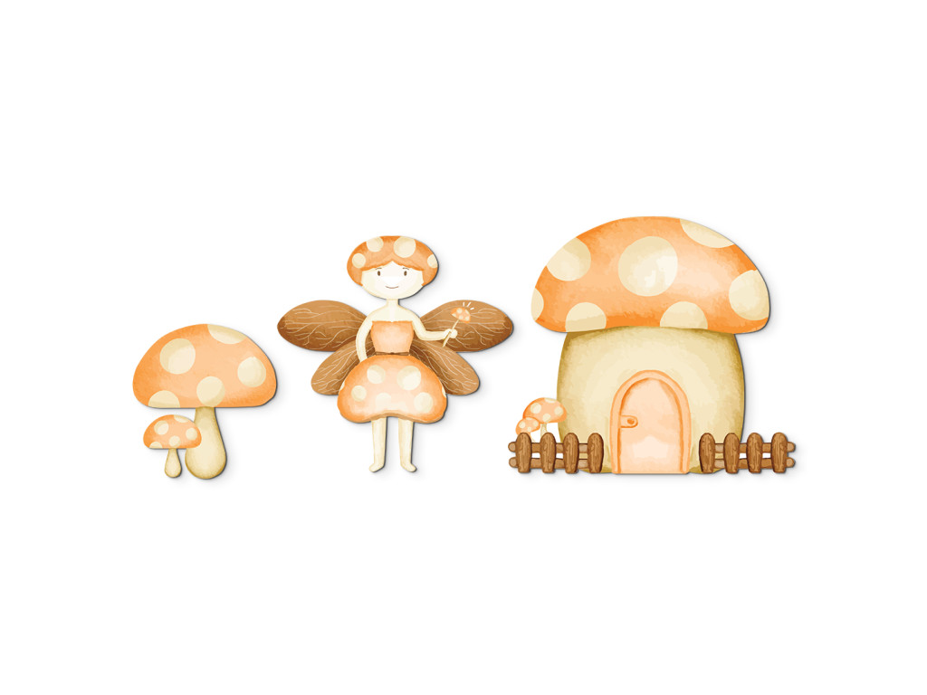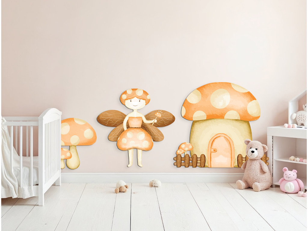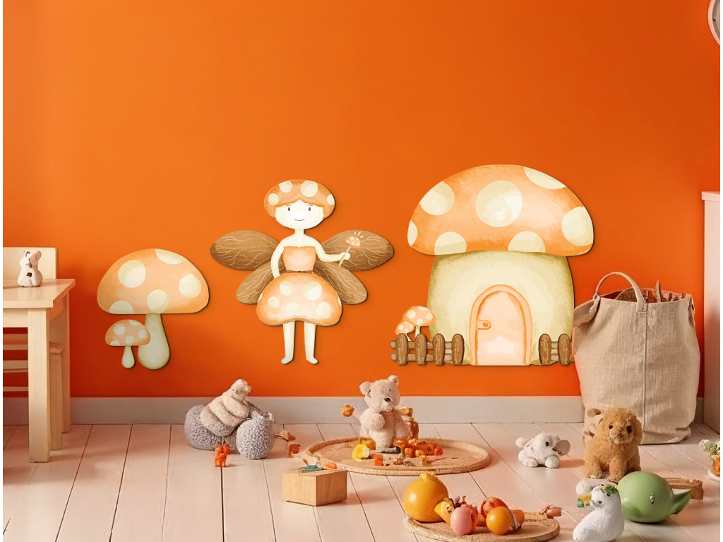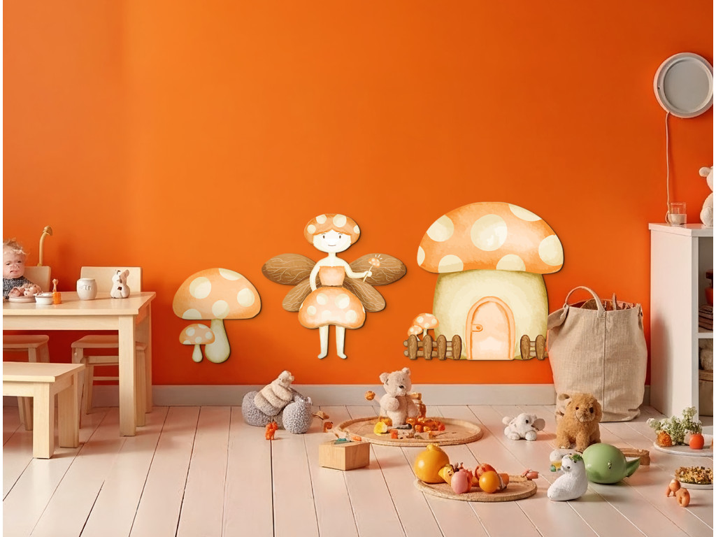 Egy aranyos tündér áll rajzfilmszerű gombák között, mintha erdei királyságát őrizné. Az élénk színek és a meseszerű motívum vidám és játékos hangulatot teremt, tökéletesek egy gyerekszoba feldobására.