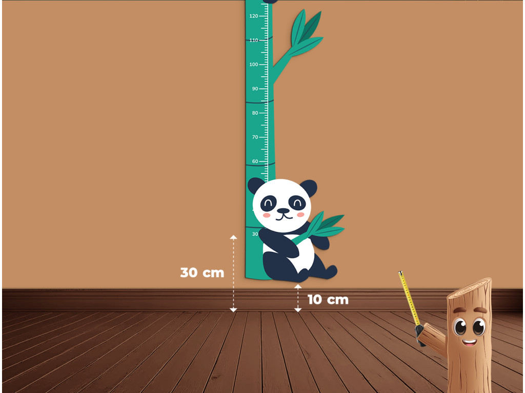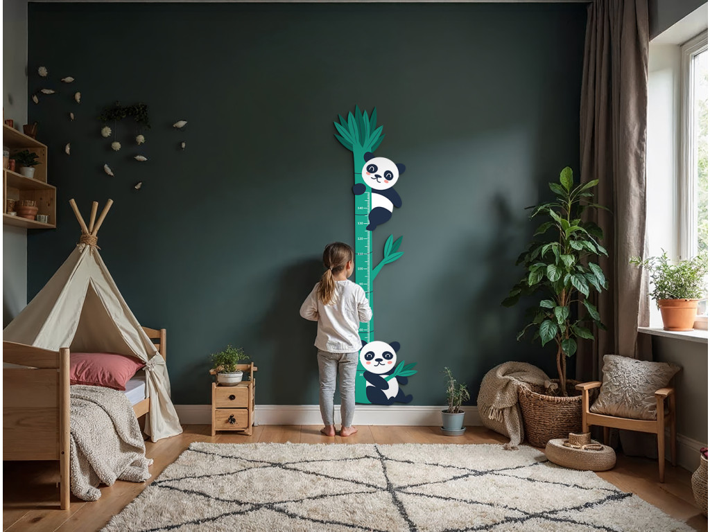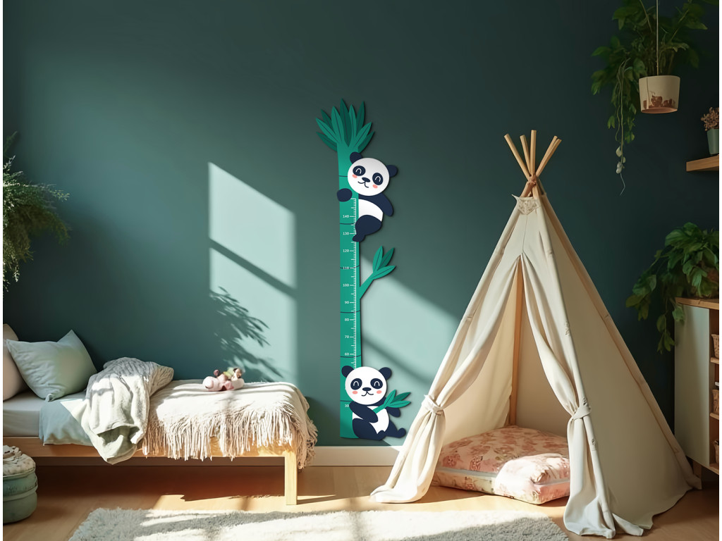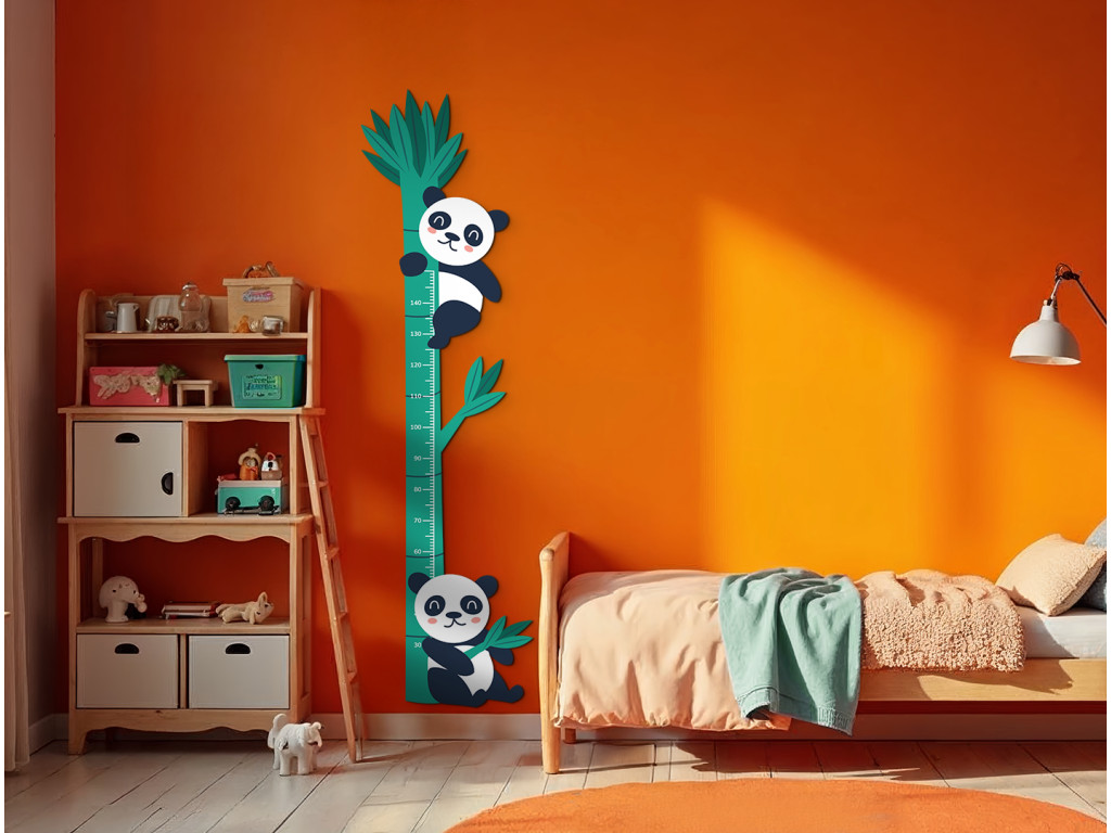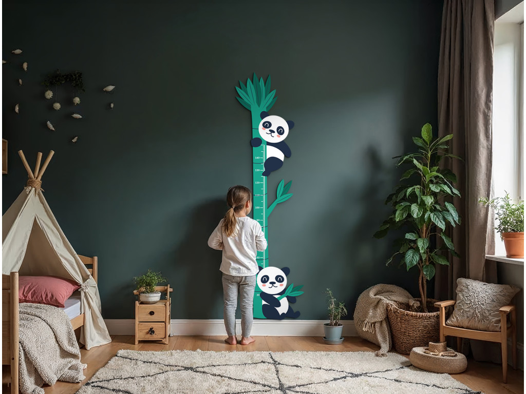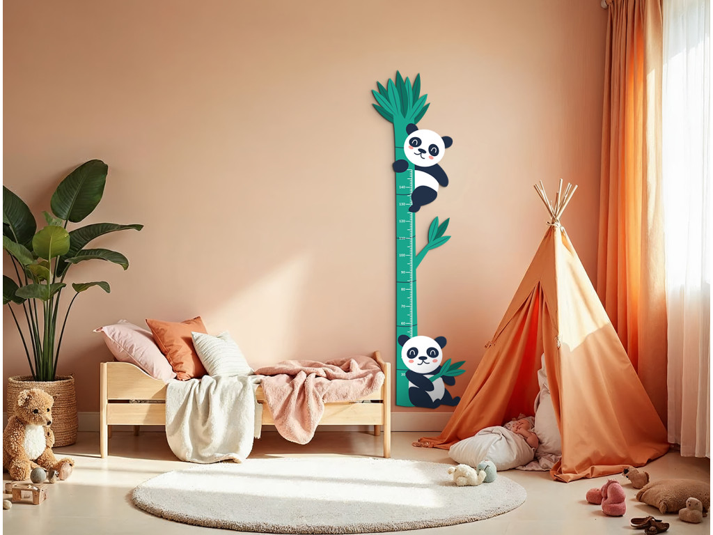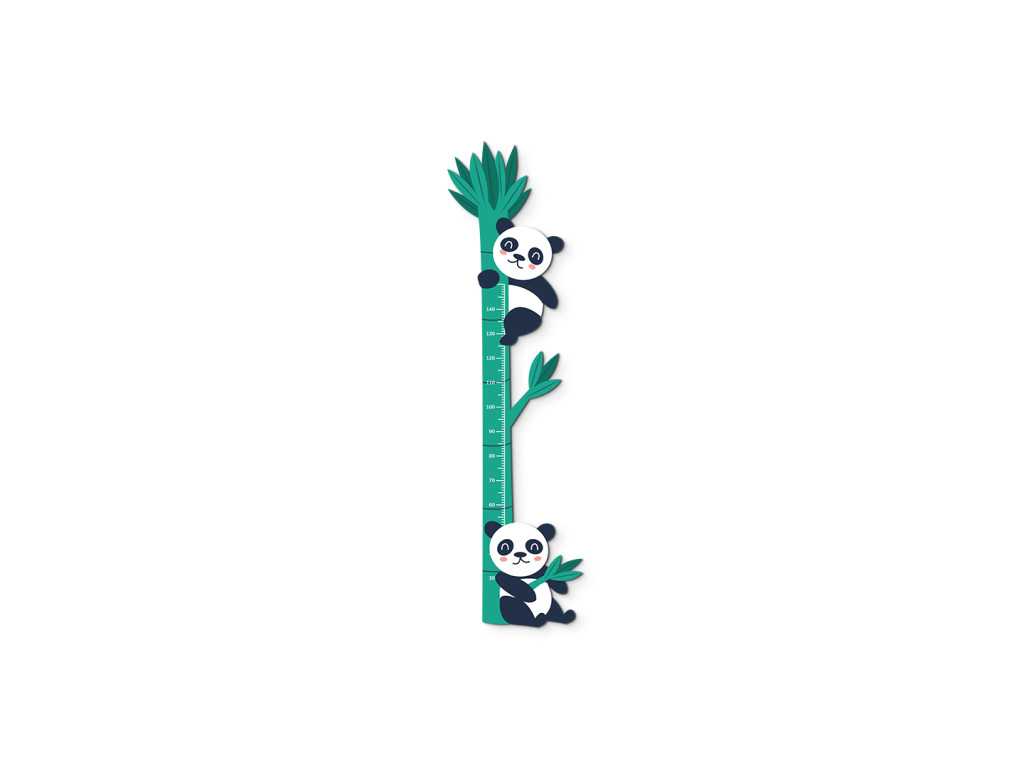 A két pandával díszített, bambusz alakú gyermek fali mérőszalag egy vidám kiegészítő, amely még élvezetesebbé teszi a gyerekek fejlődésének nyomon követését. Az egyik panda a bambuszon mászik, a másik a gyökérnél ül, ami játékossá és aranyossá teszi a dizájnt. Ez a mérőszalag megbízhatóan mér akár 150 cm magasságig, és bármelyik gyerekszobát otthonossá teszi.