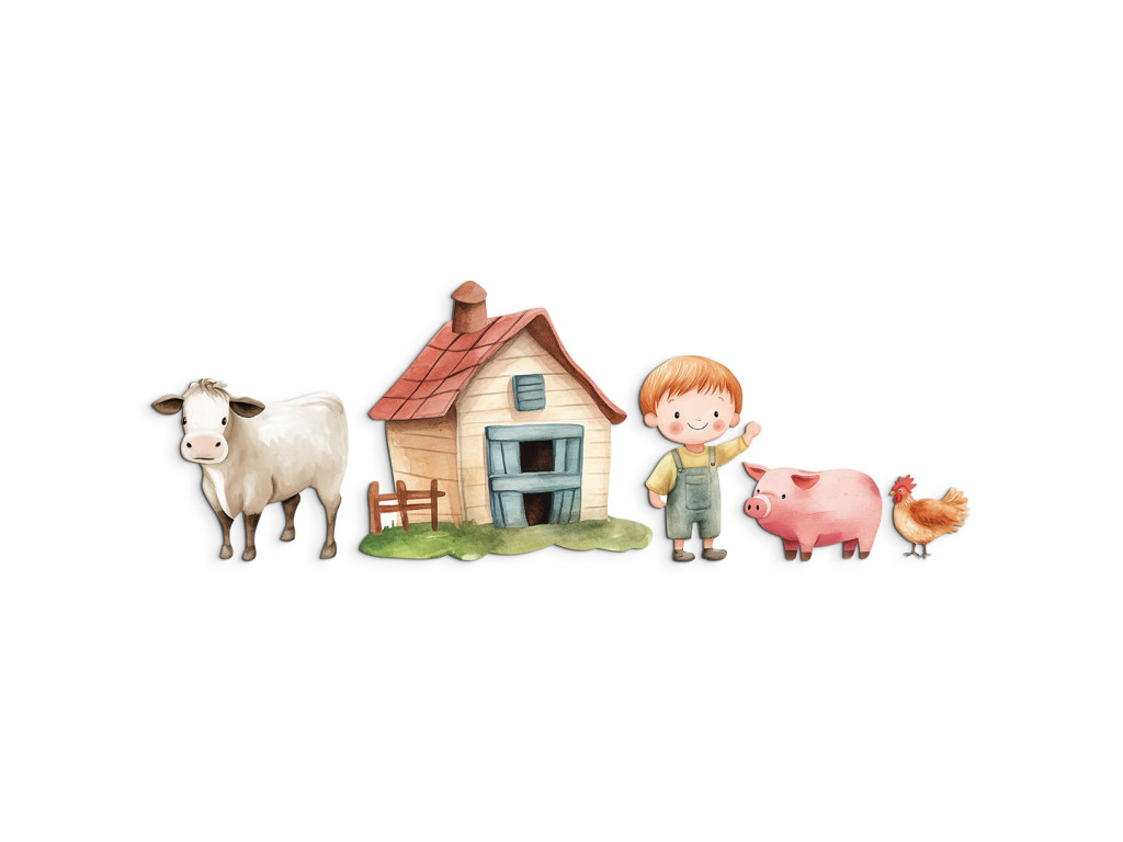Aranyos illusztráció egy farm jelenetével, ahol kisfiú overálban vidáman integet a pajtánál. Társai a tehén, a malacka és a tyúk, a hangulat meleg és kellemes, ideális gyerekszobába vagy játékos kis kuckóba.