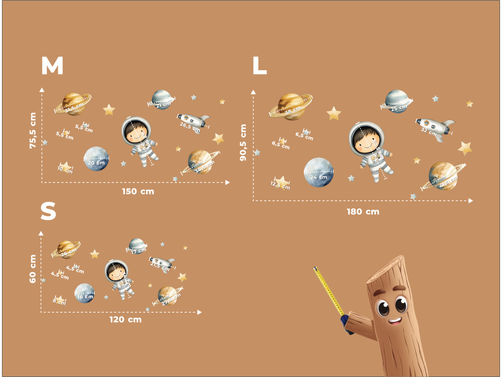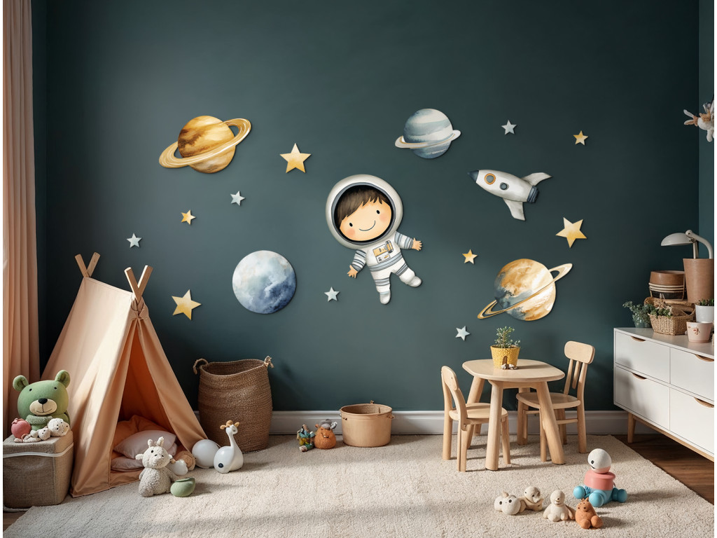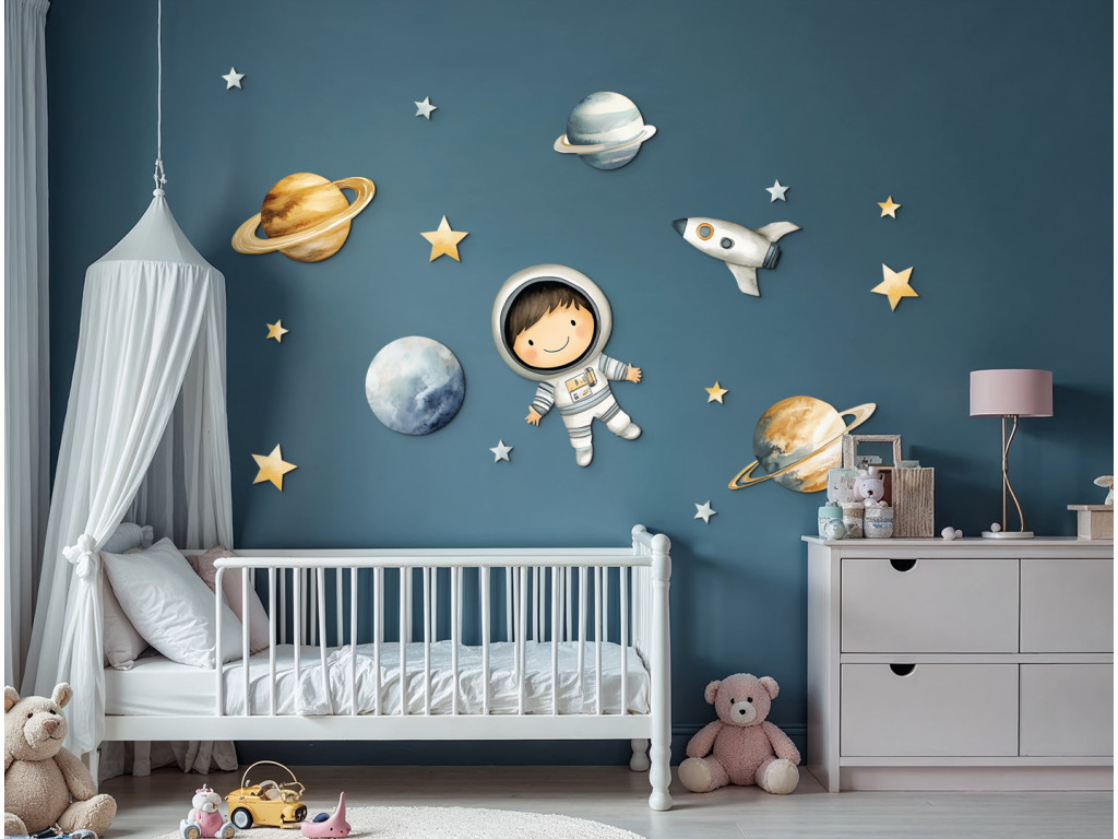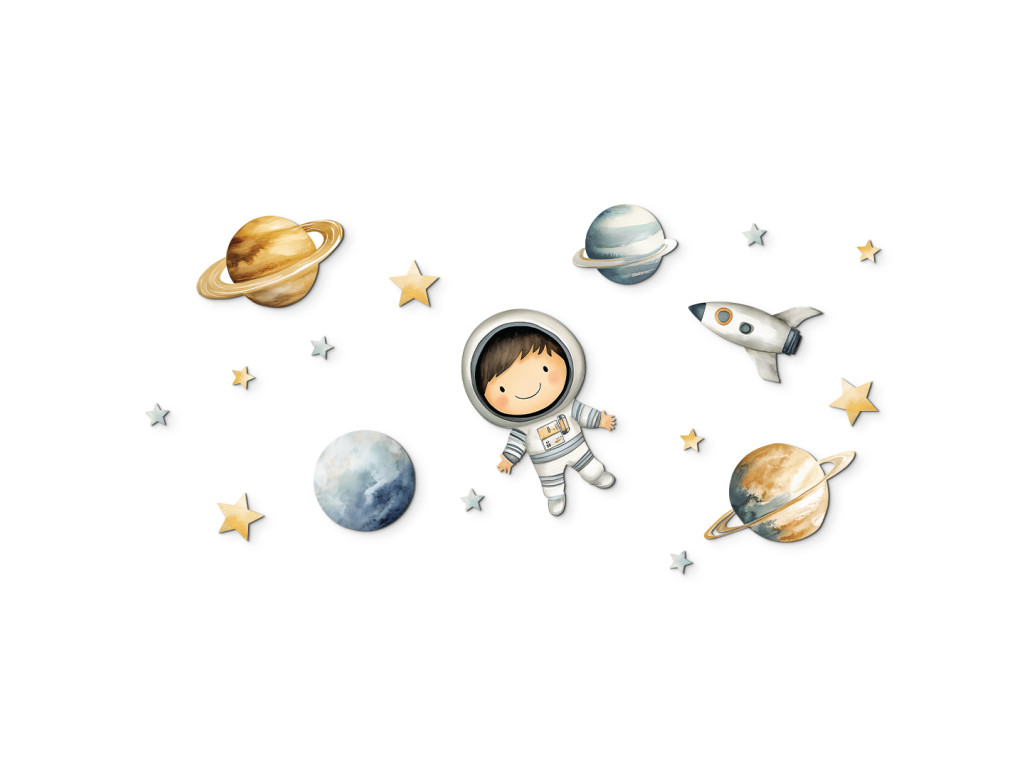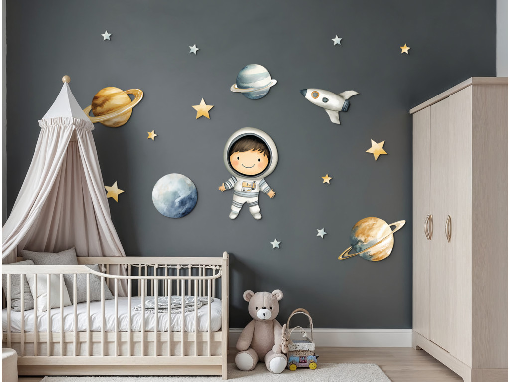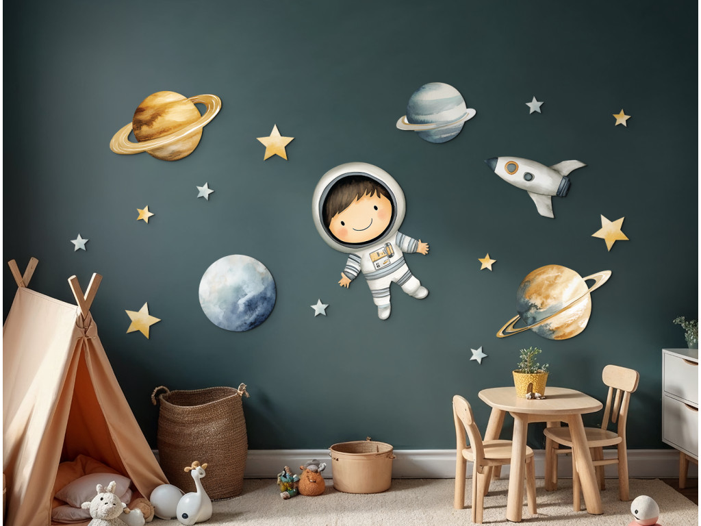 A kis űrhajós csillagok és színes bolygók között lebeg, a felfedezés varázsát megmutatva. Az illusztráció a kíváncsiságot, a bátorságot és a fantáziát emeli ki – tökéletes falikép kis álmodóknak és leendő asztronautáknak.