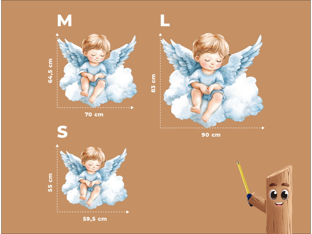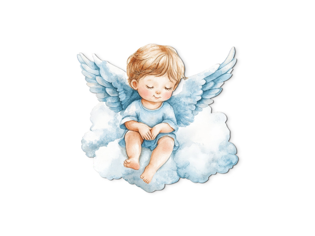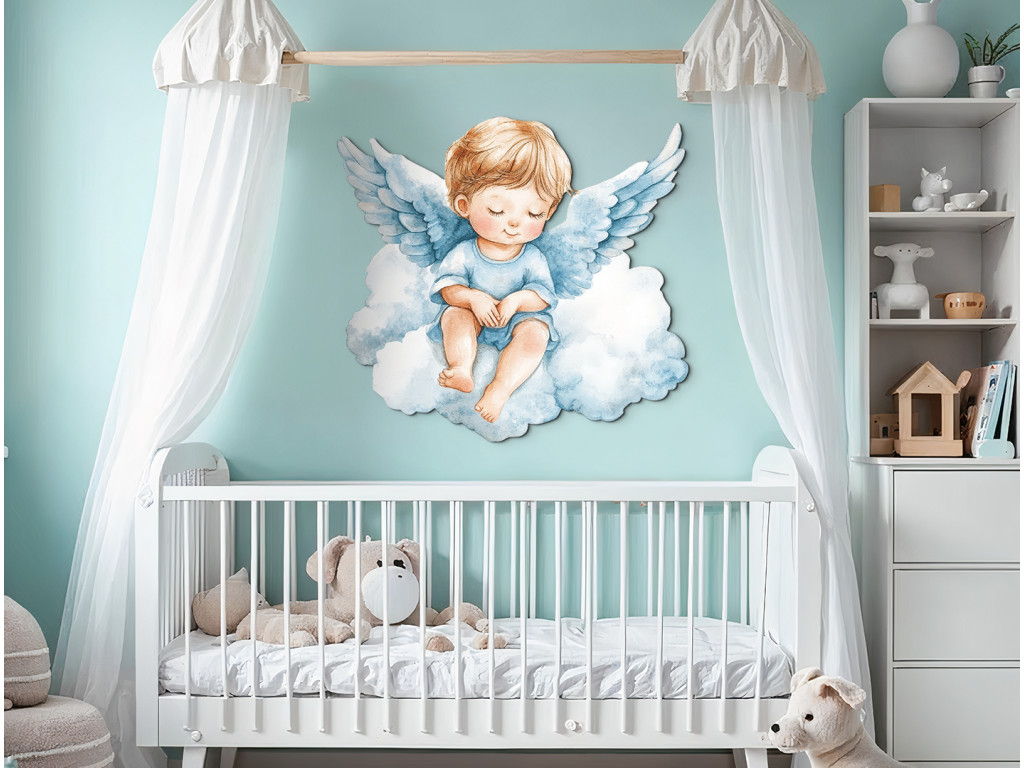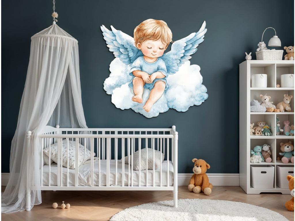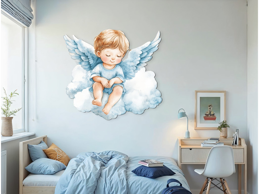 Egy kis angyal ül egy felhőn, és szeretettel néz le. A kék árnyalatok békét és tisztaságot kölcsönöznek a képnek - tökéletesek egy álomszerű hálószobába.