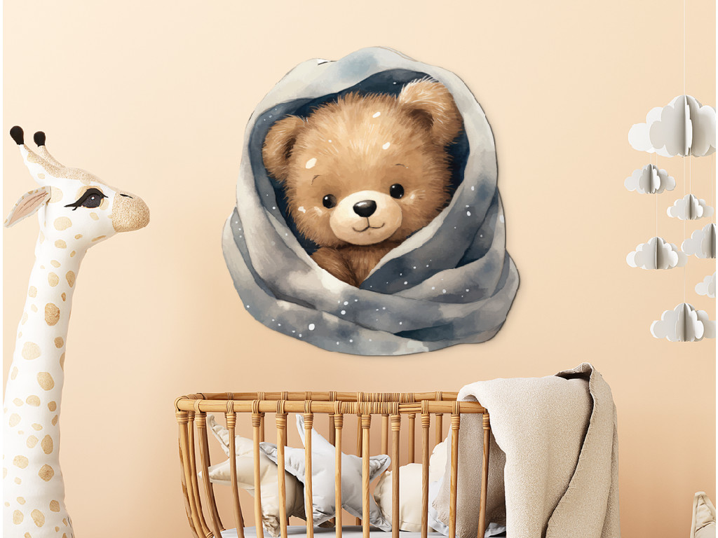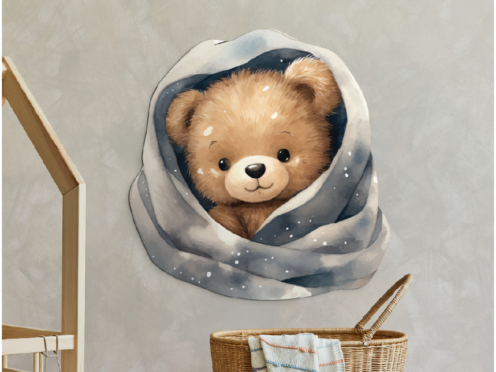 Egy csillagokkal és hópelyhekkel teli puha takaróba rejtett plüssmackó... mint egy mesében! Ez a kép a legmeghittebb hangulatot viszi a szobába. Ideális a kiságy feletti falra vagy egy kis alvósnak.
