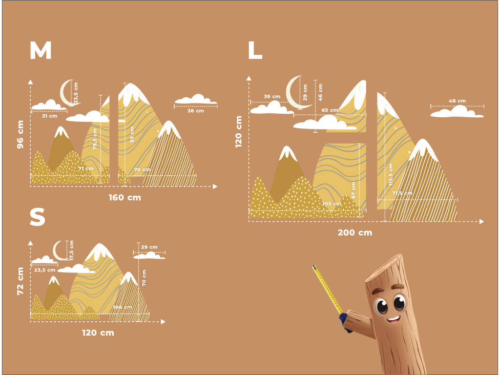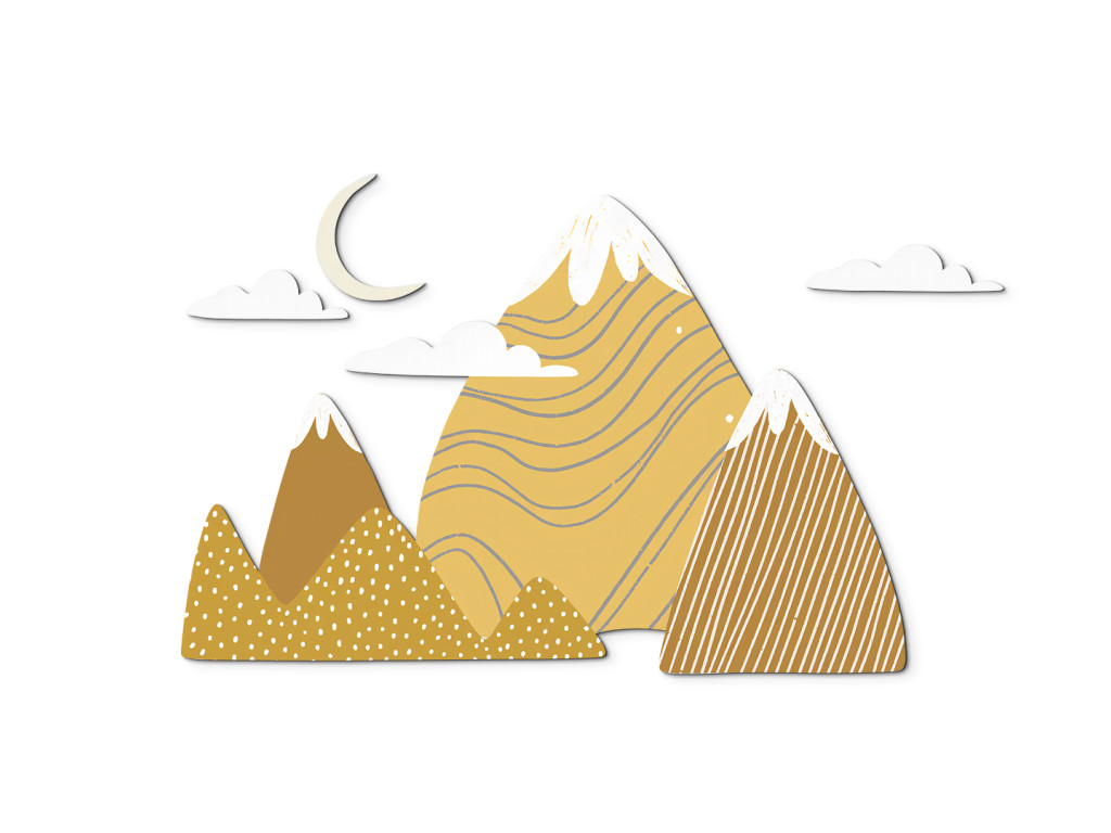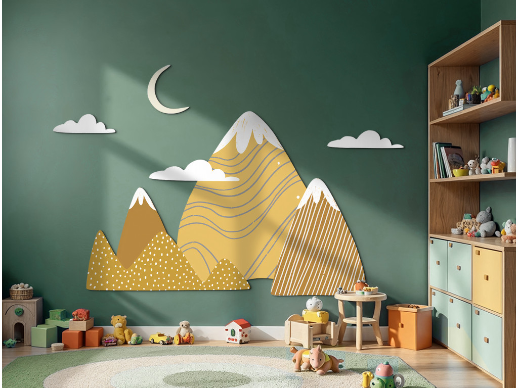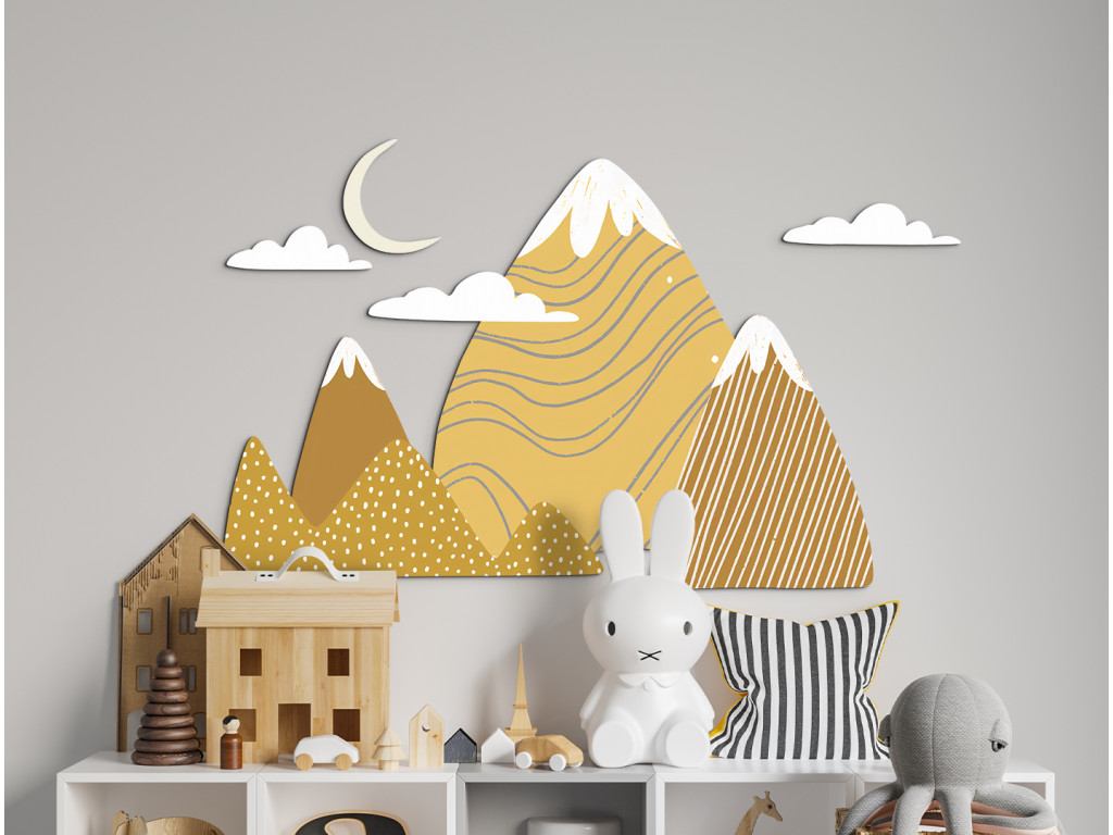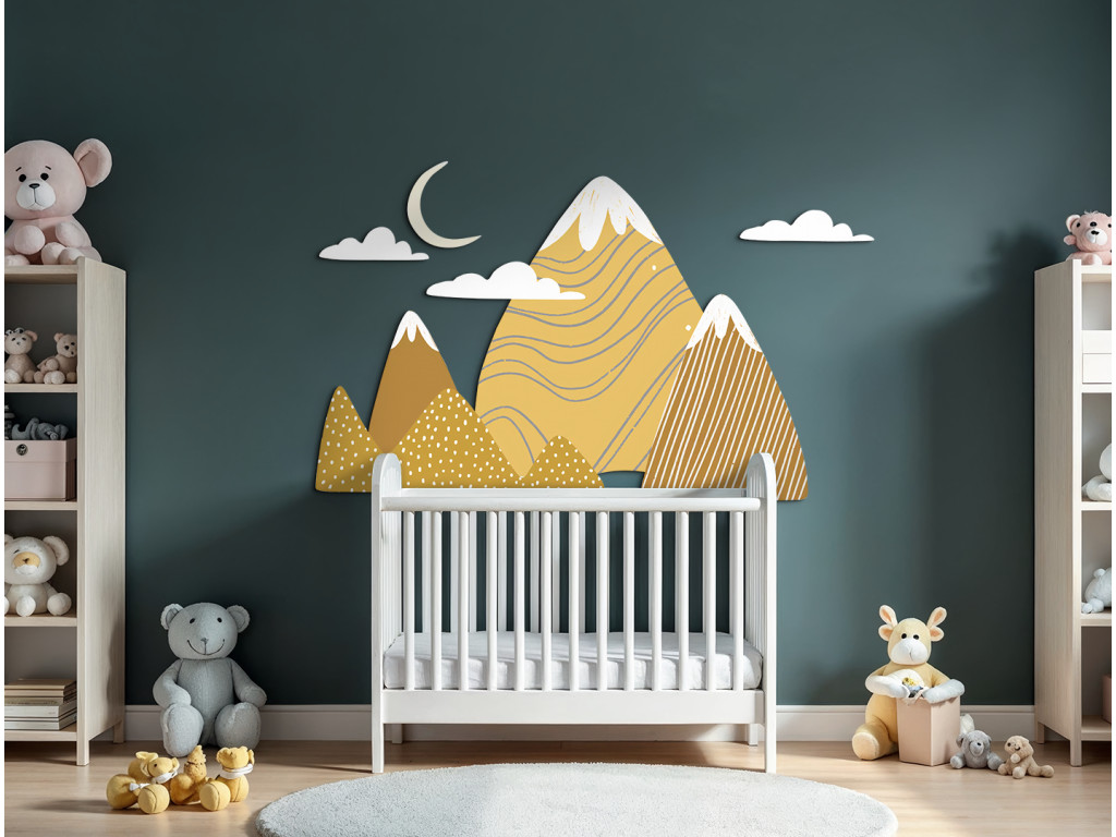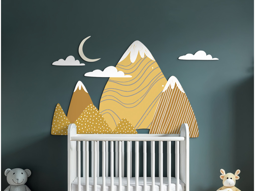 Ez a nagyméretű faldekoráció kalandos és békés hangulatot teremt a gyerekszobában. A stílusos, sárga és barna árnyalatú hegyeket havas csúcsokkal játékos minták, pöttyök és csíkok egészítik ki. A kompozíciót finoman teszik teljessé a fehér felhők és a csúcsok feletti sárga félhold.