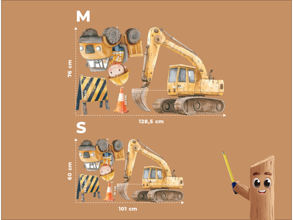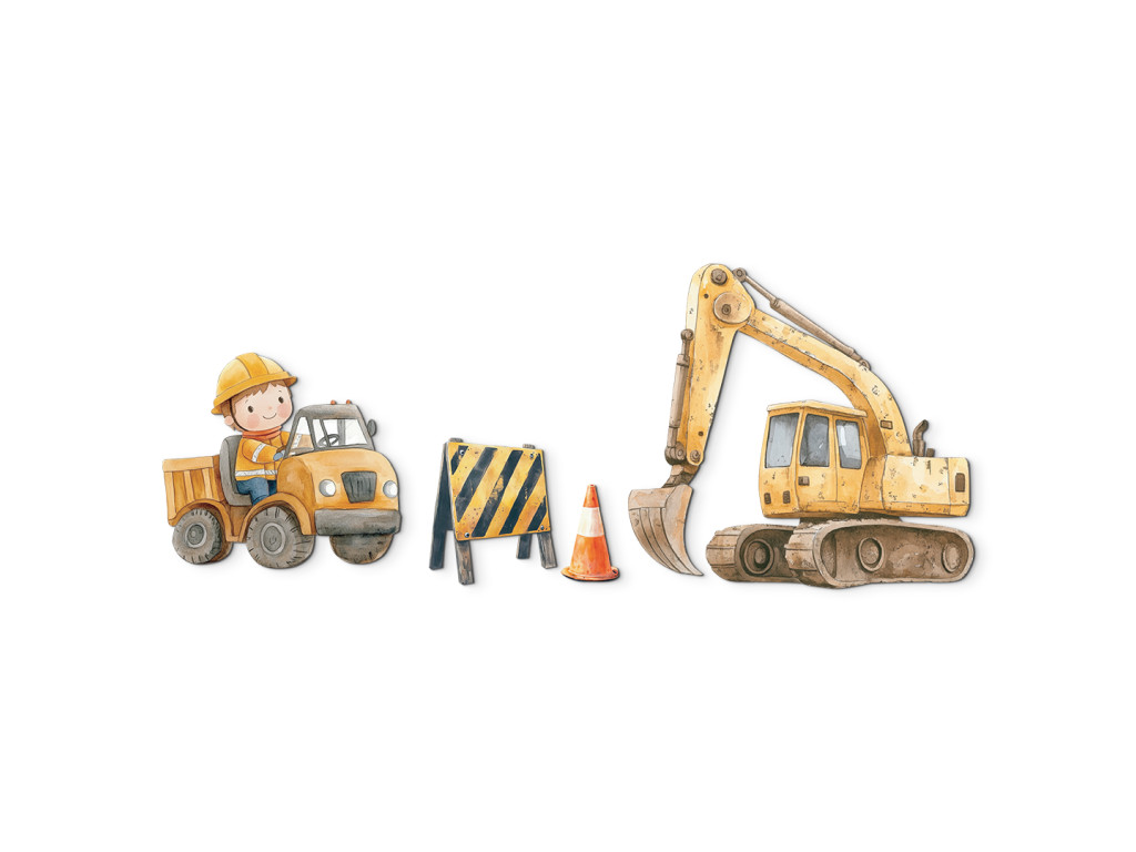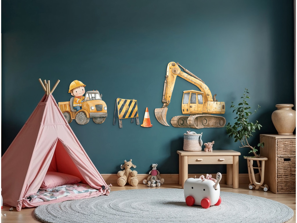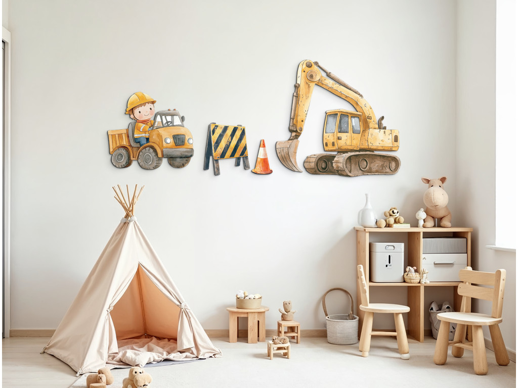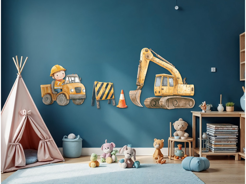Egy vidám motívum, melyen egy Tatra teherautón utazó építőipari munkás és egy munkára kész kotrógép látható, egy forgalmas építkezés hangulatát idézi a szobába. A sárga és narancssárga árnyalatok a rajzfilmszerű stílussal együtt játékos és kalandos dizájnt alkotnak a kis gépek szerelmeseinek.