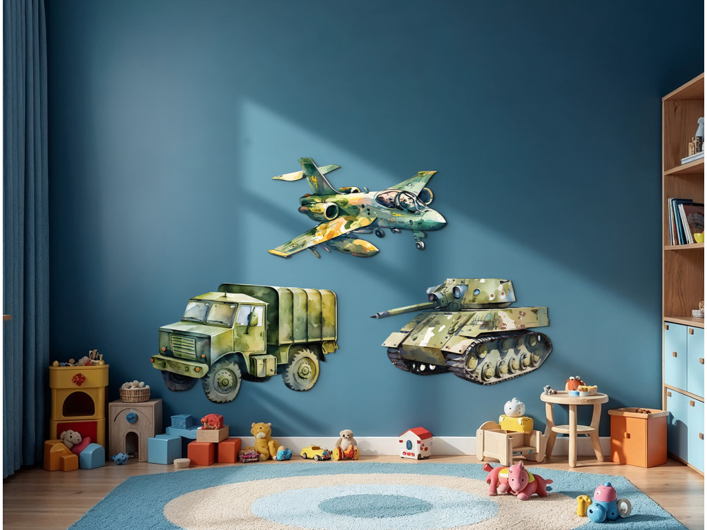 A Katonai technika kép egy tankot, repülőgépet és Tatrát ábrázol játékos stílusban – tökéletes szett a kis gépek és kalandok rajongóinak. Minden jármű úgy van kidolgozva, hogy kedvesen és ne agresszíven hasson – ideális dekoráció egy kis technikus építész vagy autók és gépek rajongójának szobájába.