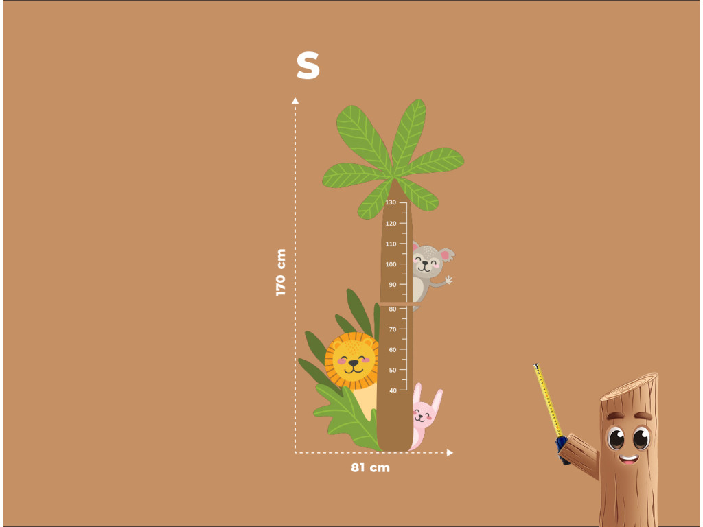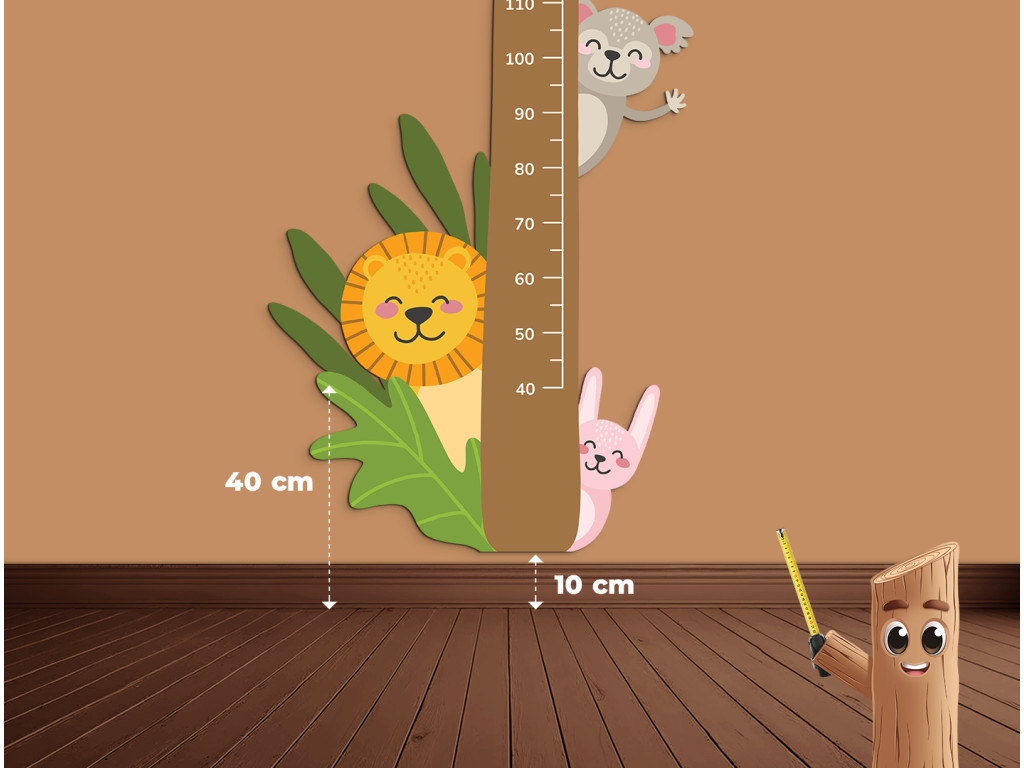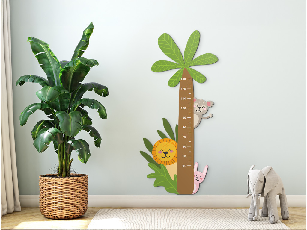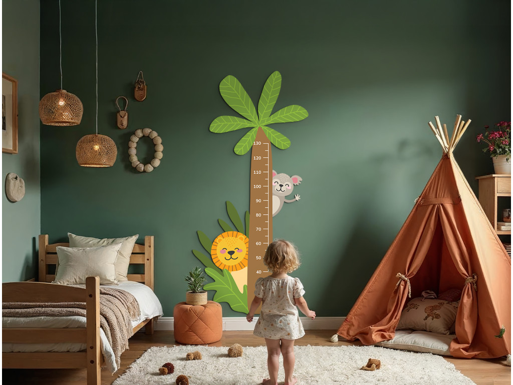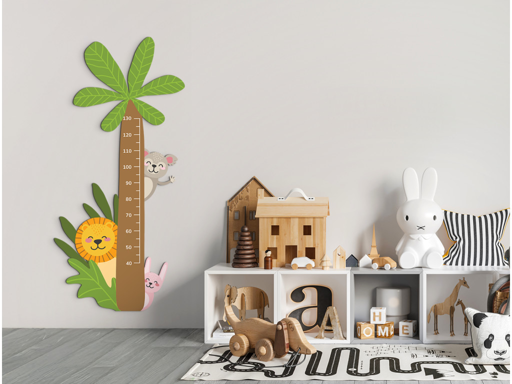 A dzsungel témájú gyerek fali mérőszalag vidám hangulatot teremt az állatokkal, például oroszlánnal, koalával vagy nyuszival teli szobában. A színes, pálmafával kiegészített dizájn magával ragadja a gyerekeket, és praktikus dekorációként is szolgál. Akár 130 cm magas is lehet, így ideális gyermeke első éveinek nyomon követésére.