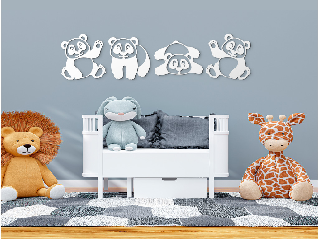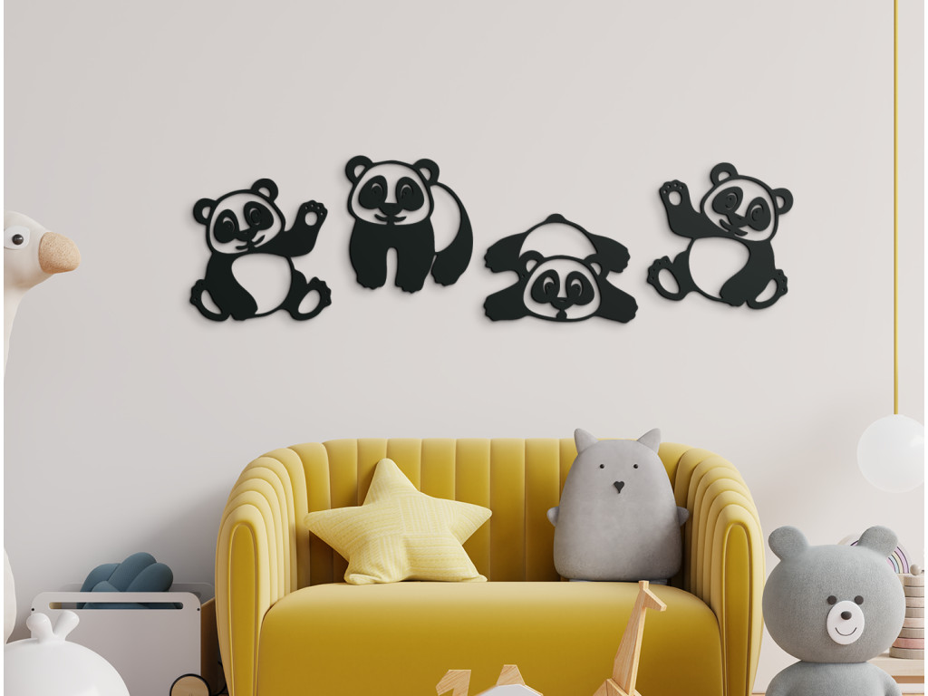 A Pandák népszerű motívumok a gyerekszobákban, mivel a cukiságot és a barátságosságot szimbolizálják. A több panelből álló matrica több panelt tartalmaz, amelyek mindegyike egy pandát ábrázol más-más szórakoztató helyzetben – a játéktól a pihenésig. Ez a dizájn tökéletes egy hangulatos és inspiráló légkör megteremtéséhez, ahol a gyerekek játszhatnak és fejleszthetik fantáziájukat egy aranyos pandákkal teli környezetben.