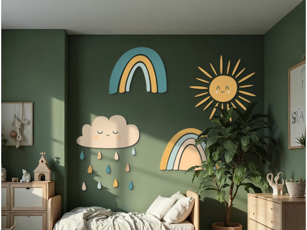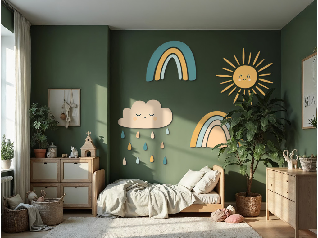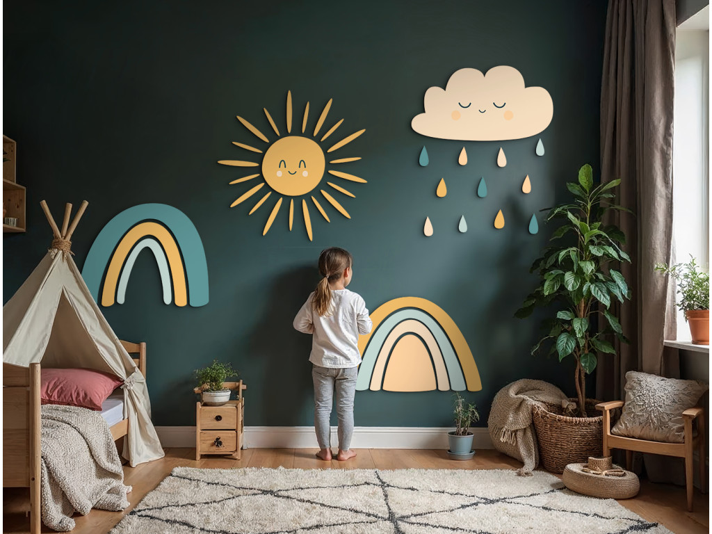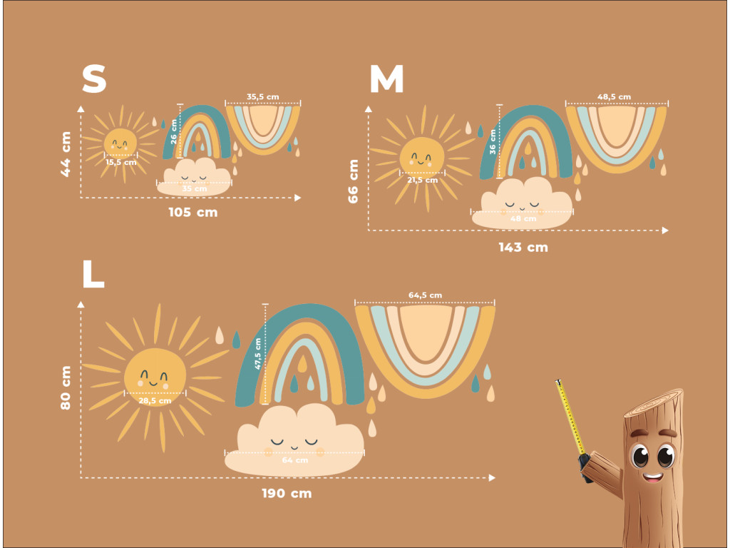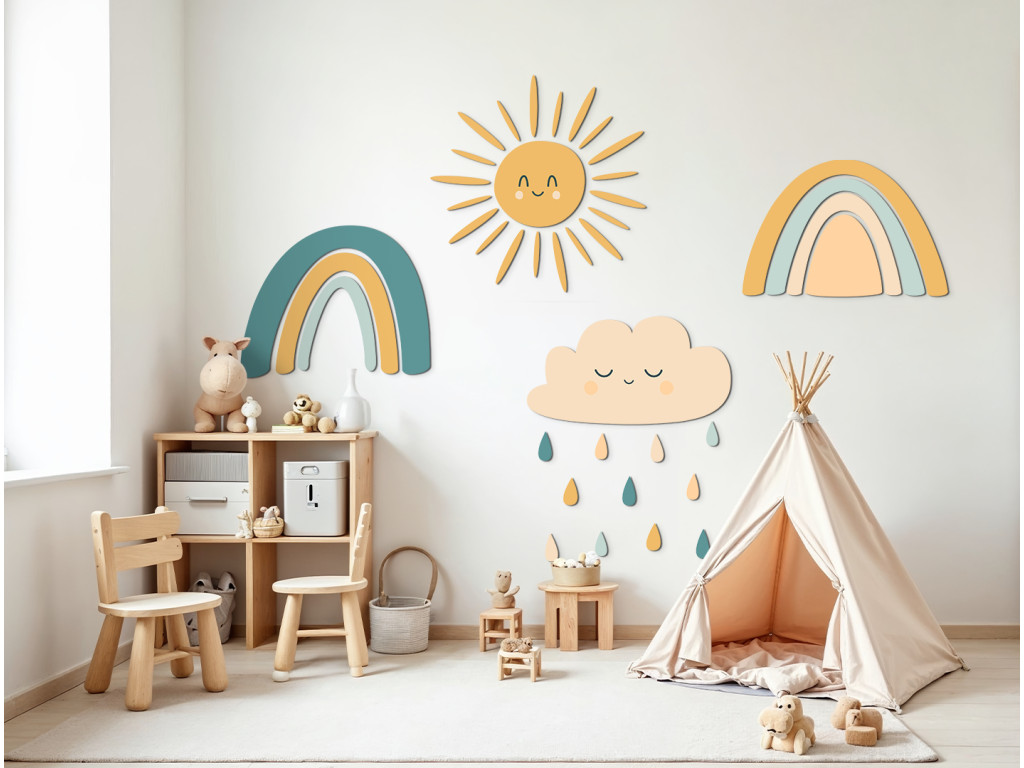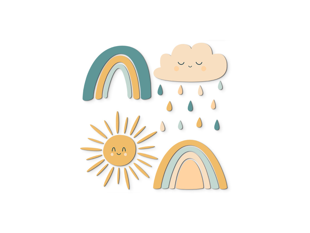 Ez az árnyalt fali dekoráció pasztell színekben hozza el az égbolt varázsát a gyerekszobába. Hozzá tartozik egy vidám napocska, egy felhőcske finom esőcseppekkel és két kedves szivárvány, amelyek játékos és nyugtató hatást keltenek. Ideális a tér otthonossá tételéhez és egy vidám légkör megteremtéséhez a gyerekek számára.