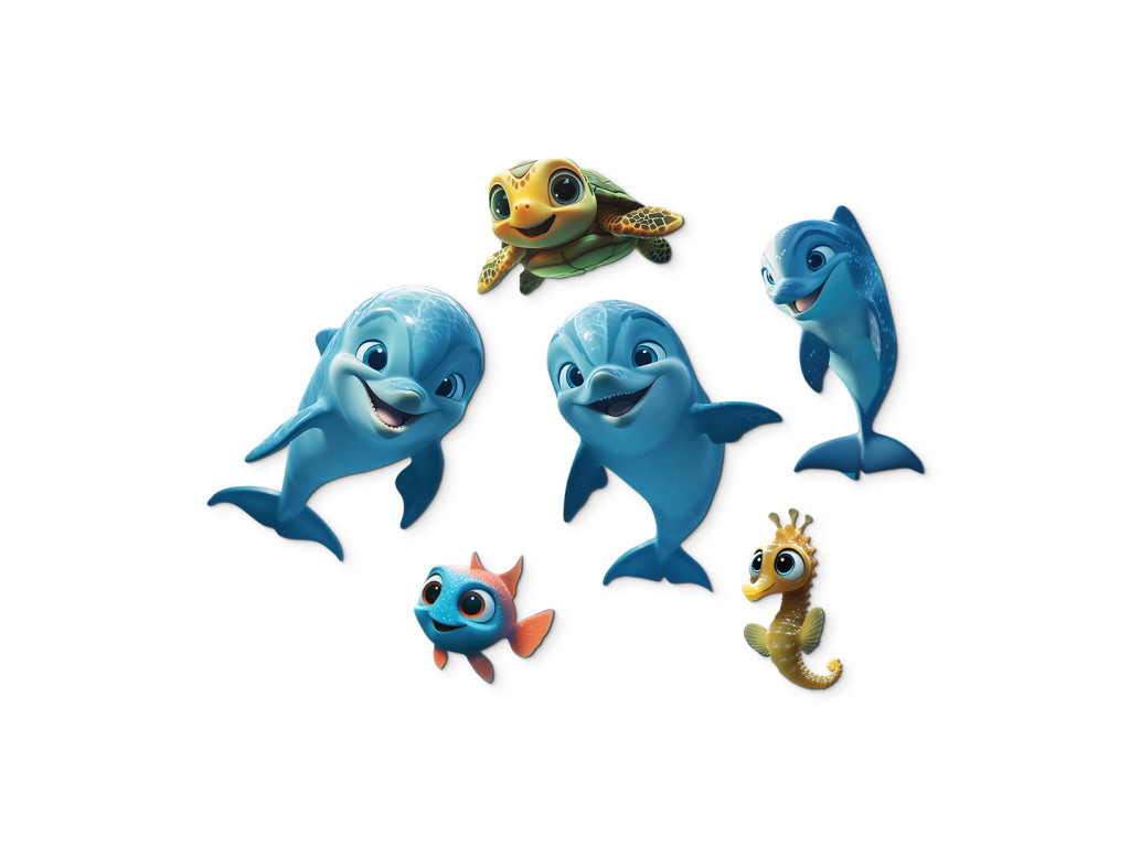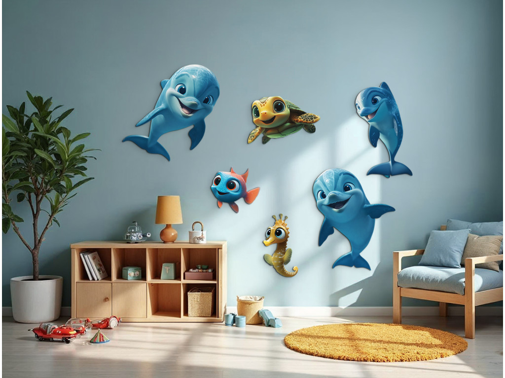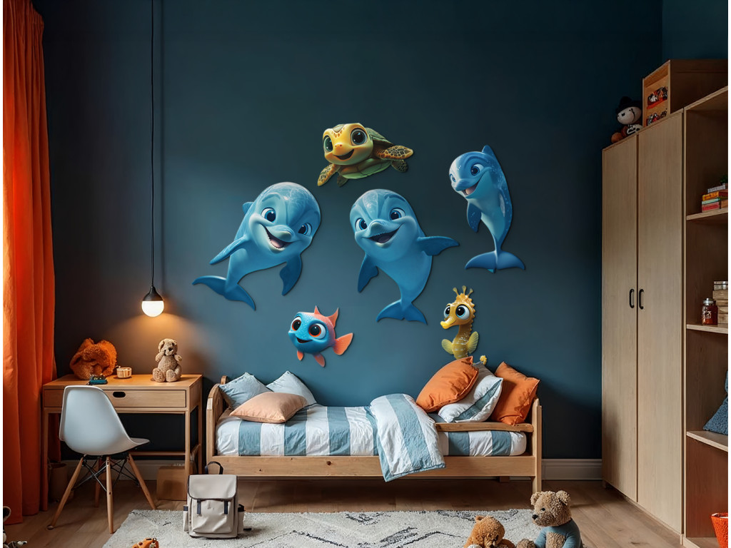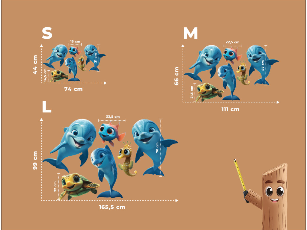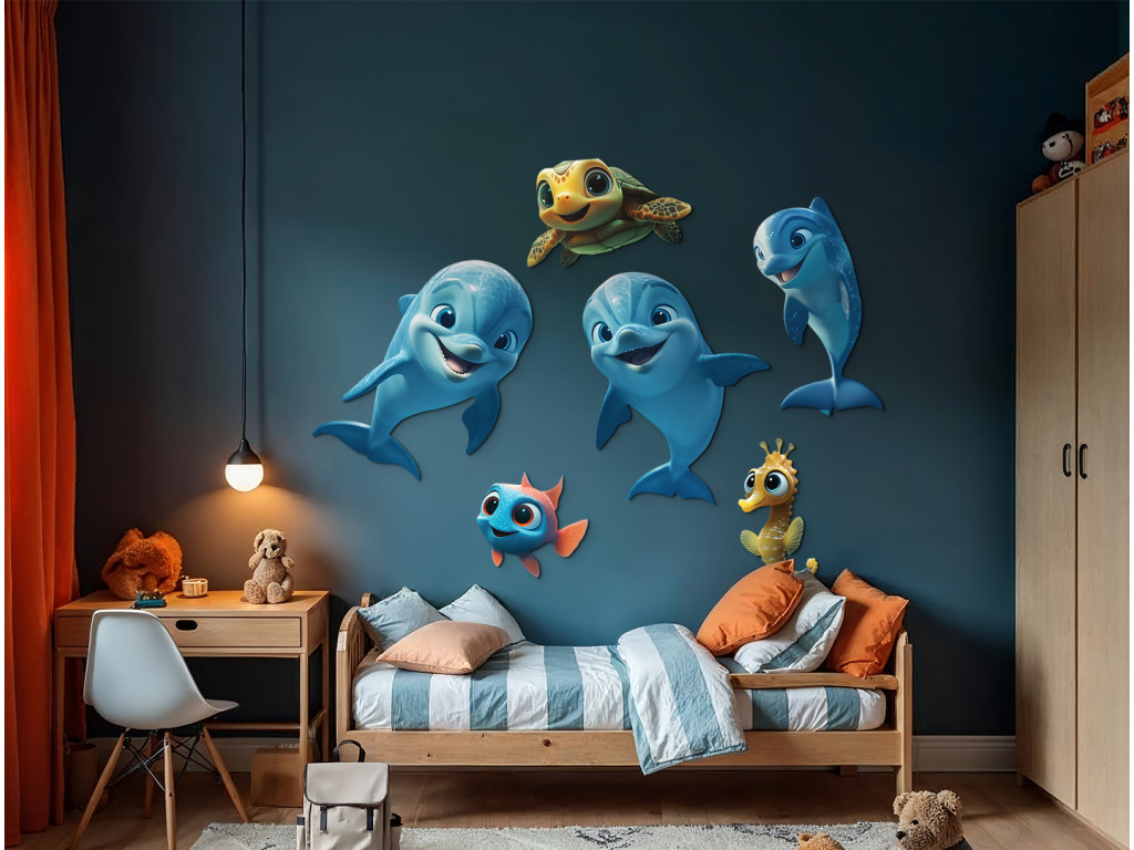 A delfin és a víz alatti barátai egy színekben, örömben és kalandokban gazdag világba invitálják a gyerekeket. Főszerepben mosolygó delfinek, akiket egy zöld tengeri teknős, egy sárga csikóhal és egy nagy szemű narancssárga hal kísér. Ez a vidám fali dekoráció beragyogja bármely gyerekszobát, és fejleszti a gyermeki képzelőerőt.