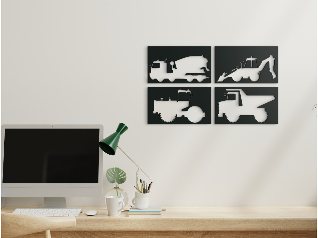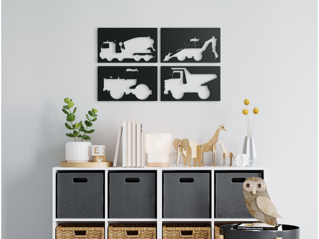 A Teherautókat ábrázoló fakép négy gépet mutat be - egy betonkeverőt, egy traktort, egy úthengert és egy kotrógépet. A fali dekoráció tökéletes minden olyan fiú számára, aki arról álmodik, hogy egyszer ilyen gépeket irányítson.