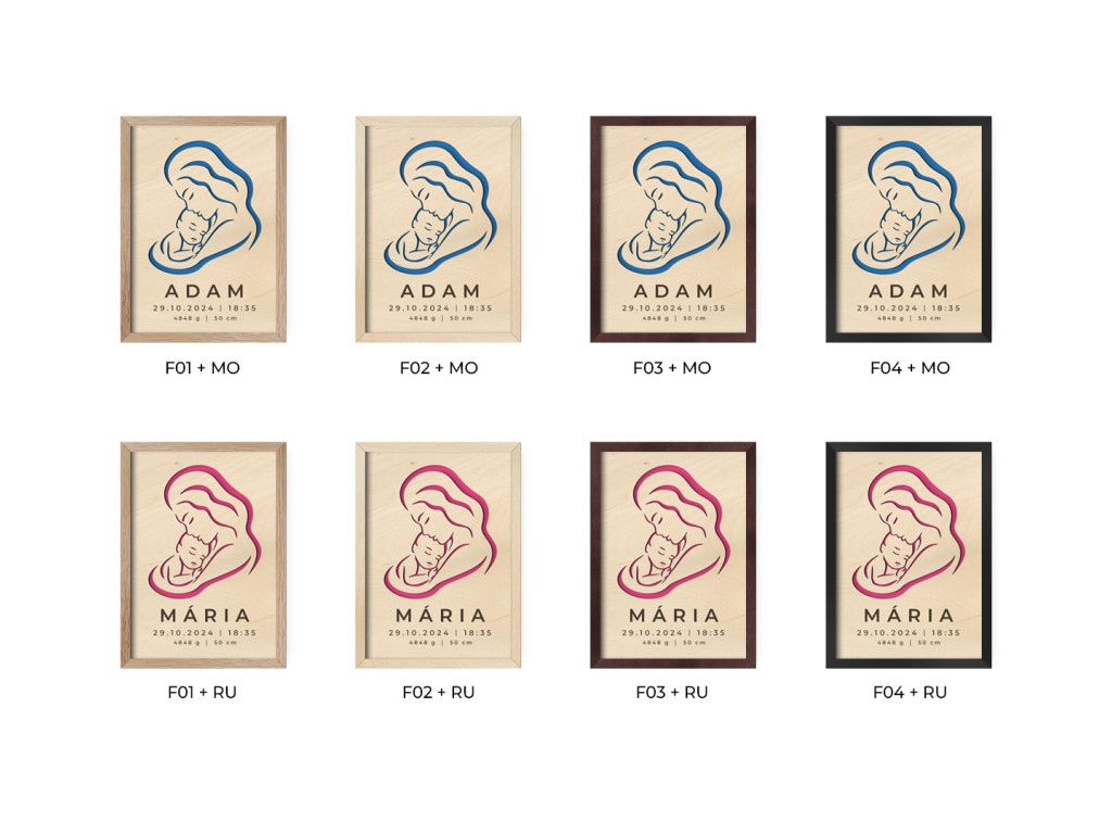 Az élet egyik legszebb pillanatát örökítjük meg egy szép fadíszben, a baba születési adatainak gravírozott részleteivel együtt. A névnek, születési dátumnak és időnek, magasságnak és súlynak nem kell csupán egy egyszerű bejegyzésnek lennie a büszke szülők adatai közt vagy emlékében. Büszkén kiállíthatja őket otthon, és fokozatosan összeállíthatja az egész növekvő család gyűjteményét. Ezenkívül az egyes képek színeit az Ön ízlése szerint választhatja ki.