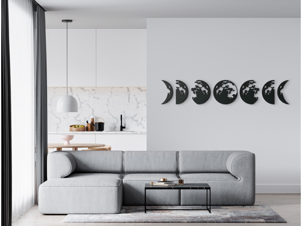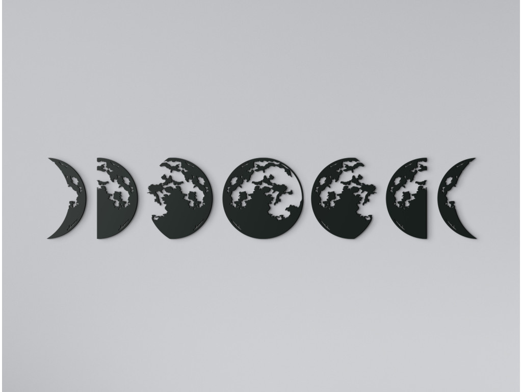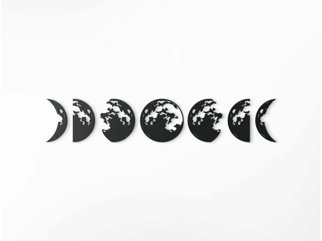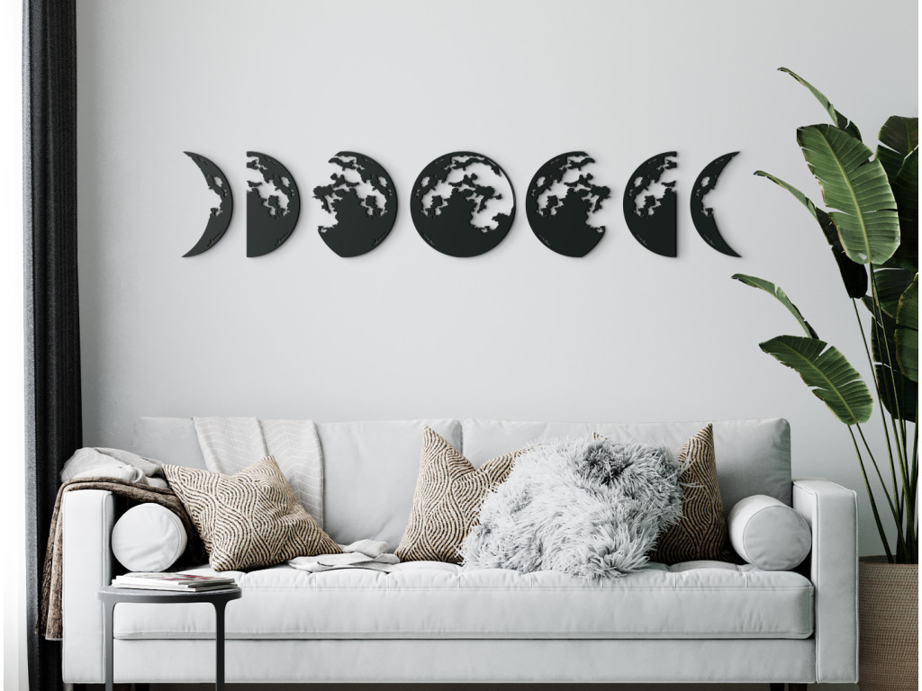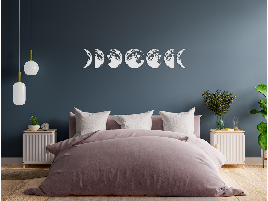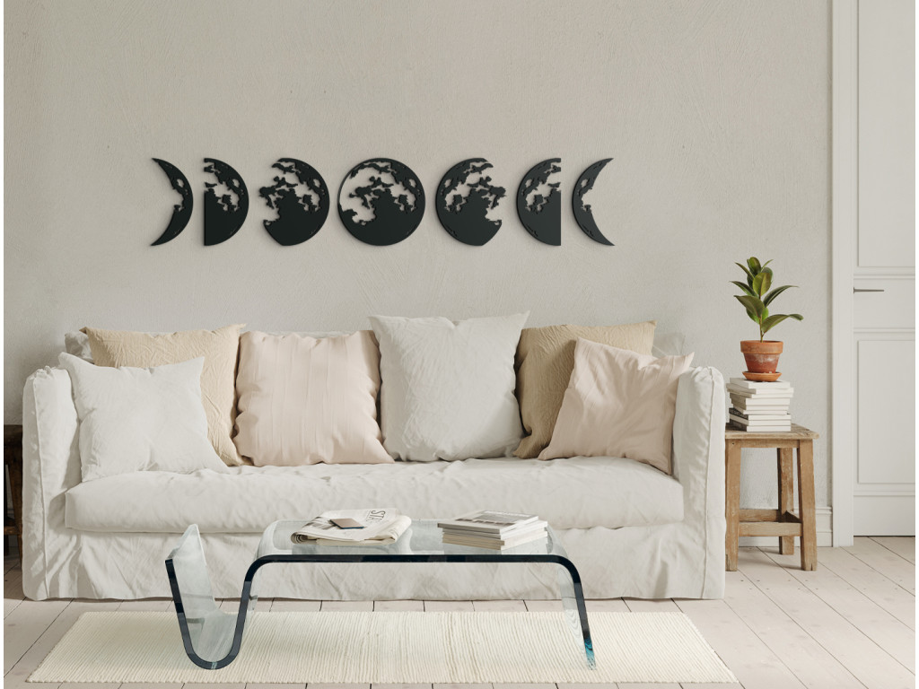A Hold témájú modern matrica minden belső térben megállja a helyét. A dekoráció 7 részre oszlik, amelyek egymáshoz kapcsolódnak és gyönyörű képet alkotnak egy modern nappaliban. Az egyes különálló részeken a holdfázisok vannak ábrázolva.