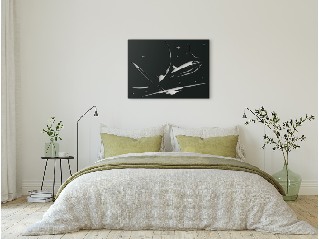 A termék felszerelése egyszerű, és elvégezhető anélkül, hogy a falba kellene fúrni. A dekoráció könnyedén felhelyezhető acélszegek vagy kétoldalas habszalag segítségével (a szerelési anyagokat itt találod). Egyszerűen ragassza a szalagot a termék hátoldalára, majd helyezze fel a dekorációt az előre kijelölt helyre. Bonyolultabb elrendezések esetén sablont is mellékelünk, amely segíti a gyors és pontos felszerelést.