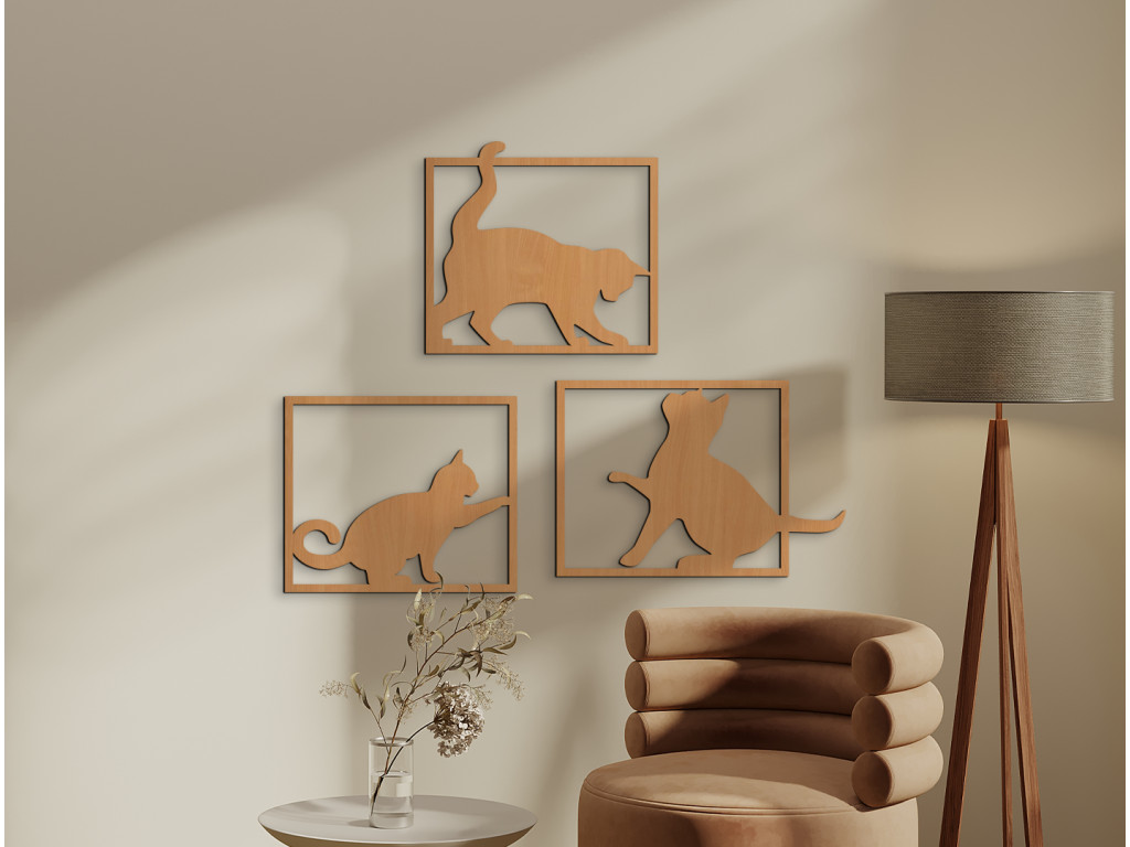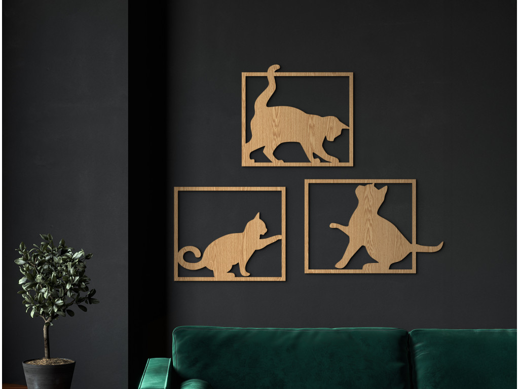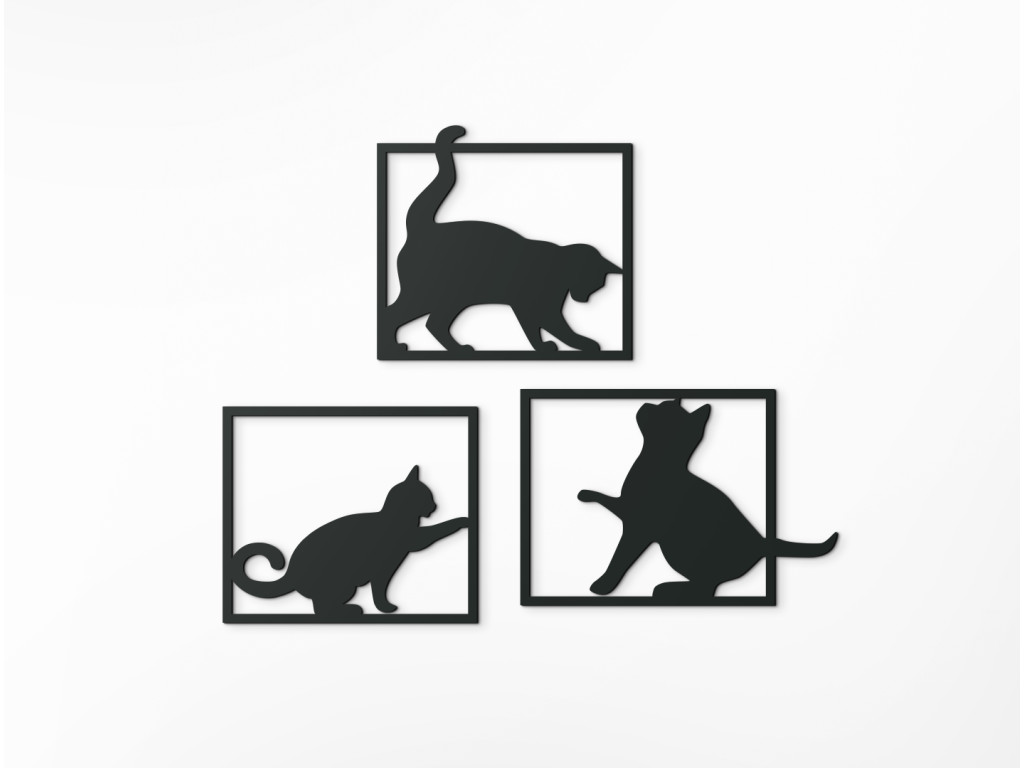 A Három macska kép egy három részből álló dekoráció, amely ötvözi a játékosságot, az eleganciát és a dizájn egyszerűségét. Minden macska más pózban van megörökítve, ami szórakoztató és esztétikus kompozíciót hoz létre. A finoman faragott vonalak modernnek tűnnek, és bájt, valamint otthonosságot kölcsönöznek a térnek. Több szín közül választhat, amelyek tökéletesen illeszkednek az enteriőrjébe.