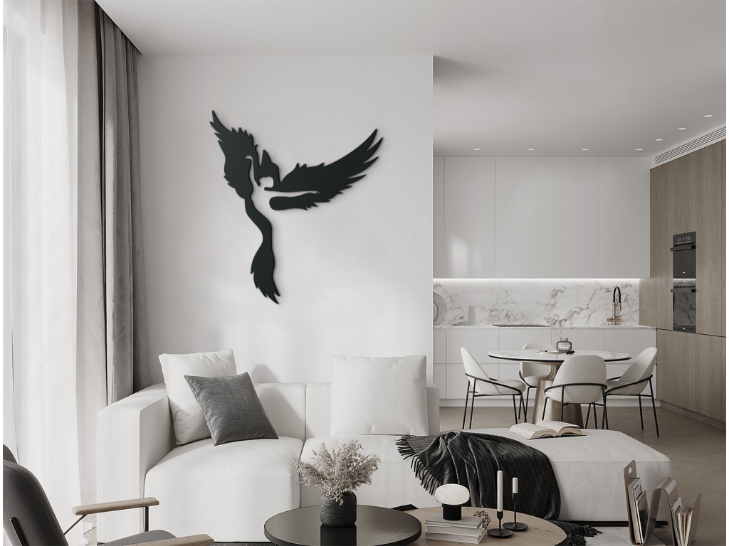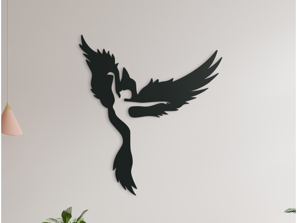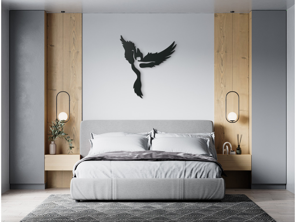 A Repülő galamb modern fali dekoráció varázslatos hangulatot és eleganciát kölcsönöz a belső térnek. A szokatlan dizájn egy galamb elegáns sziluettjét ábrázolja kinyújtott szárnyakkal, középpontjában pedig egy táncos áll kecses balettpozícióban. A fa matricák több színváltozatban is elérhetőek.