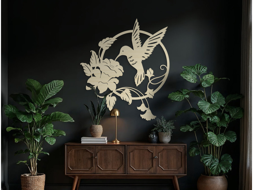 A Kolibri fa faldekoráció egy elegáns kolibrit ábrázol egy virágzó virág közepén. A finom részletek dinamizmust és a természet szépségét kölcsönözik a darabnak. Lenyűgöző kiegészítő, amely feldobja bármely szobát, és egzotikumot kölcsönöz neki.