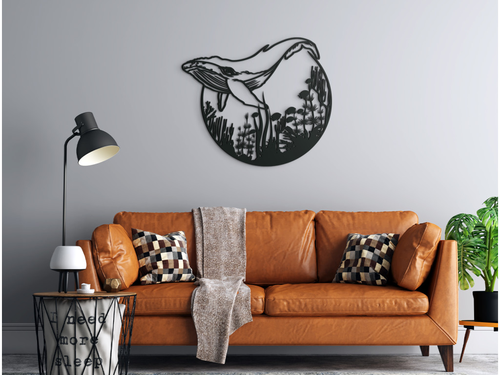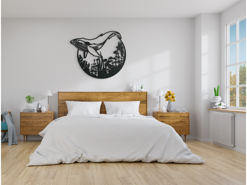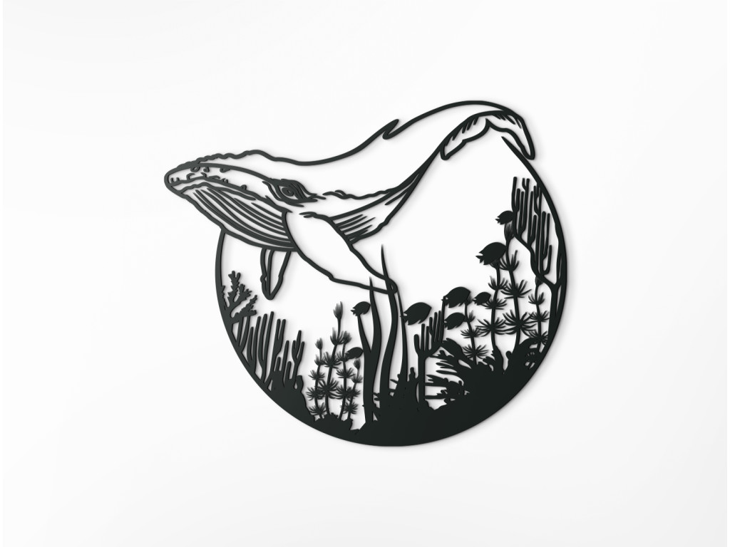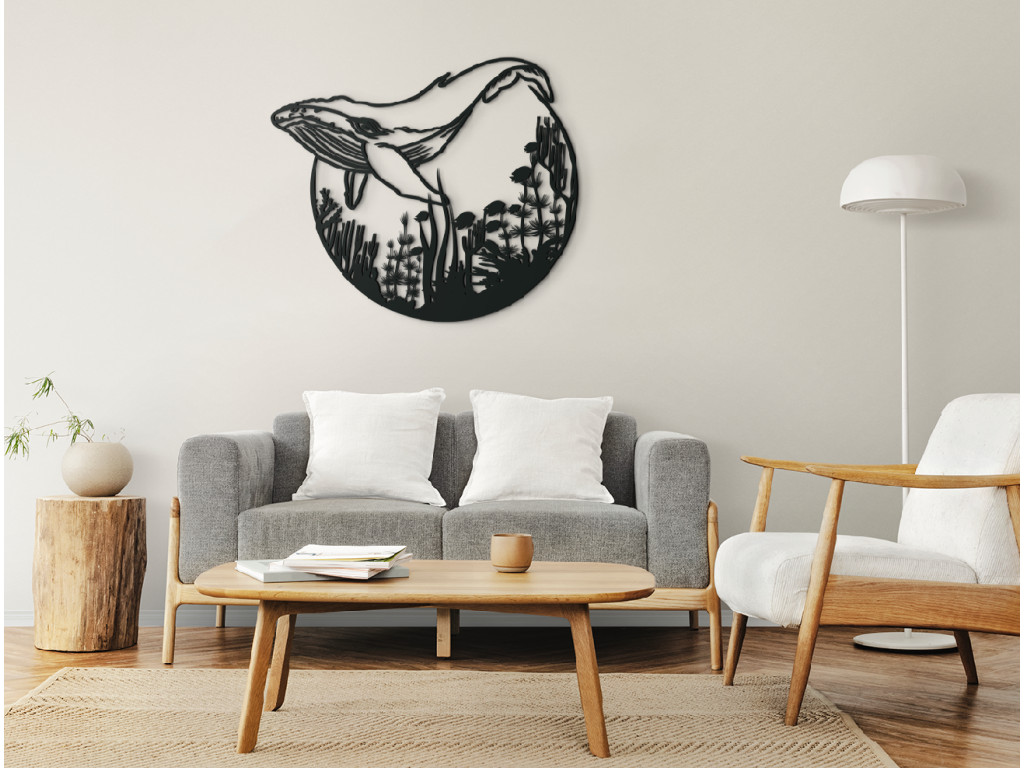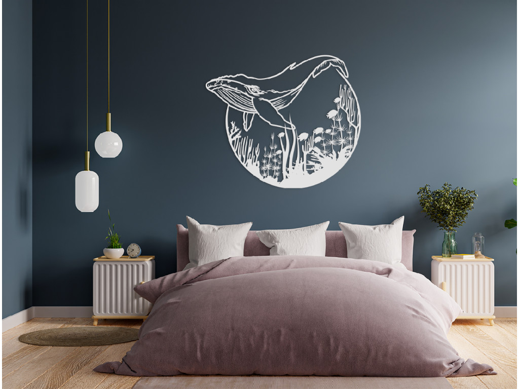 A bálnák a tengerekben és óceánokban élő nagy emlősök közé tartoznak. Ebben a dekorációban egy bálna úszik tengeri növények és kis halak felett. A fakép modern nappaliba, hálószobába, gyerekszobába és előszobába illik. Több szín közül választhat.