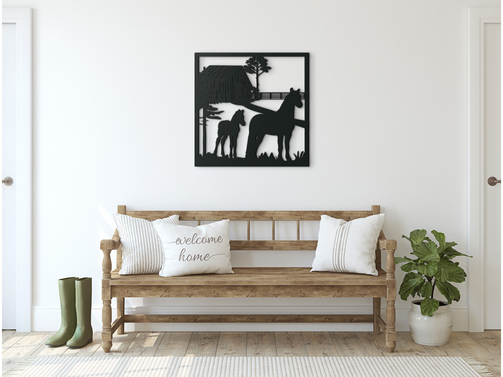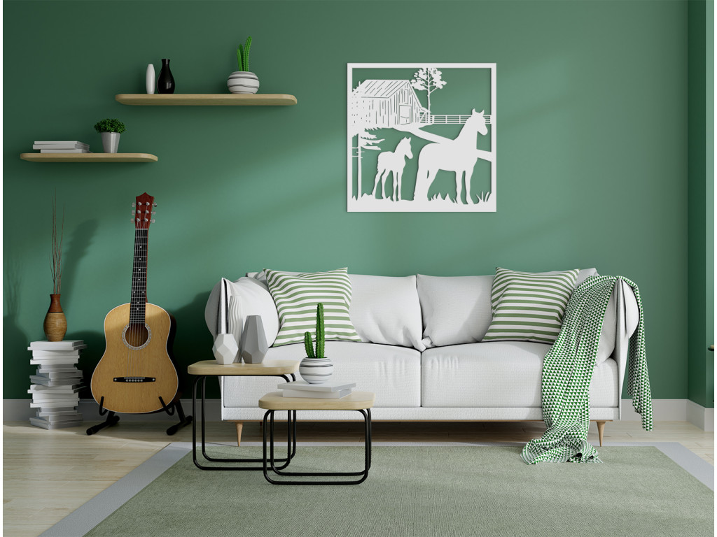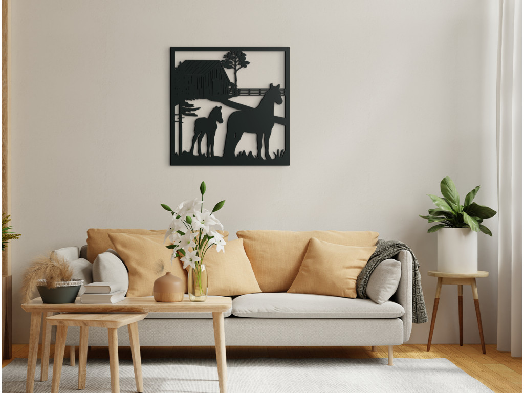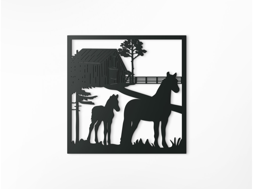 Egy kanca és csikója látványa egyszerűen gyönyörű. Adja meg magának a lehetőséget, hogy élvezze ezt az örömöt, amikor ránéz a képre. Válasszon egy fából készült matricát egy kanca és csikó motívumával, háttérben egy faházzal. A jó közérzet és a biztonság légköre árad a képből.