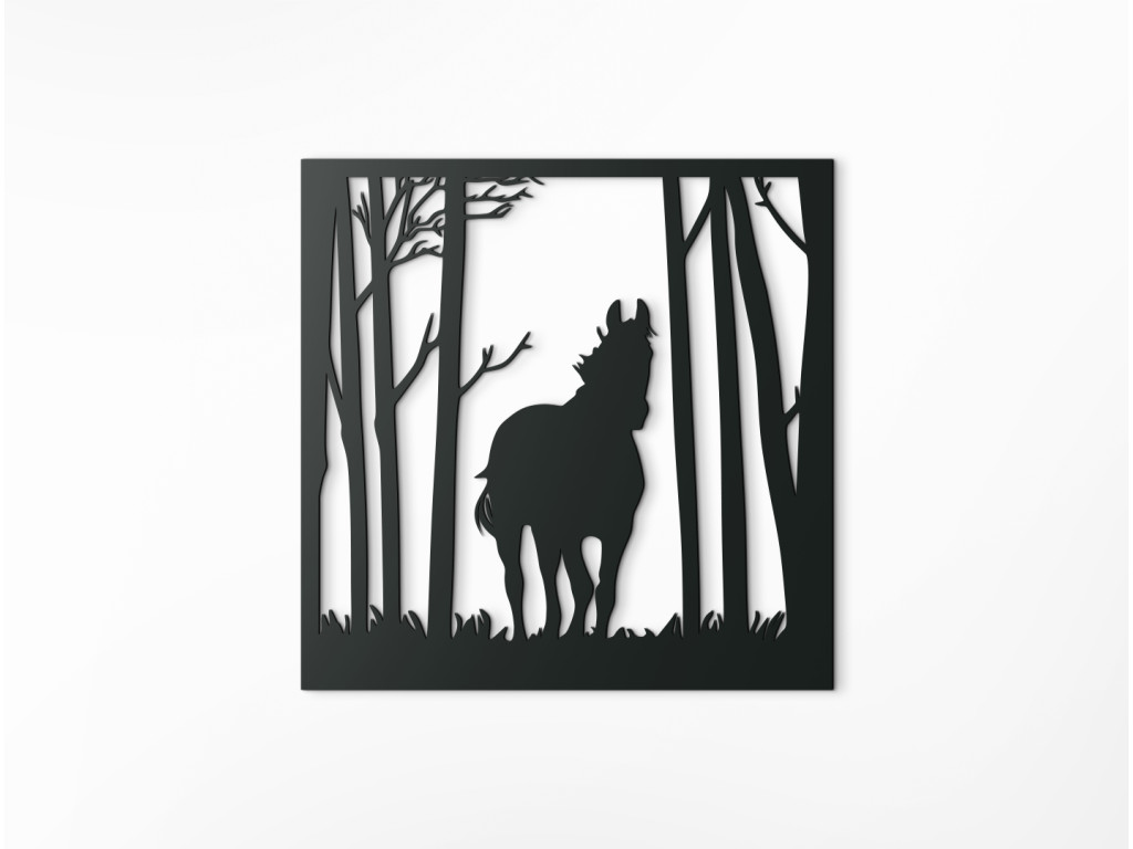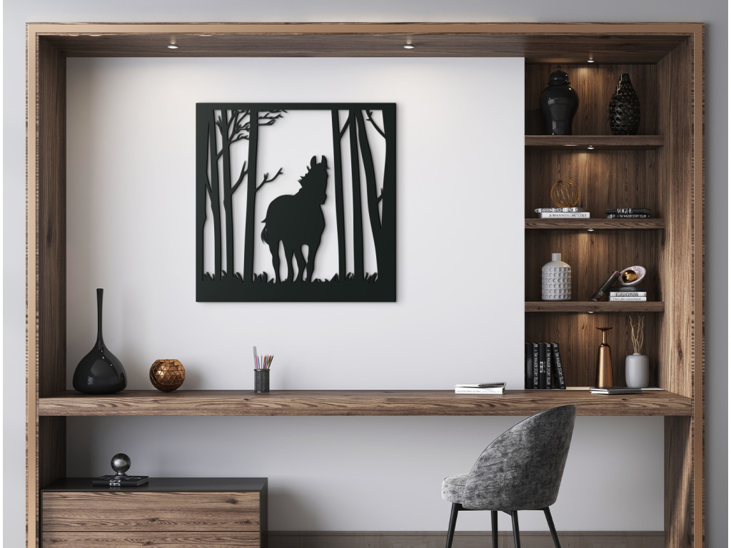A lovat ábrázoló fa matrica ötletes dekorációs kiegészítője minden enteriőrnek. A falon kiemelkedik a nappaliban, a hálószobában, a dolgozószobában és a folyosón. A fa falikép egy lombos erdőben sétáló lovat ábrázol. A divatos és egyben egyszerű kialakítás kiemeli a letisztult vonalakat és a bájos témát.