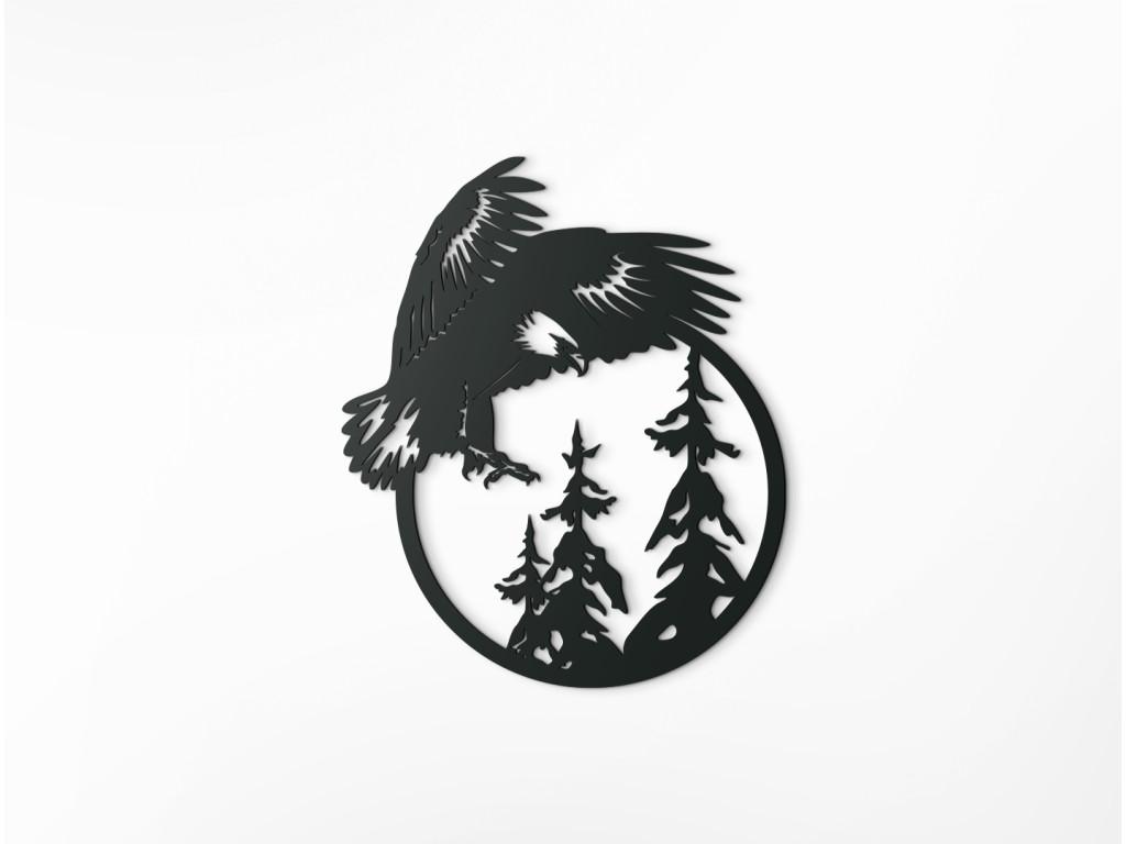 Ragasszon fel egy látványos Támadó sas motívummal ellátott fa matricát nappalija, irodája vagy hálószobája falára. A vad természet lenyűgöző jelenete vitalitást és elemi energiát kölcsönöz minden helyiségnek. A díszítés a leszálló mennyek királyát ábrázolja a támadás pillanatában. A kép hátterét tűlevelű fák alkotják kerek keretben.
