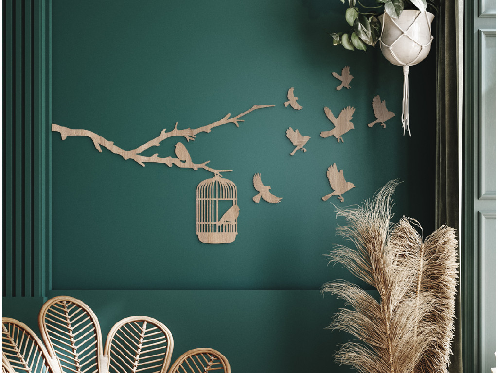 A Madarak szabadon matrica a menekülést és a szabadságot szimbolizálják, mivel egy ágról lógó kalitkából indulnak útjukra. A precíz faragás és a kiváló minőségű faanyag hiteles és természetes megjelenést kölcsönöz a matricának, amely könnyen beilleszthető különféle belső stílusokba. Ez a dekoráció ideális azok számára, akik a szabadság és a természettel való kapcsolat érzését szeretnék otthonukba vagy irodájukba vinni.