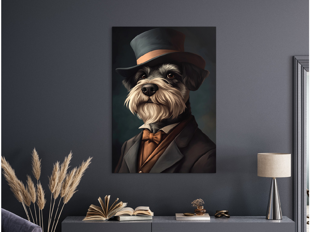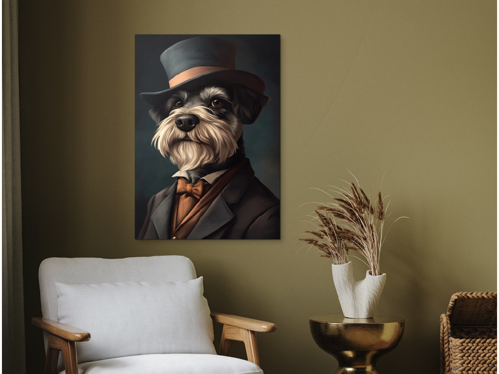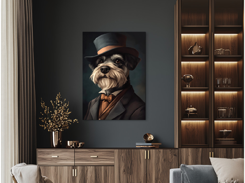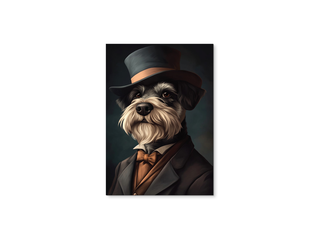 Az Arisztokrata schnauzer egy egyedi portré, amely egy karizmatikus schnauzert ábrázol öltönyben, cilinderben és csokornyakkendőben. Tipikus bajuszos arca és méltóságteljes tekintete tökéletesen illenek az elegáns ruházathoz, nemeslelkű és finom humorral teli képet alkotva. Alkalmas kutyabarátoknak, különösen a schnauzer fajta kedvelőinek, vagy stílusos és eredeti kiegészítője lehet egy modern, kilátással rendelkező enteriőrnek.