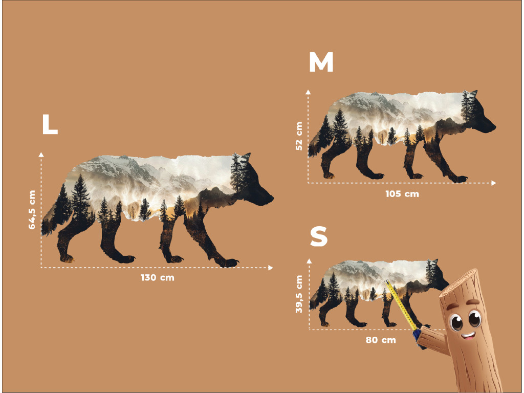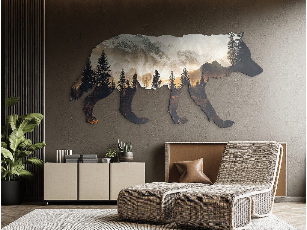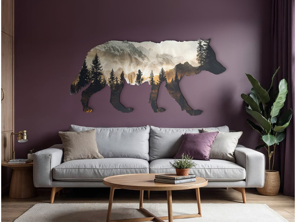 A Farkas horizont falikép művészi illusztrációként egy farkas sziluettjét jeleníti meg, amelyben hegyvidéki táj olvad össze sűrű erdőkkel és hófödte csúcsokkal . A kompozíció lenyűgöző vizuális hatást kelt, összekapcsolva a farkas erejét és vadságát a természet fenségességével . A Farkas horizont falikép a szabadságot, a vadon csendjét és az állat természetes környezetéhez fűződő kapcsolatát idézi fel .
