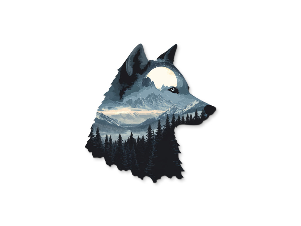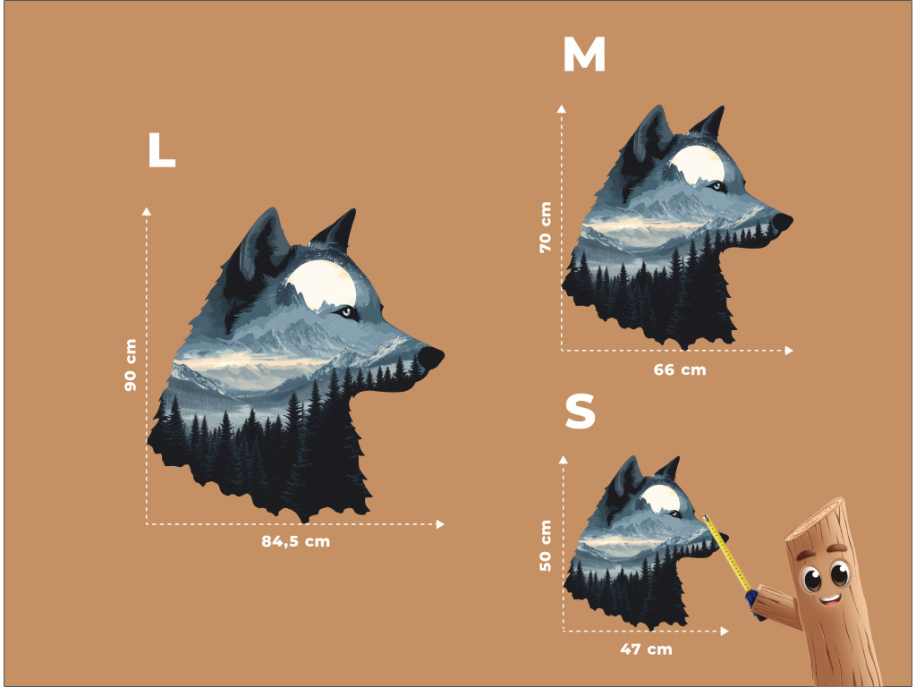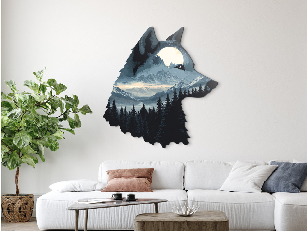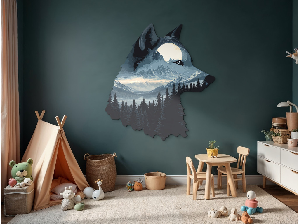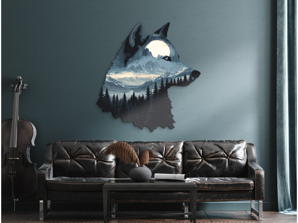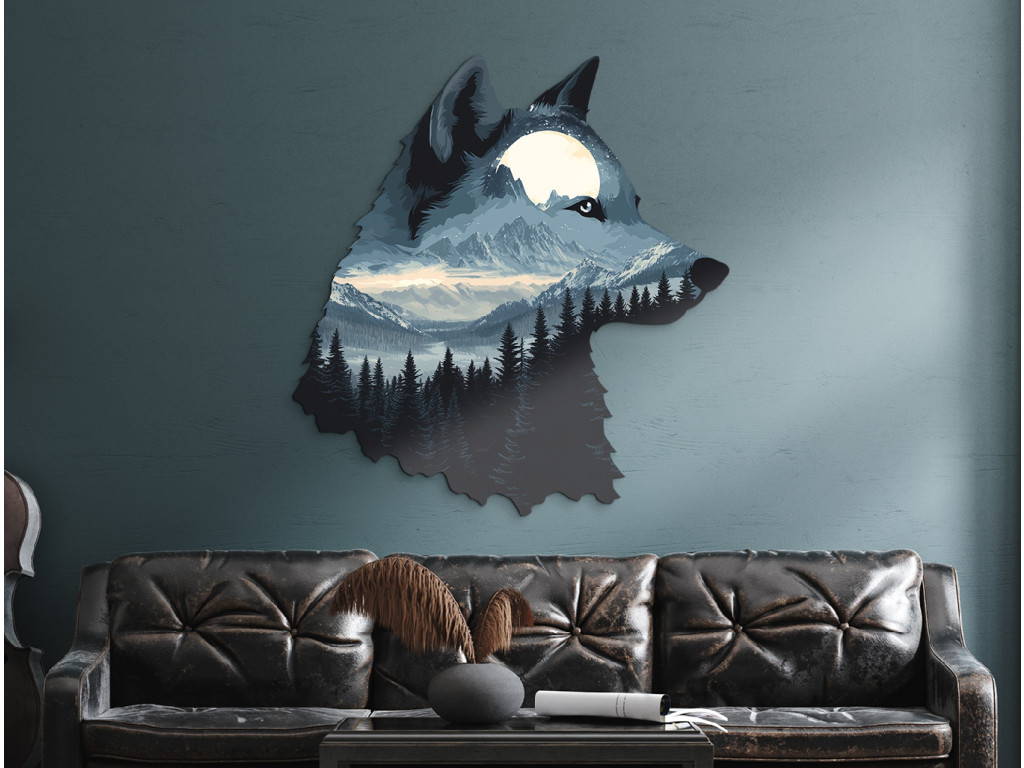 A farkasfejes faldekoráció egy tájképet rejt magában - fenséges hegyeket, sötét erdőket és a felkelő holdat. A farkas természethez kapcsolódó szimbolikája erőteljes vizuális élményt teremt, amely a szabadságot, a vadságot és az éjszakai tájjal való kapcsolatot tükrözi.