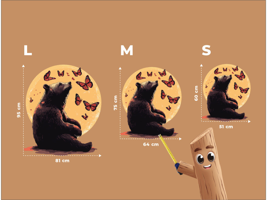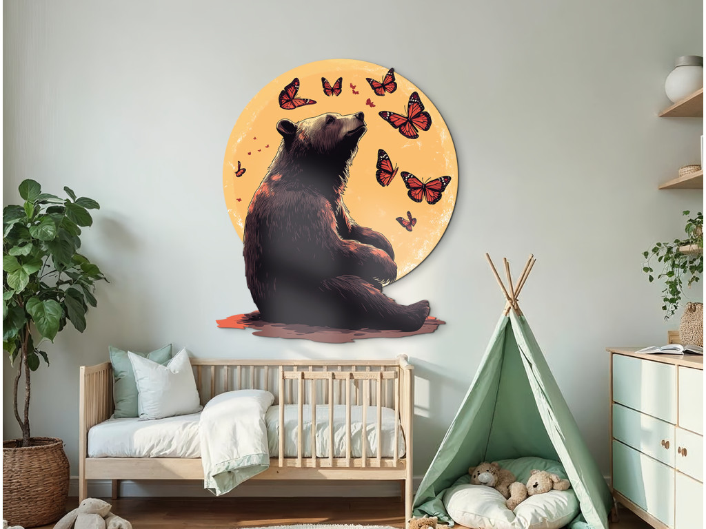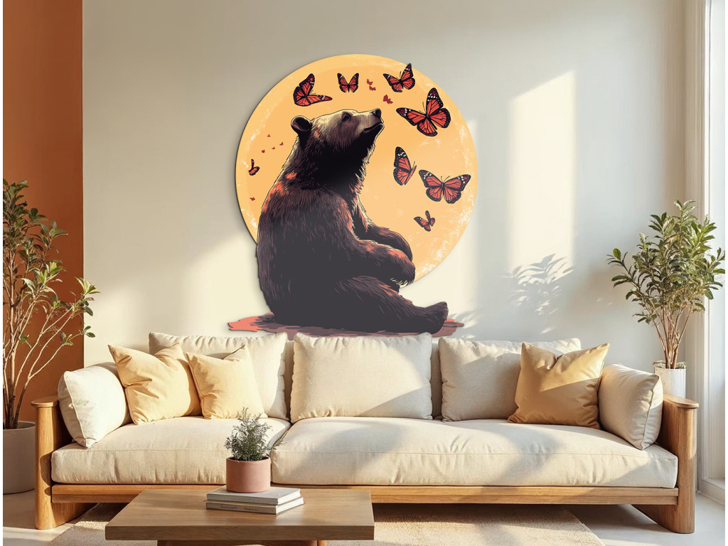 Egy nyugodtan ülő medve ábrázolása, amint egy narancssárga, a napra vagy a holdra emlékeztető körbe néz. Fényében finom pillangók repkednek, mintha némán táncolnának a levegőben. A jelenet varázslatosnak és békésnek hat, ötvözve a természet erejét a részletek finomságával.