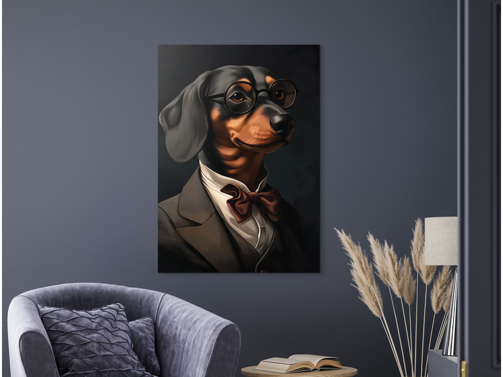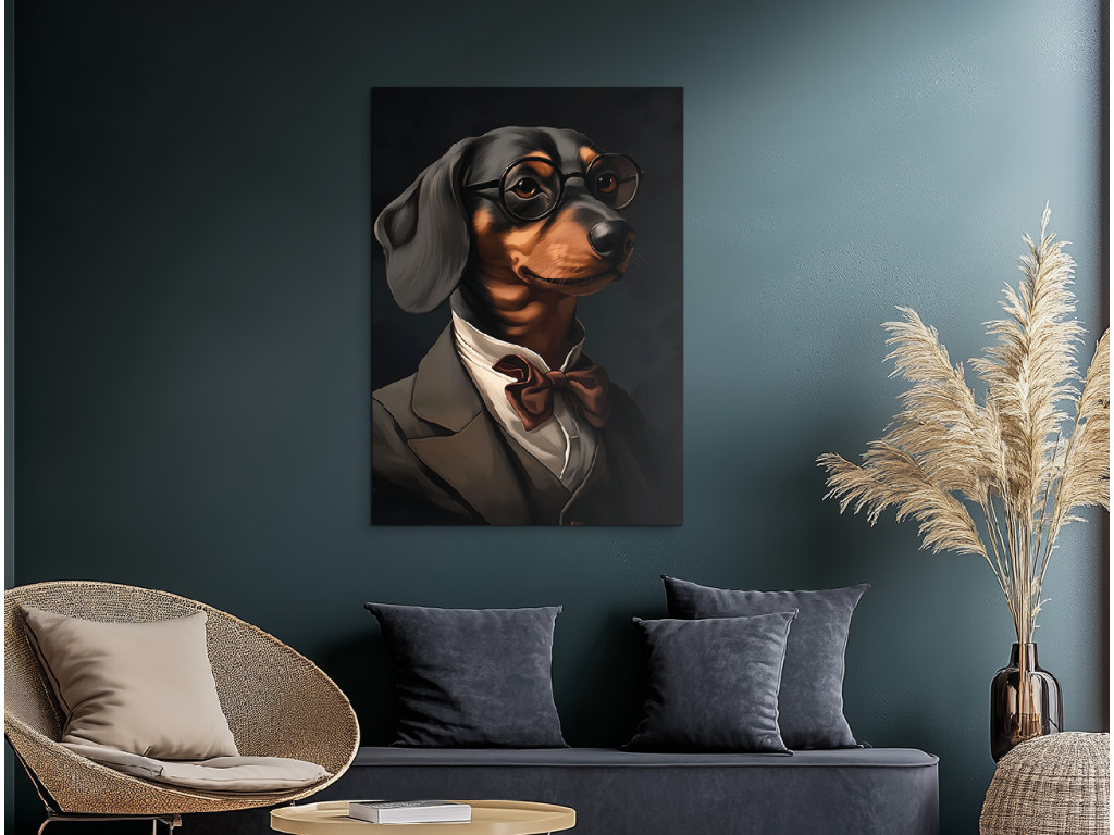 A Tacskó professzor falikép ízlésesen humoros, mégis elegáns portré egy tacskóról, aki idős, markáns véleményű egyetemi professzornak hat. Sötét öltönyben, fehér inggel és bordó csokornyakkendővel, kerek szemüveggel a pofáján bölcsességet, nyugalmat és némi excentricitást sugároz. A valósághű szőr- és arckifejezésábrázolás a sötét háttérrel erős kontrasztban stílusos kiegészítővé teszi könyvtárban, dolgozószobában vagy humoros karakterű terekben.
