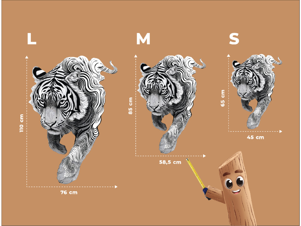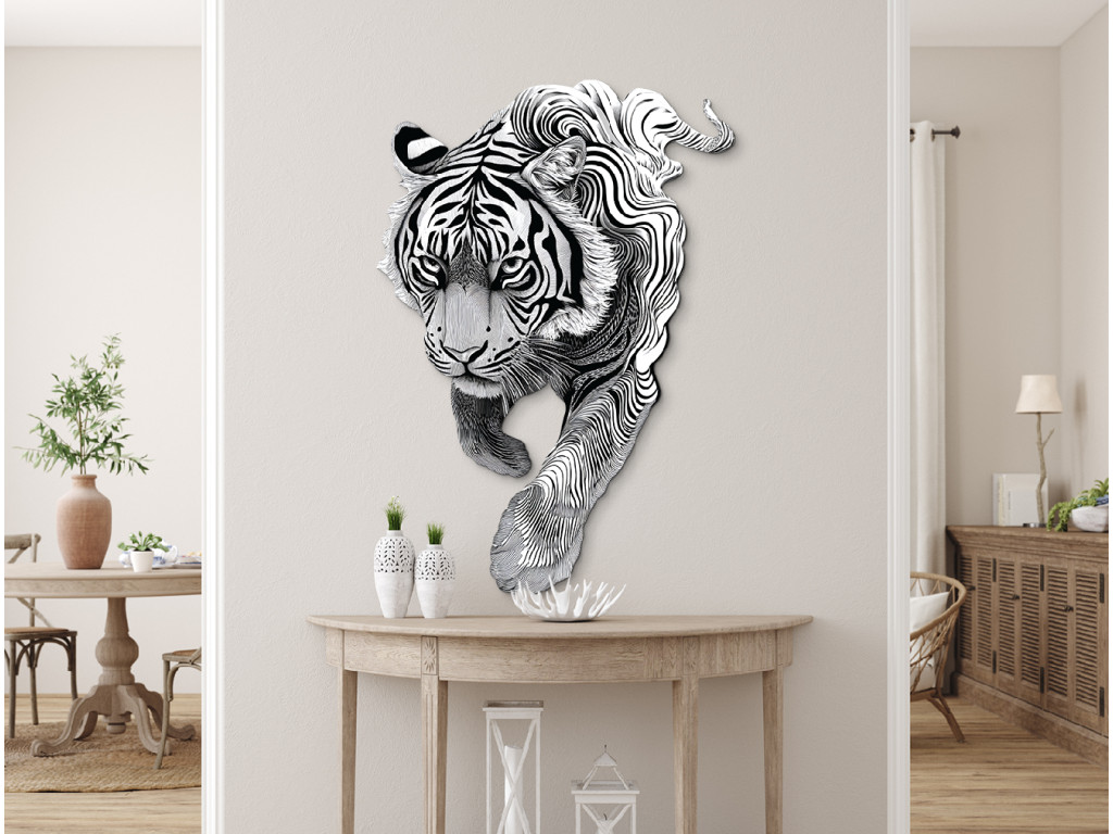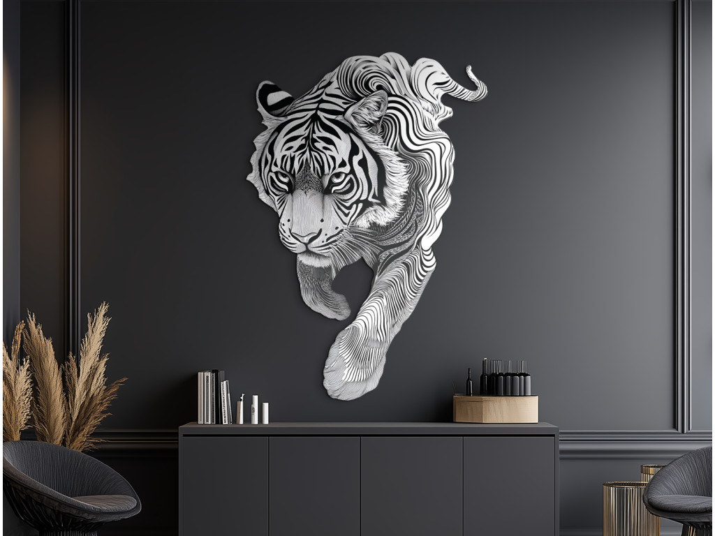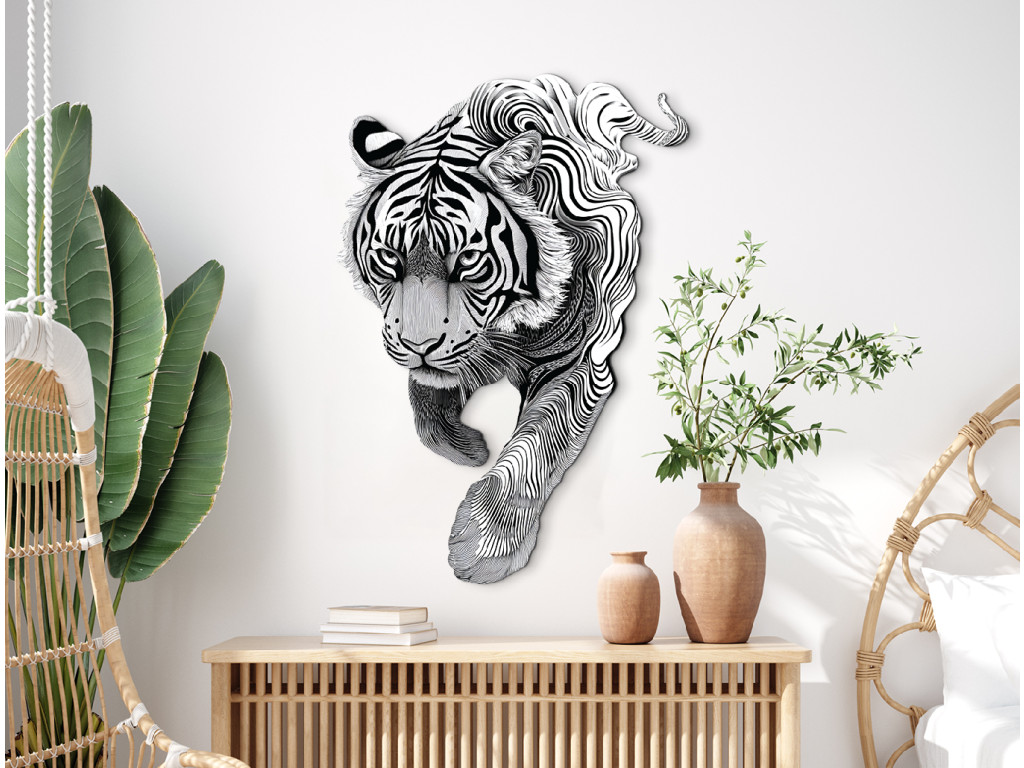 A Tigris falikép fekete-fehér illusztrációként egy lépésben megörökített, méltóságteljes ragadozót mutat, amely lassan és összpontosítva halad előre, elegáns tartással. A fekete csíkok és a fehér szőrzet kontrasztja kiemeli a szerkezet erejét, az eleganciát és a belső nyugalmat. A kompozíció eltökéltséget, csendes tekintélyt és felszabadult energiát áraszt.