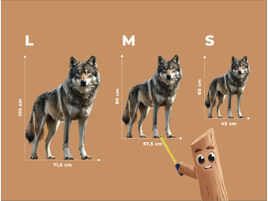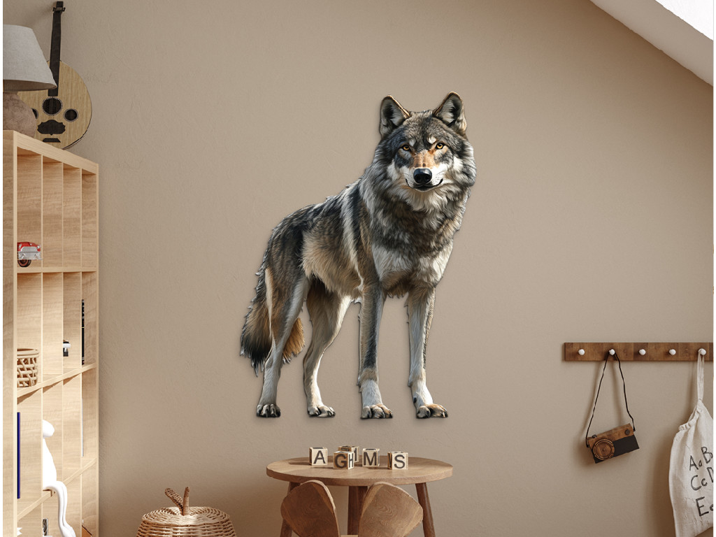 Egy farkas nyugodt tartásban, mintha a körülötte lévő csendet hallgatná. Stabilitása és nyugodt testtartása méltóságot, bölcsességet és a vadonnal való kapcsolatot sugároz. Ez a kép az erő és a béke egyensúlyát szimbolizálja - ideális elem egy olyan enteriőrbe, amely egyszerre harmonikusnak és erősnek kíván tűnni.