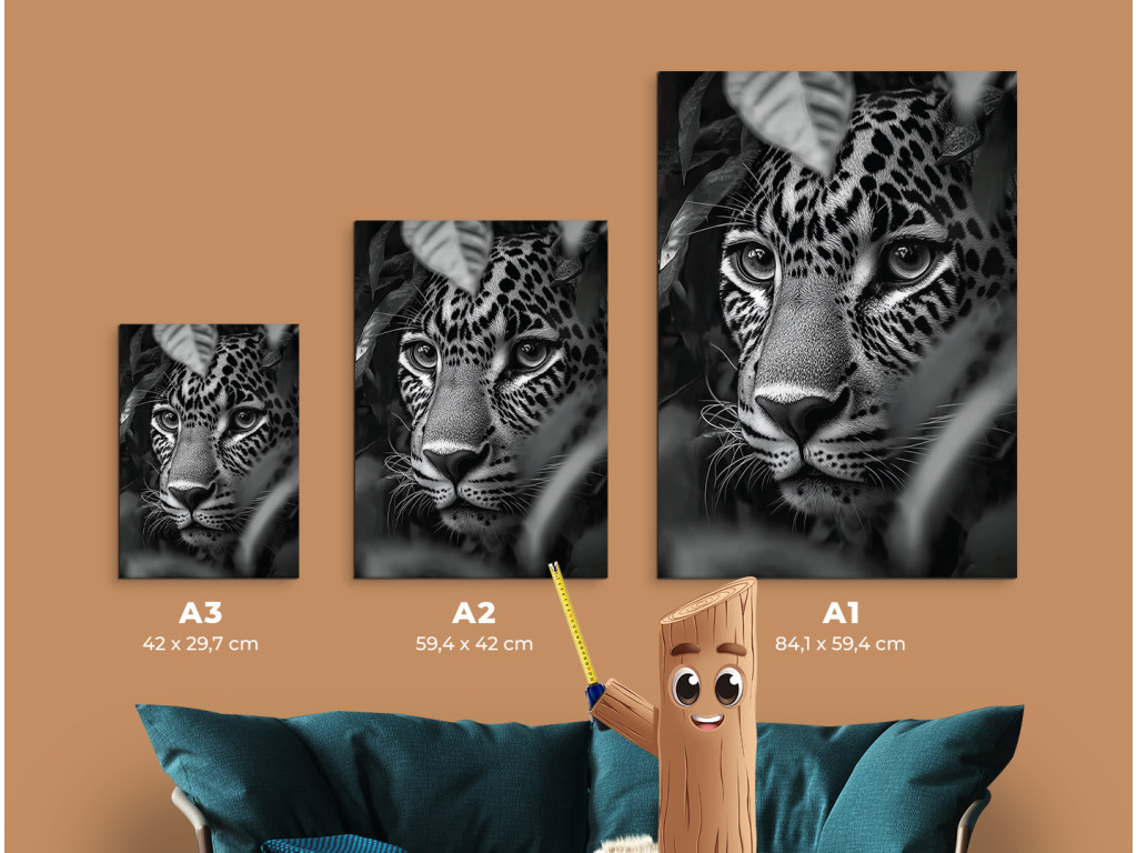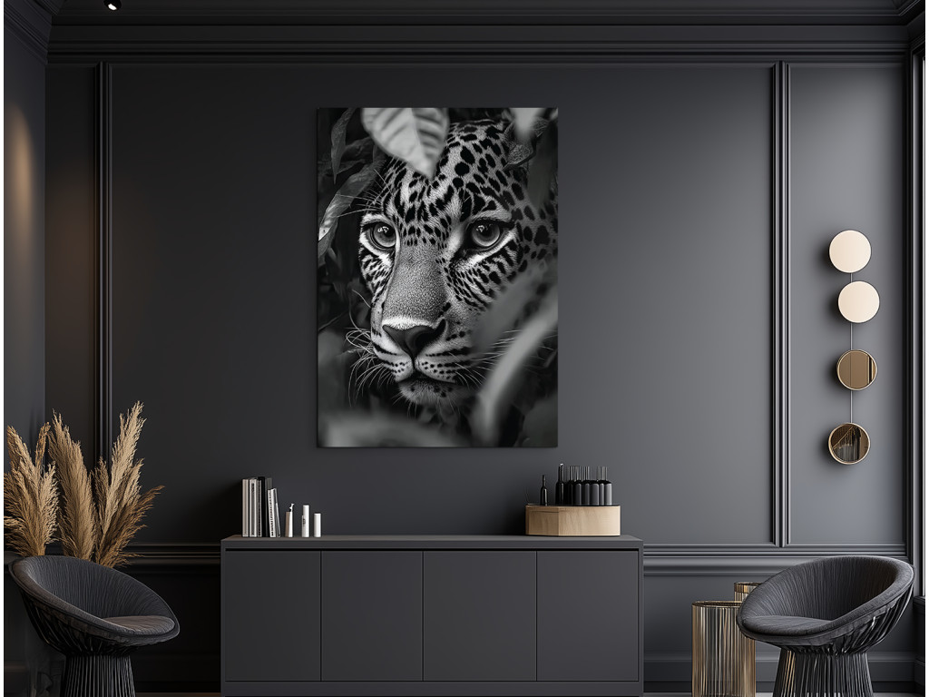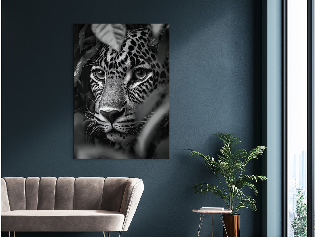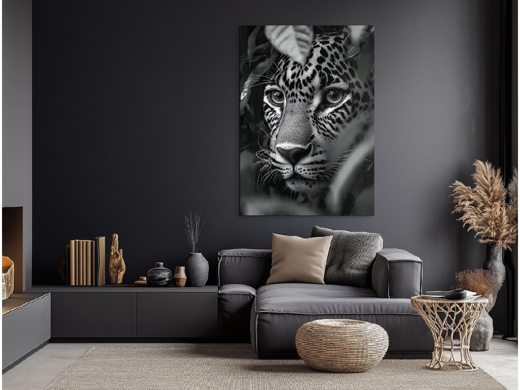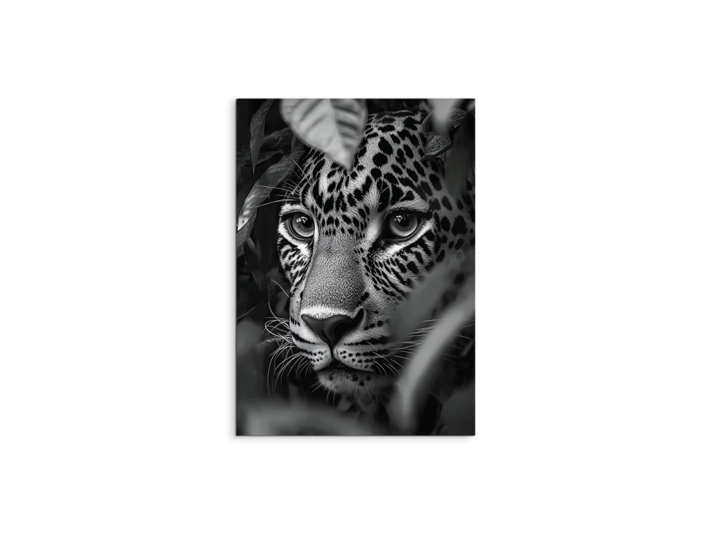 A Vadász árnyéka egy fekete-fehér művészi kép, amely egy intenzív pillanatot ragad meg – egy gepárd fejét, amint rejtekhelyéről üldözi zsákmányát. A fény és árnyék kontrasztja kiemeli a ragadozó tekintetet, a feszültséget és a csendes koncentrációt a támadás előtt. A minimalista, színek nélküli kidolgozás kiemeli a pillanat erejét, és feltűnő kiegészítője a festménynek egy erős hangulatú modern enteriőrben.