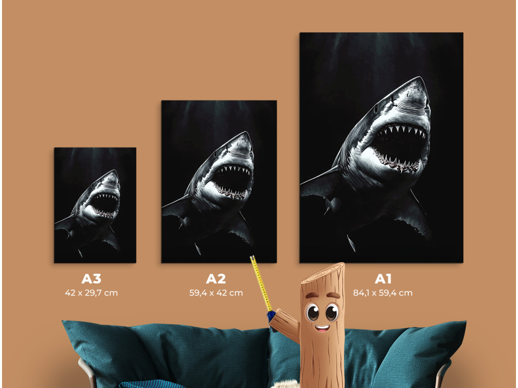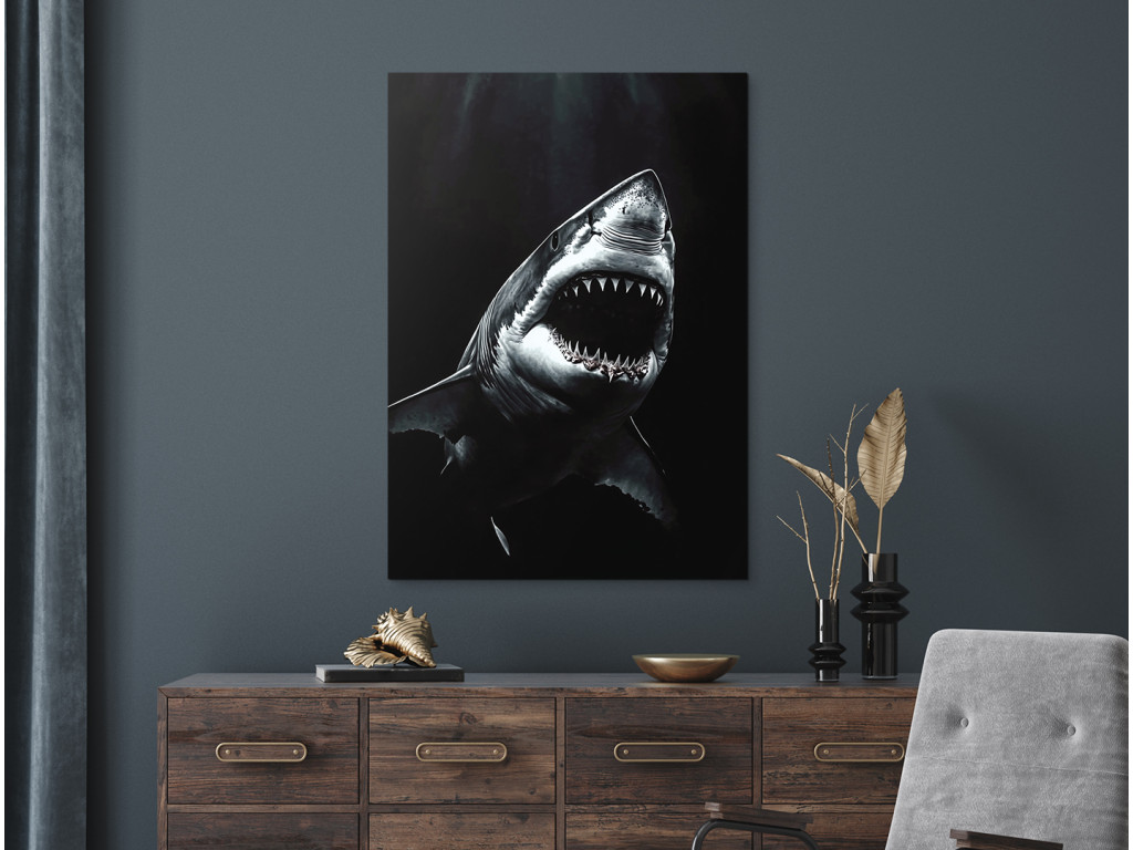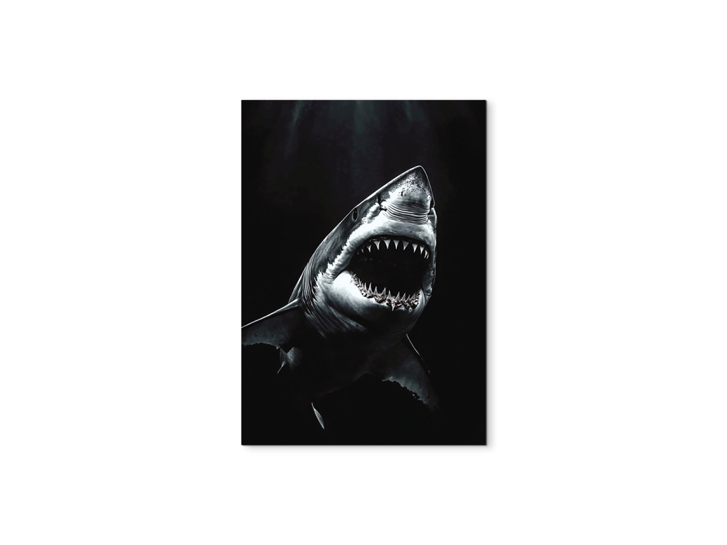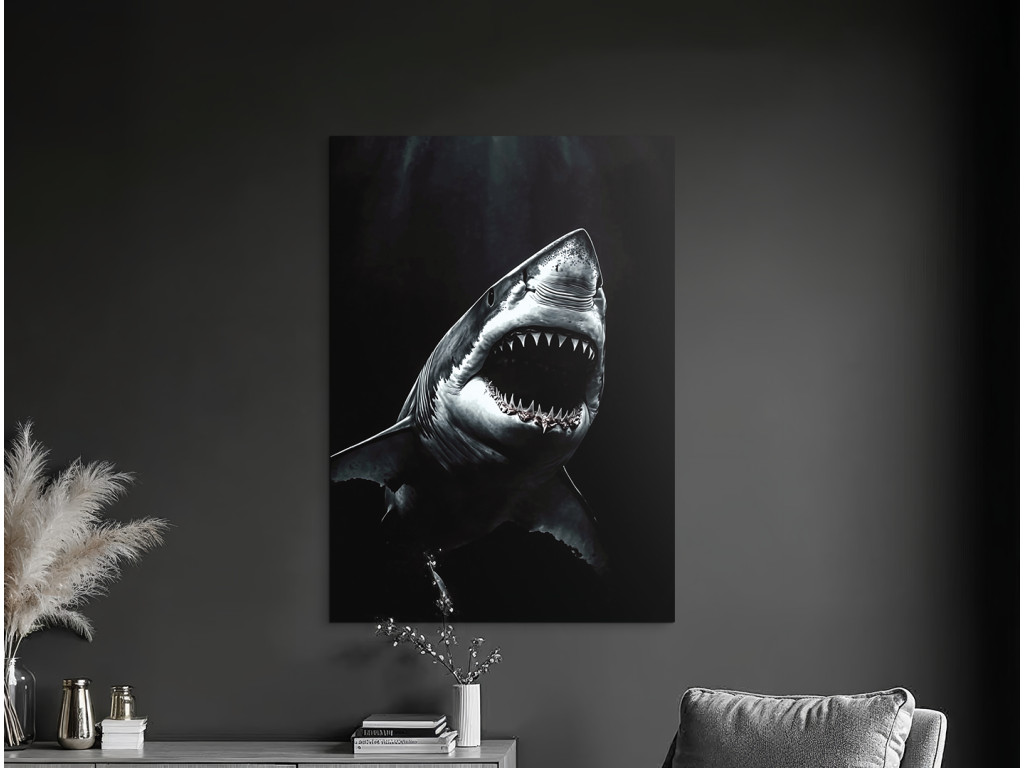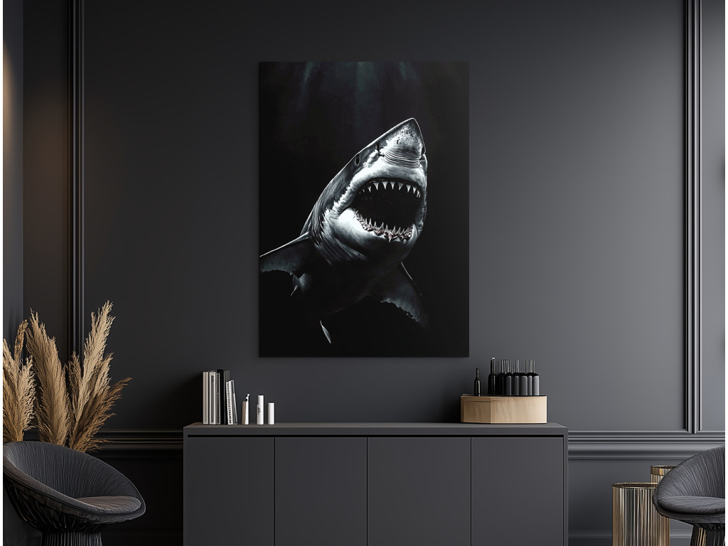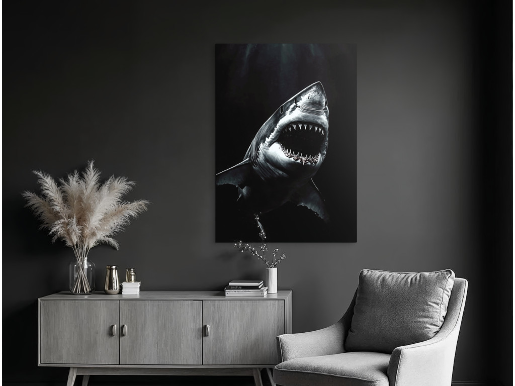 Az Óceán cápája egy feltűnő fekete-fehér festmény, amely egy dinamikus mozgásban lévő, támadásra kész cápát ábrázol. A fény és árnyék kontrasztja kiemeli a nyitott száját és éles fogait, feszültséget és nyers energiát teremtve a víz alatti ragadozó számára. A minimalista színséma a kifejezés erejét hangsúlyozza – a festmény ideális a drámai motívumok és a merész modern művészet szerelmeseinek.