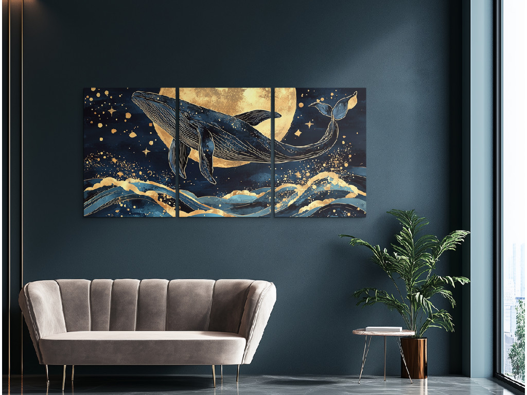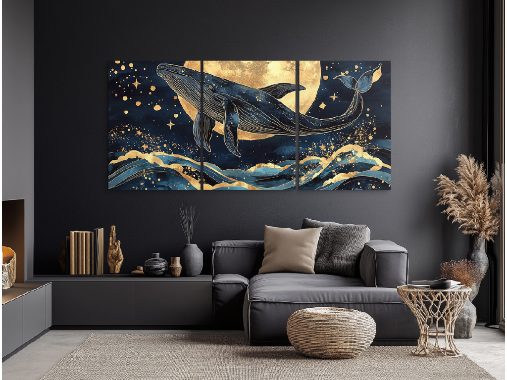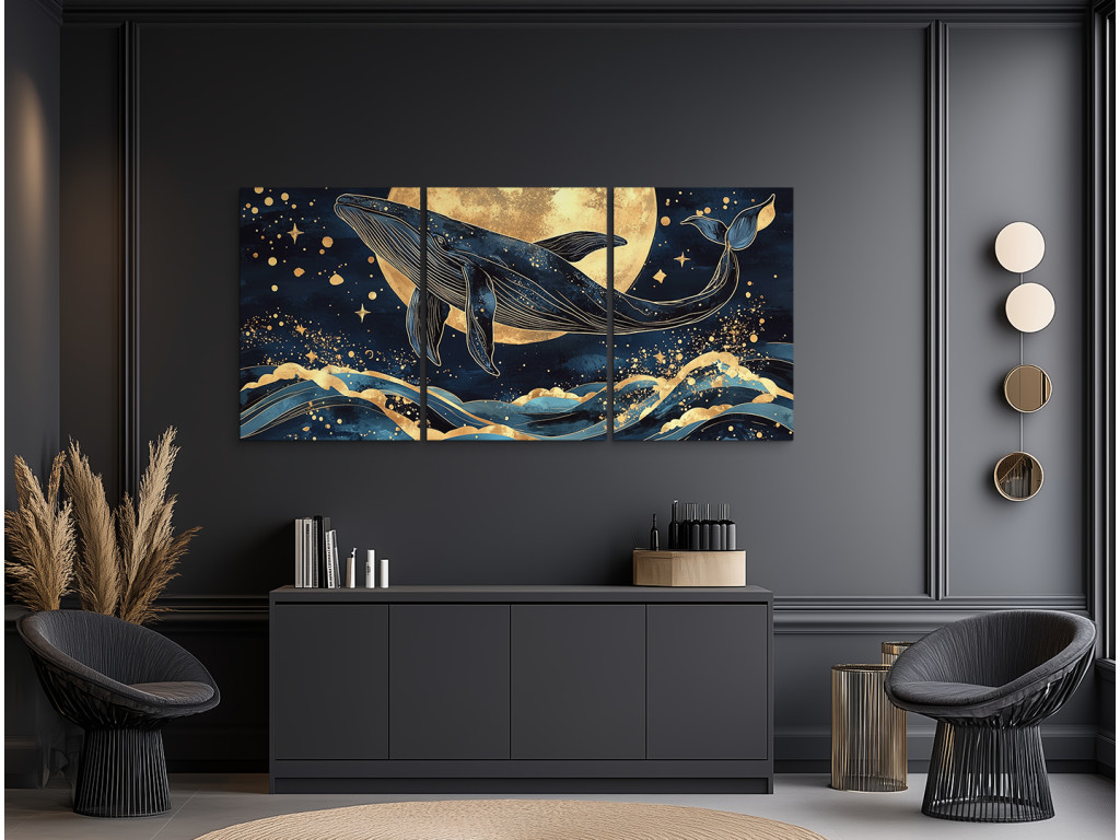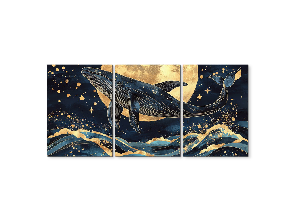 Az Éjszakai óceántánc egy monumentális, háromrészes alkotás, amely a sötét hullámok közül kiemelkedő bálna pillanatát ragadja meg, közvetlenül a ragyogó, aranyló telihold alatt. A mélykék tengerfelszín, a szikrázó csillagos ég és a finom arany csillanások kontrasztot teremtenek a nyugalom és az erő közt, álomszerű, mégis dinamikus hatással.