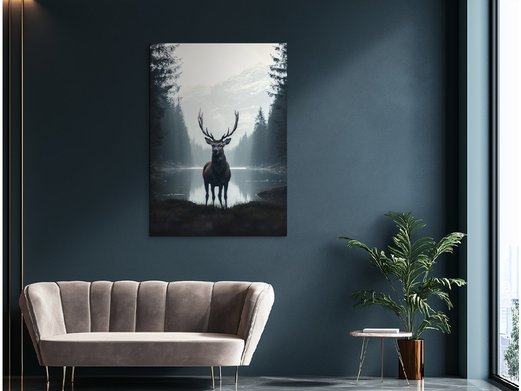 A hideg tó csendje kép realista megközelítésben mutat egy hatalmas szarvast az előtérben, egy csendes, hűvös tó partján, természet ölelésében, ahol a víztükör, a finom fény és a részletgazdag rajz valódi jelenlétet és harmóniát teremt. A mű nyugodt, mégis erőteljes – ideális azokba az enteriőrökbe, amelyek a vad természet közelségét és az északi tájak békéjét keresik.