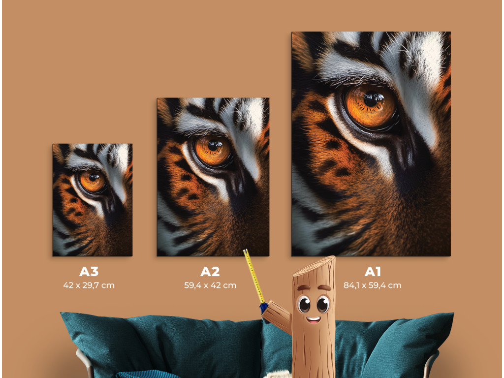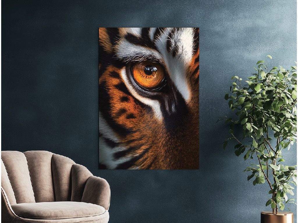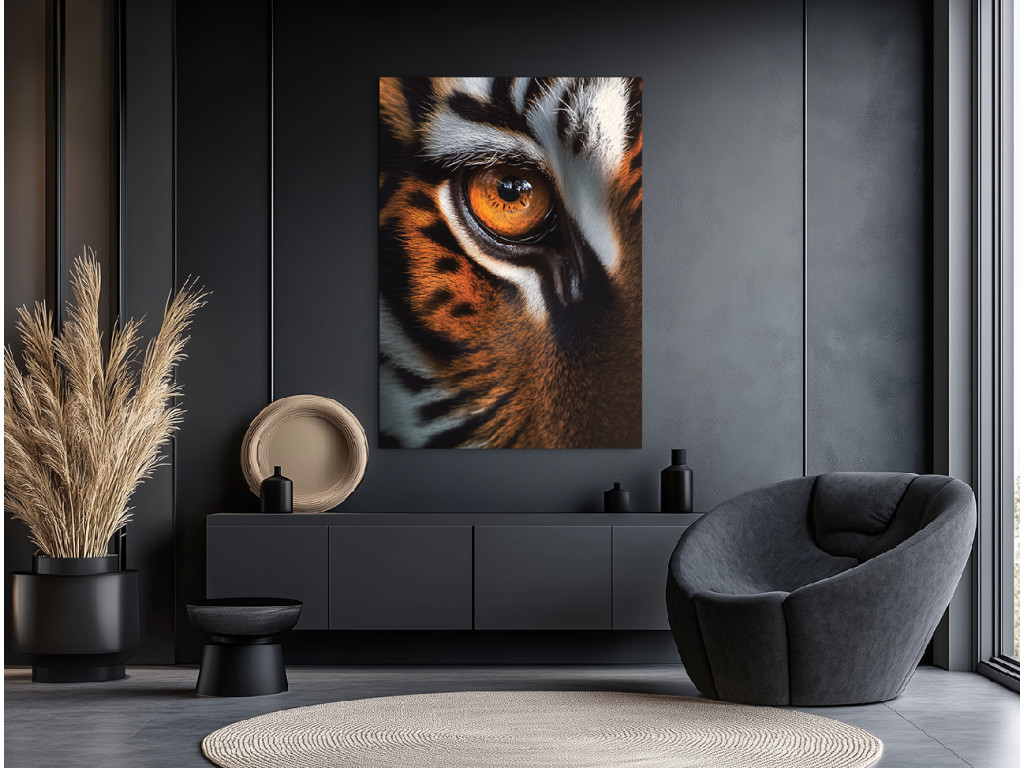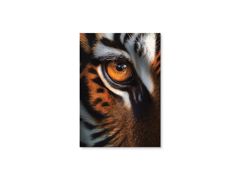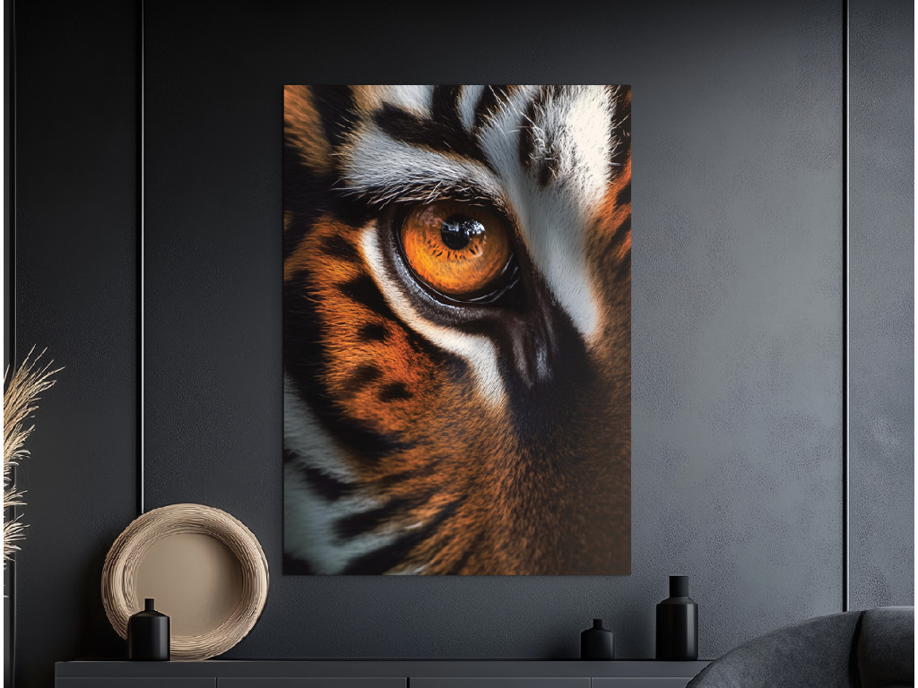 A tigris szeme kép feszültséggel és összpontosított energiával teli alkotás. Egy ragadozó intenzív tekintetét ragadja meg – a pontos pillanatot, amikor az idő megáll, és a természet egyetlen, átható szemen keresztül figyel. A szőrzet, a bőr textúrájának részletei és a pupilla csillogása olyan erős vizuális élményt teremtenek, amely egyszerre hat figyelmeztetésként és lenyűgöző látványként. Ideális kép azok számára, akik az erő, az intuíció és az elszántság szimbólumait keresik.