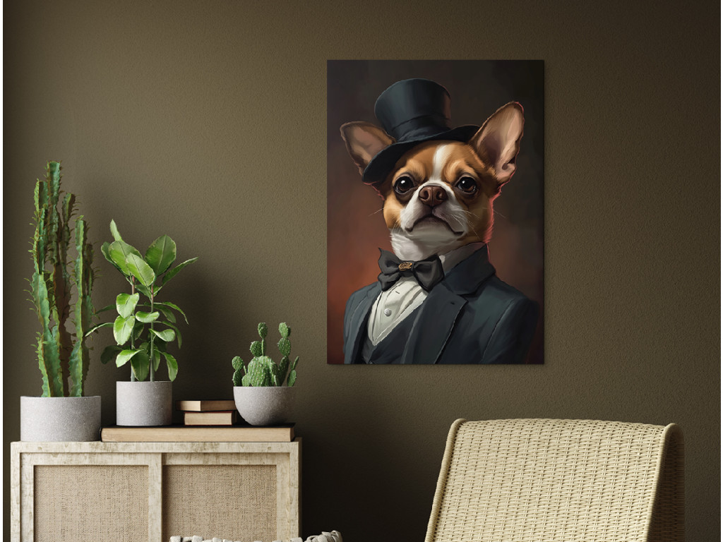 A Csivava úriember egy vicces és stílusos festmény, amely egy elegáns öltönyben és cilinderben lévő csivavát ábrázol. A realisztikus kidolgozás humorral ötvözve egy eredeti darabot hoz létre, amely feldob bármilyen belső teret és mosolyt csal az arcokra. A festmény ideális kutyabarátoknak, különösen a csivavák szerelmeseinek, vagy azoknak, akik személyiséget, éleslátást és művészi bájt szeretnének vinni otthonukba.