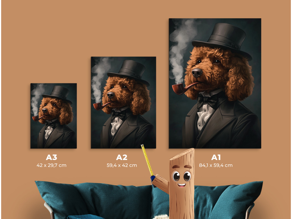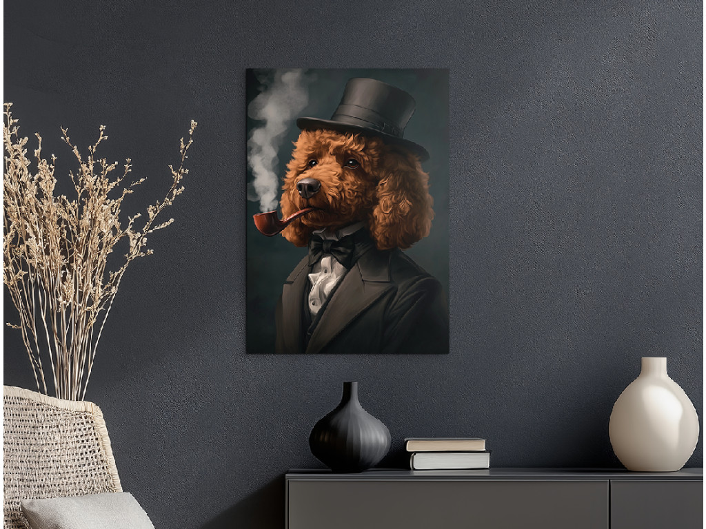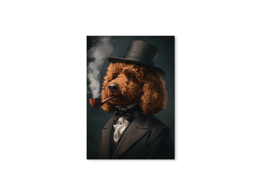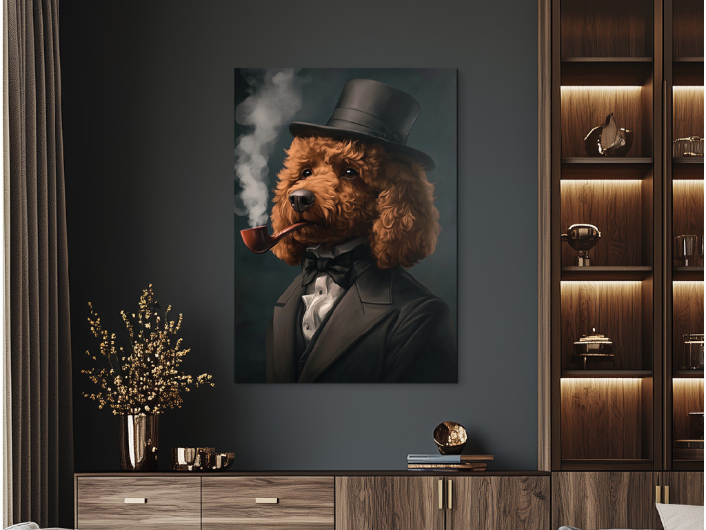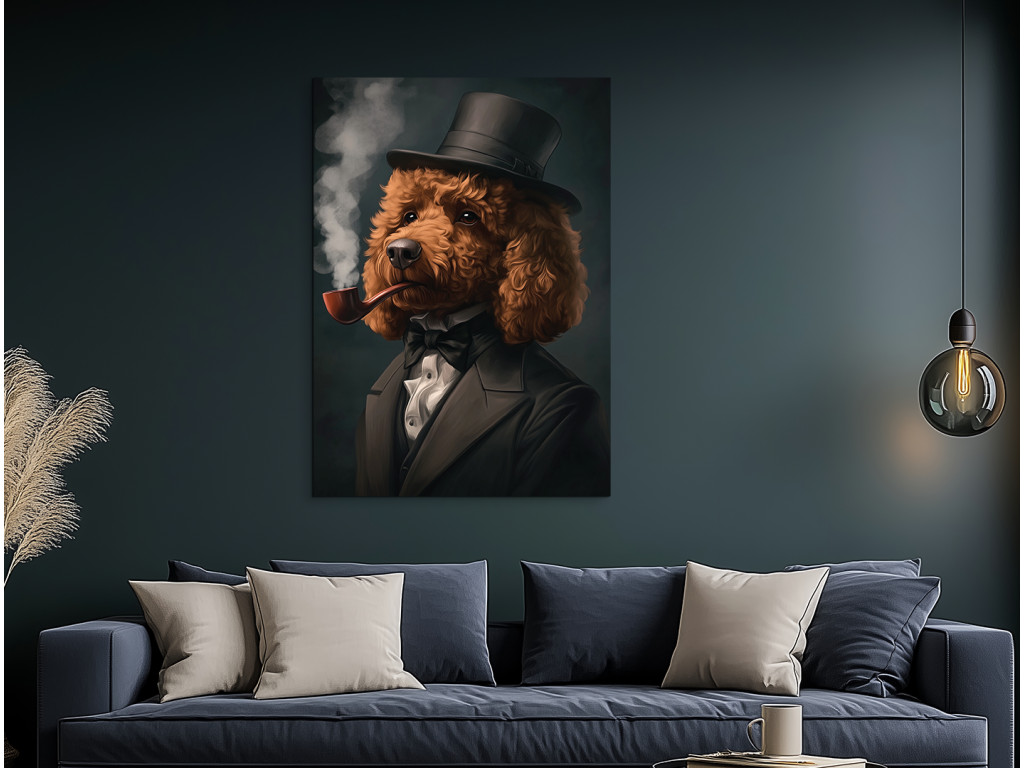 Az Elegáns uszkár egy bájos portré egy háziállatról, egy csipetnyi eleganciával és humorral megáldva. Ez a stílusosan öltözött, cilinderes, csokornyakkendős és pipás uszkár egy előkelő, régi vágású úriembert ábrázol, aki nem szűkölködik sem a stílusban, sem a jó modorban. Lágy füstjével és elegáns arckifejezésével a festmény egyszerre kifinomultnak és vidámnak tűnik - ideális kiegészítője egy olyan enteriőrnek, ahol az állatok szeretete a humorérzékkel és a művészettel párosul.