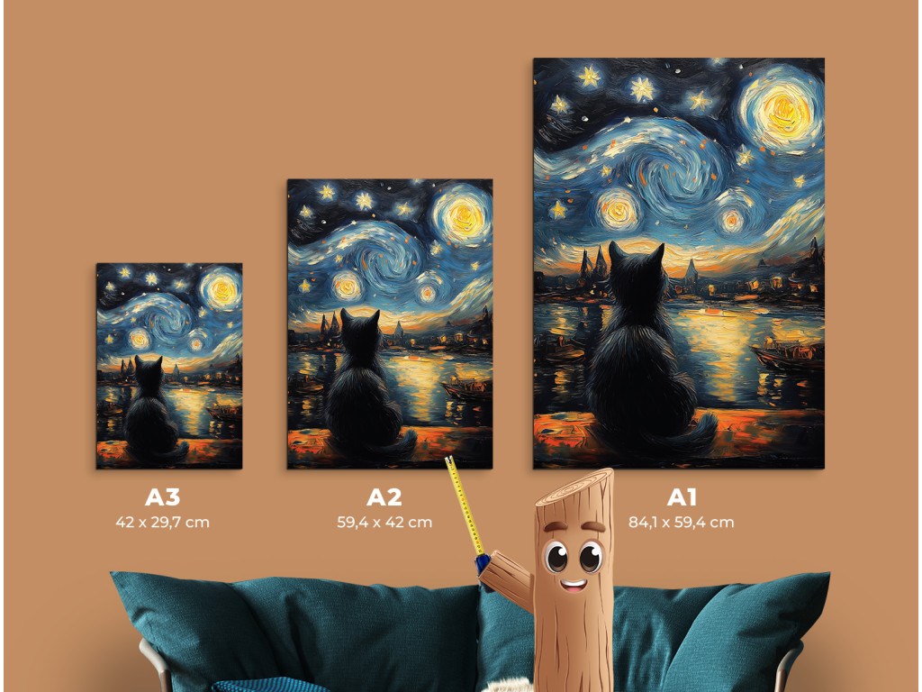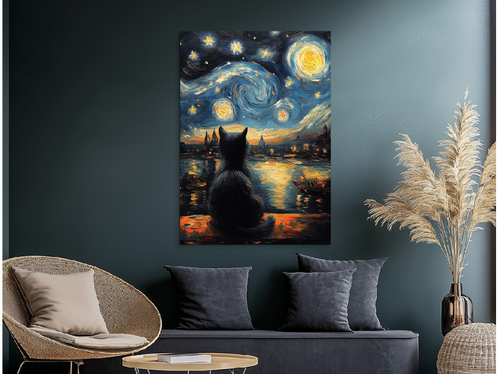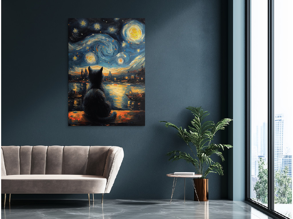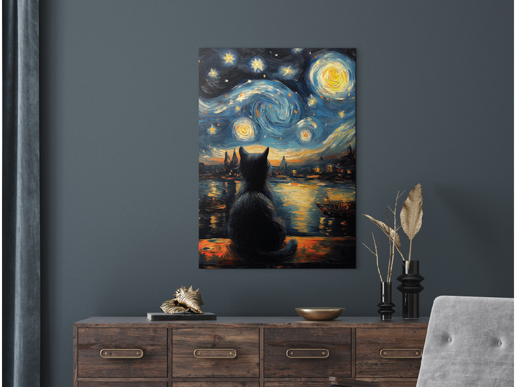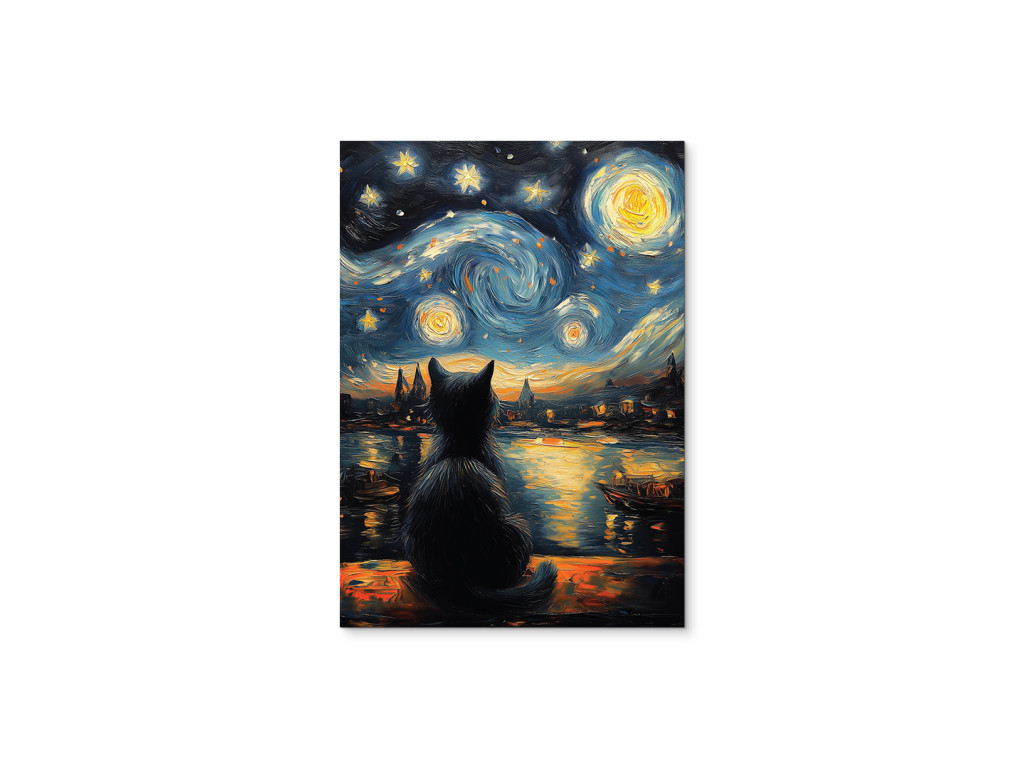 A Macska a csillagok alatt egy finom absztrakt festmény, amely a csendes elmélkedés és a béke pillanatait ragadja meg. Egy fekete macska sziluettje ül egy tó partján, és a csillagos égboltot bámulja. A távolban egy alvó falu körvonalai látszanak, mintha az idő elfeledte volna őket. A tompa színek, a nyugodt vízfelület és a lágy csillagfény álomszerű, szinte meditatív hangulatot teremt. A festmény vizuális költészetként hat – csendes, gyengéd és tele szimbolikával, alkalmas olyan enteriőrökbe, amelyek békére és mélyebb jelentésre vágynak.