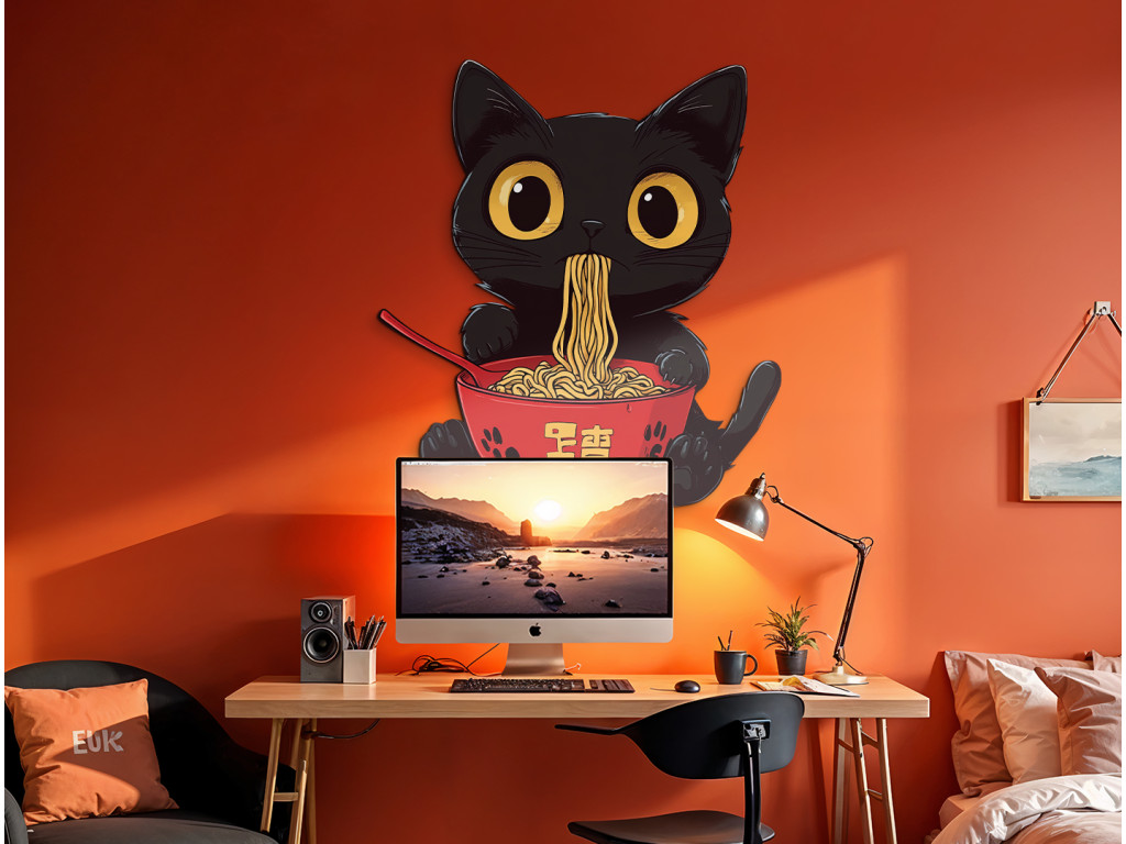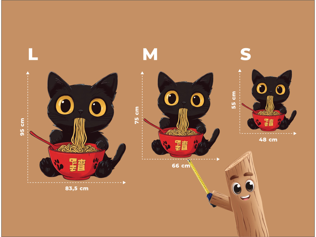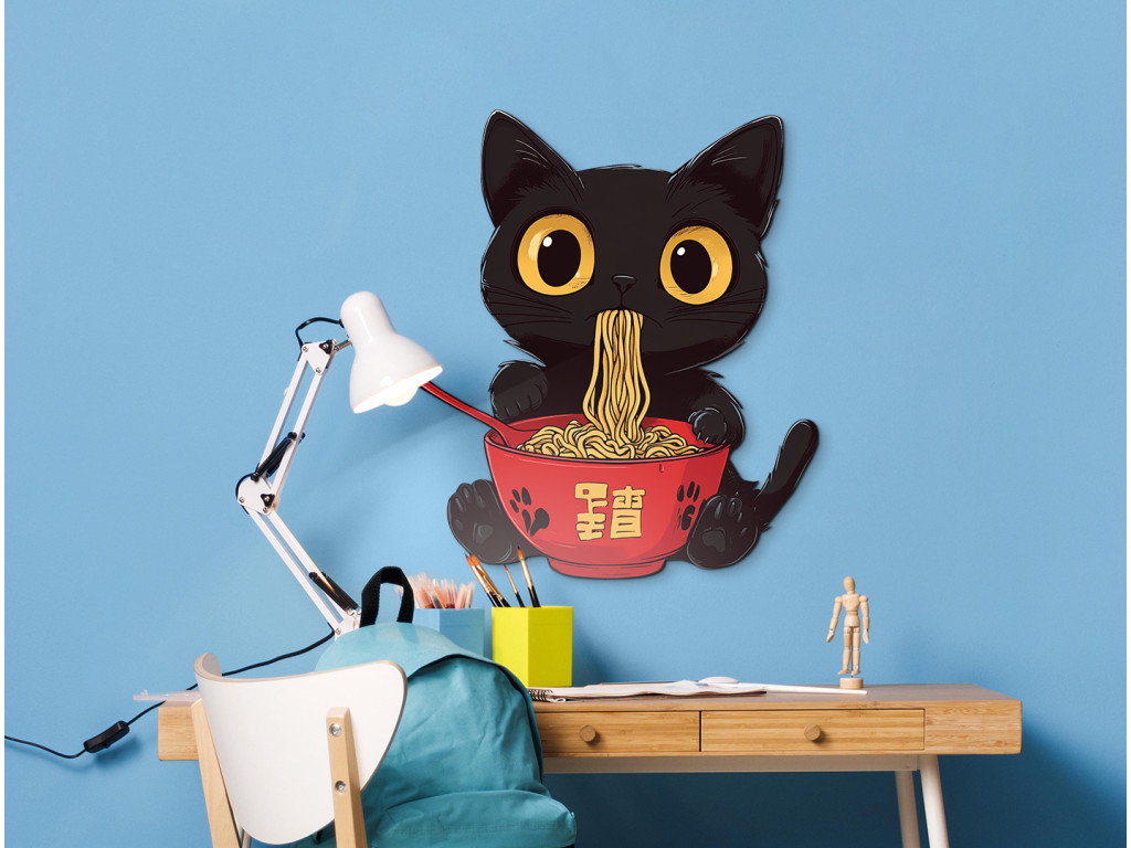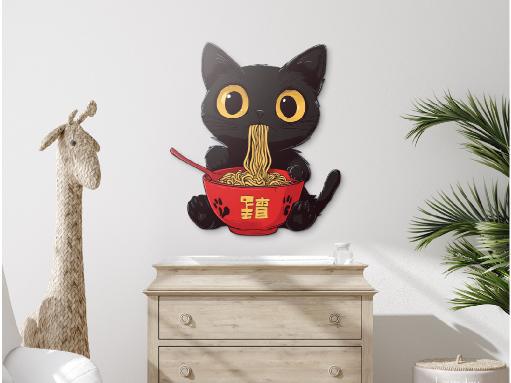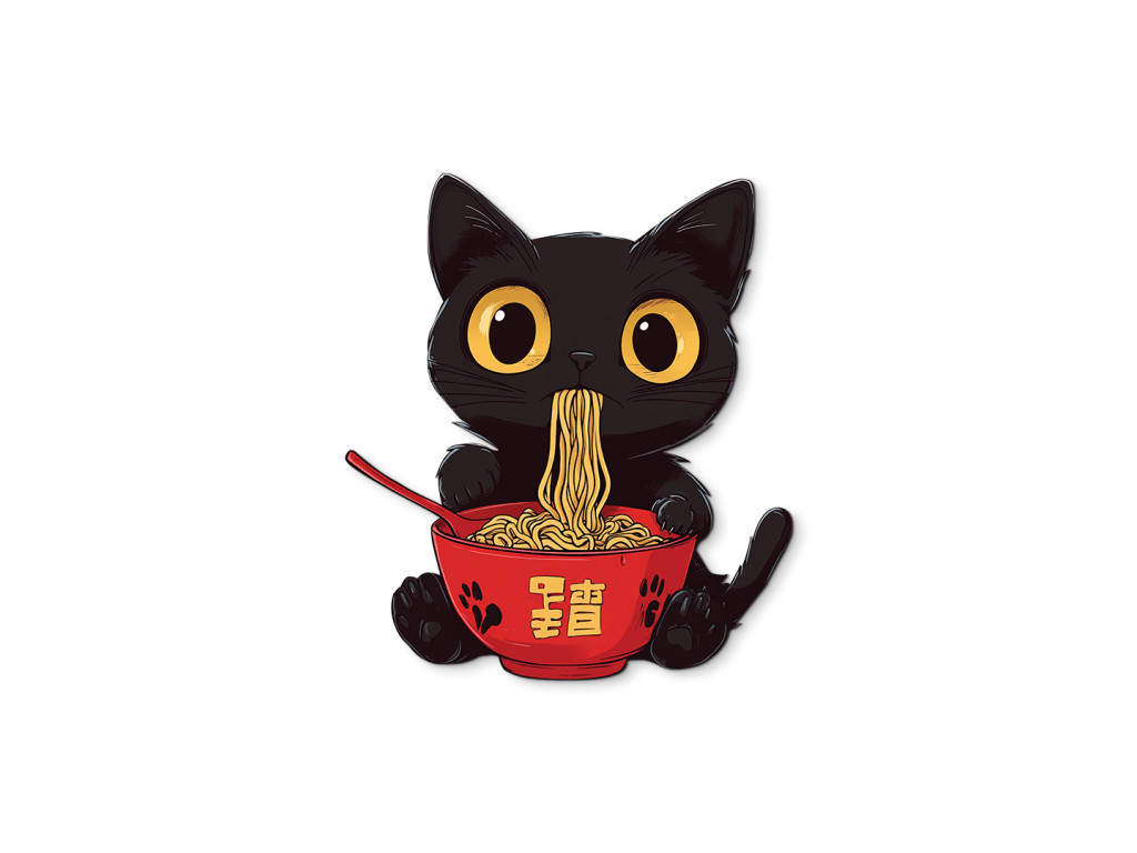 Ez az aranyos fekete cica boldogan élvezi a tál ráment – szemei tágra nyíltak a boldogságtól, mancsai pedig készen állnak egy újabb falatra. Az illusztráció a japán kultúrát játékos macskás bájjal ötvözi, és garantáltan mosolyt csal minden macska- és ázsiai konyhakedvelő arcára.