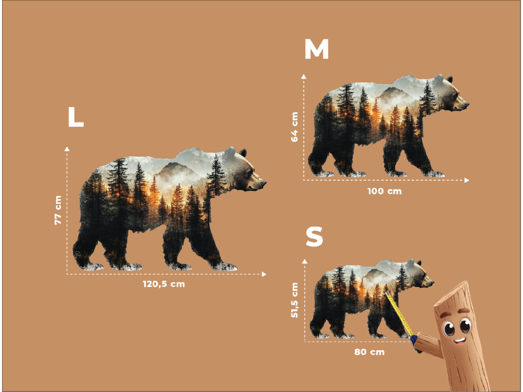 A medve sziluett faldekoráció a vad fenségét ötvözi a művészi kifejezéssel. A forma belsejében egy békés erdei táj terül el tűlevelű fákkal, hegyekkel és a naplemente vagy napfelkelte meleg fényével. Ez a természetes motívum harmóniát, erőt és a vadonnal való kapcsolatot visz a térbe.