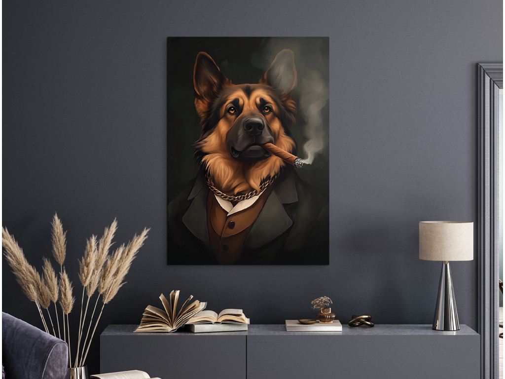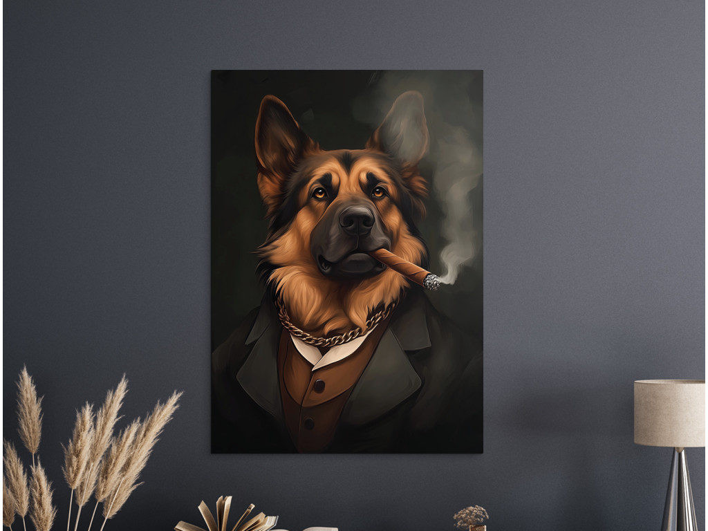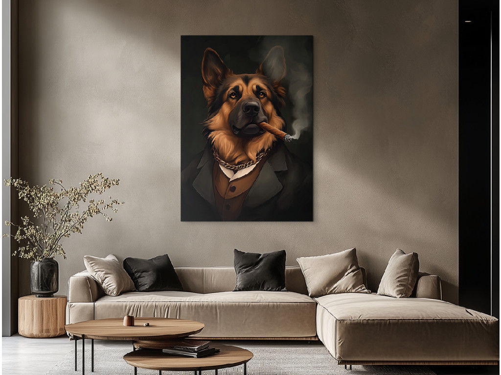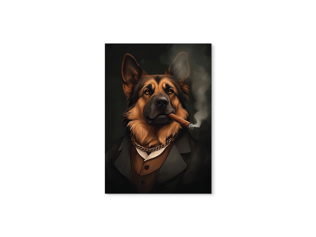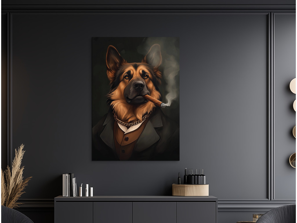 A Német juhászkutya az alvilág árnyékából kép egy portré, amely az autoritást, a stílust és egy csipet humort egyesít: öltönyben mellénnyel, arany lánccal és a szájában szivarral igazi, tiszteletet parancsoló főnök benyomását kelti. A sötét háttér kiemeli a tekintetét és a bunda realista rajzát, így vizuálisan erős és felejthetetlen nyomat születik. Tökéletes kiegészítő azoknak, akik a kutyákat, az eleganciát és a karakteres, humoros művészetet kedvelik.