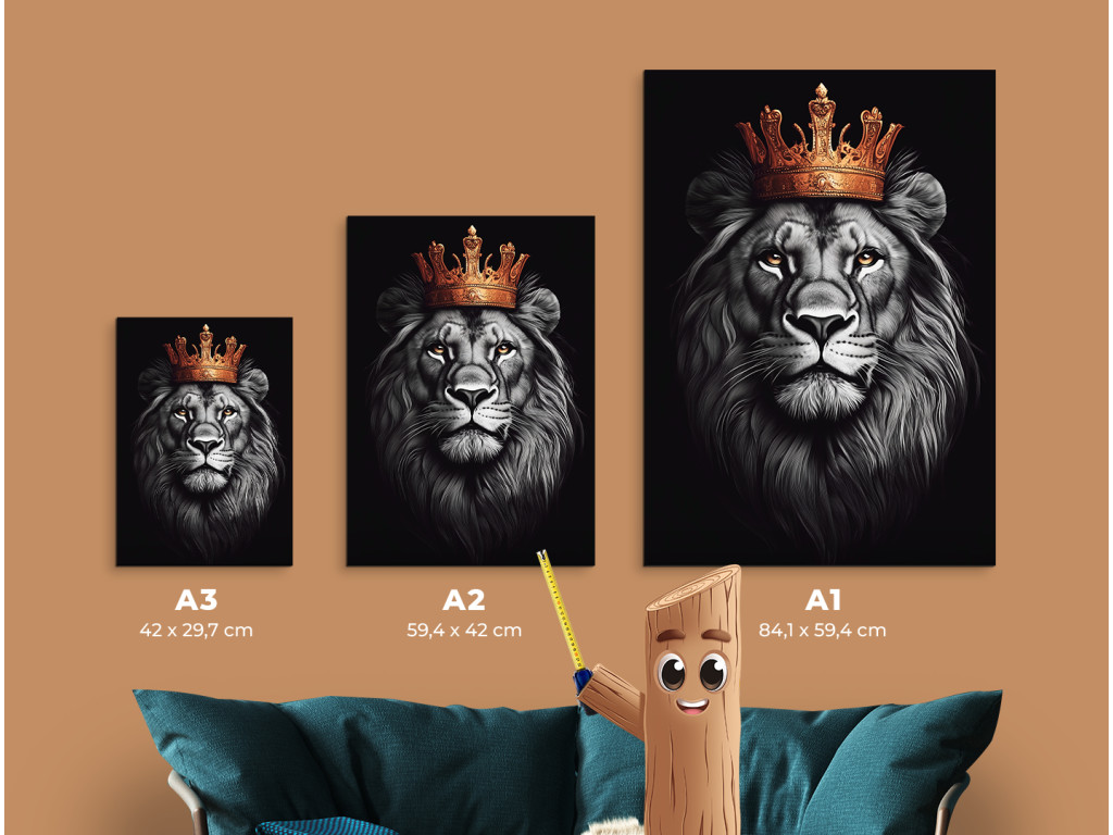 Az Állatok királya egy lenyűgöző portré egy fenséges aranykoronás oroszlánról, amely a méltóságot, az erőt és a békét testesíti meg. Az oroszlán büszke tekintete, sörényének szürke és fekete árnyalatainak kontrasztja a ragyogó aranykoronával drámai és elegáns látványt teremt. A sötét háttér fokozza a kifejezés intenzitását, és a képet kivételesen központi elemmé teszi bármely térben. Ideális olyan enteriőrökbe, amelyek az erő és a nemeslelkűség egyensúlyára törekszenek.