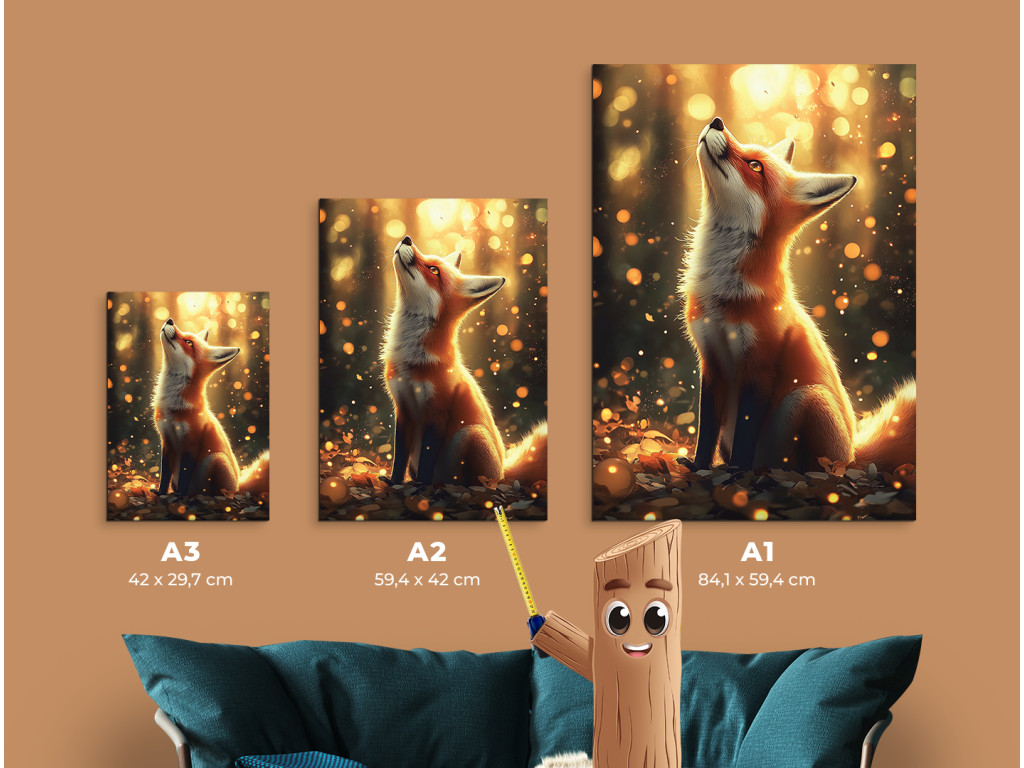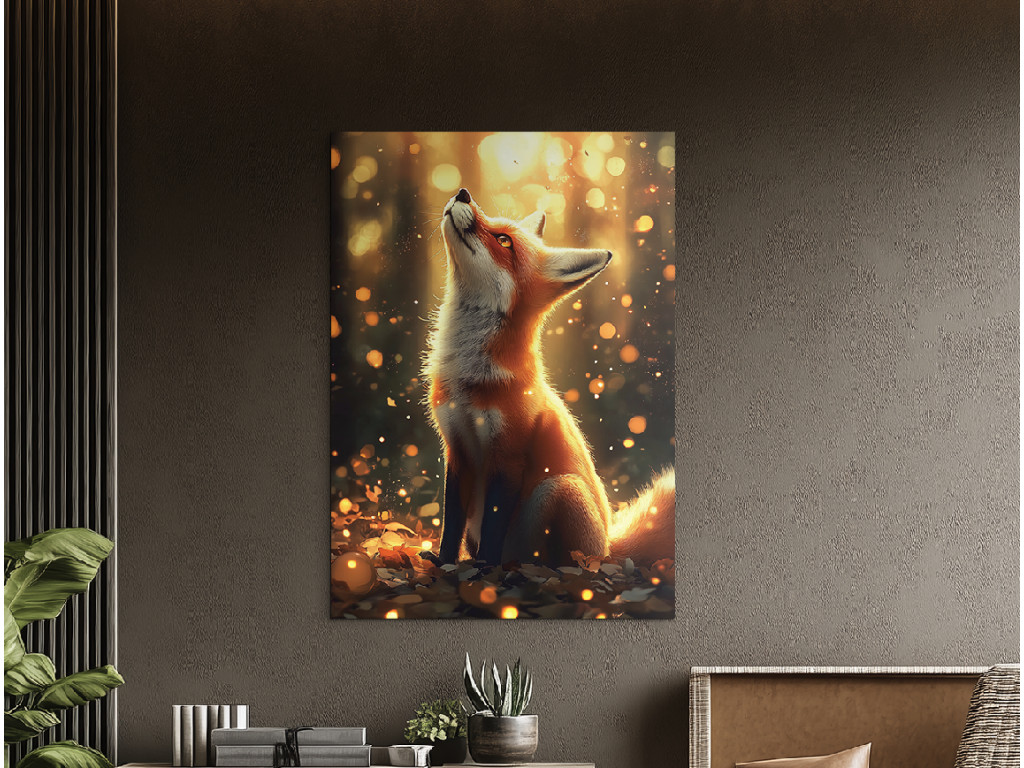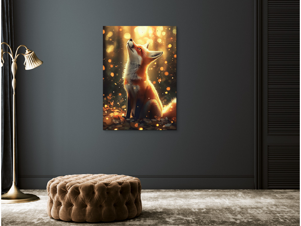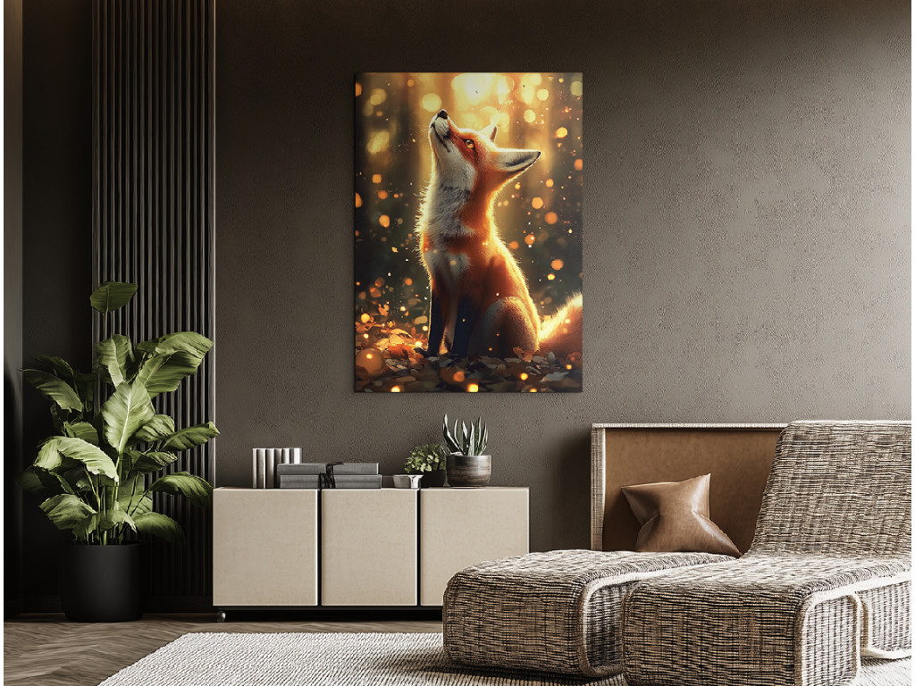 A Róka Napüdvözlete című lágy festmény egy békésen ülő és felfelé néző rókát ábrázol – mintha néma közösségben lenne a természettel, vagy a fák koronáján átszűrődő fényt csodálná. Bundája lágyan csillog a napsugarakban, meleg, nyugtató hangulatot kölcsönözve a jelenetnek. A festmény a kíváncsiság, a béke és a pillanathoz való kapcsolódás szimbólumaként működik.