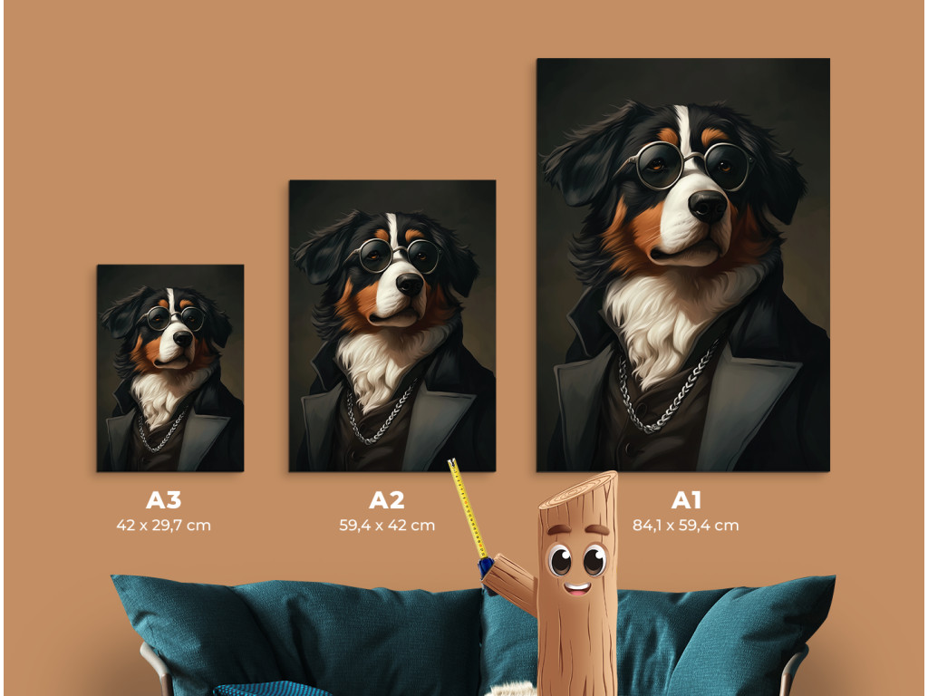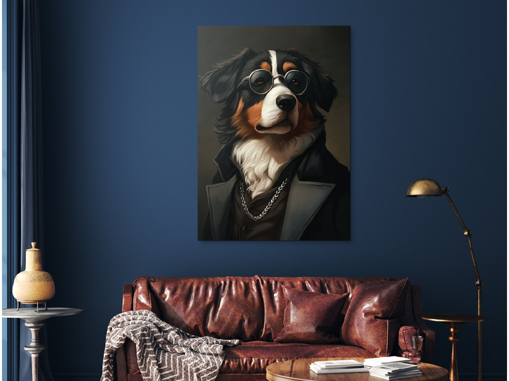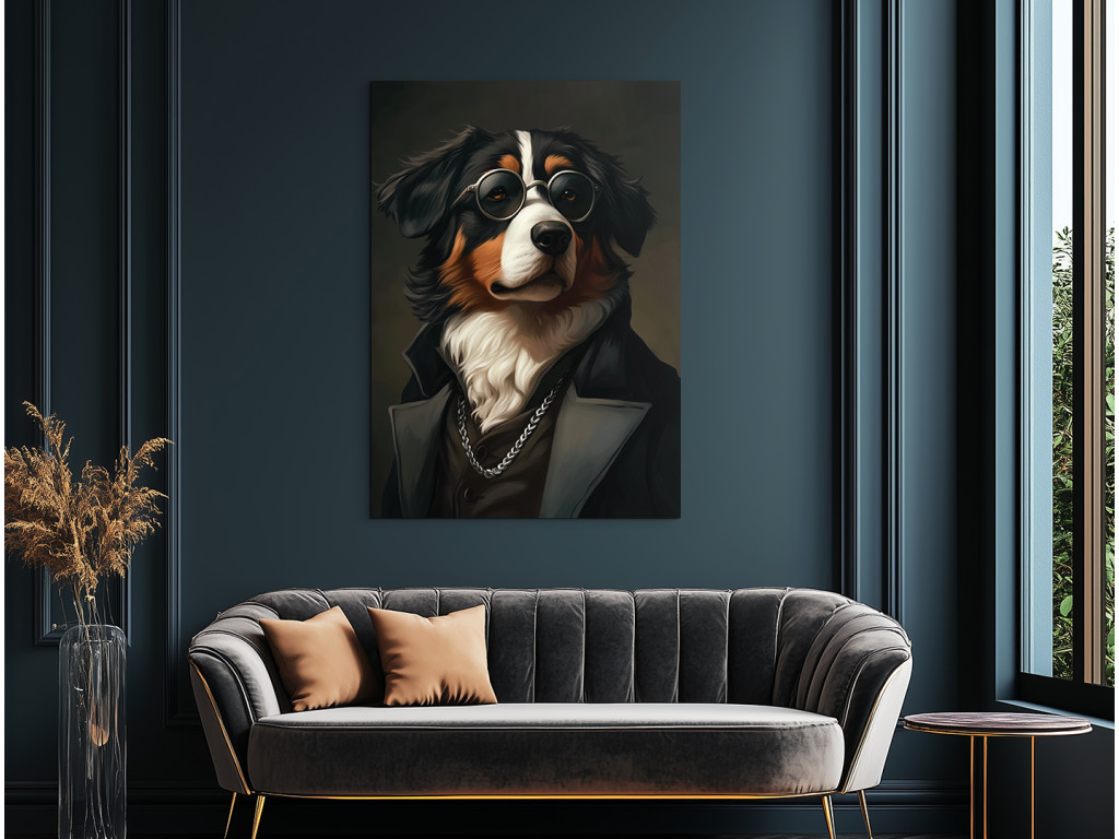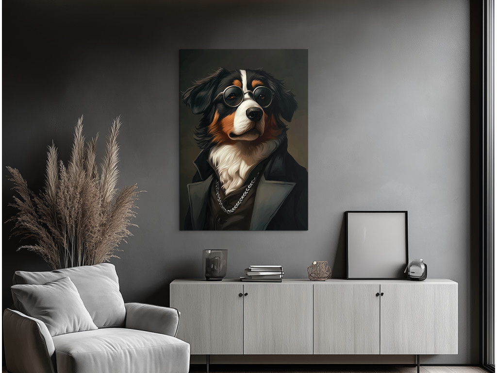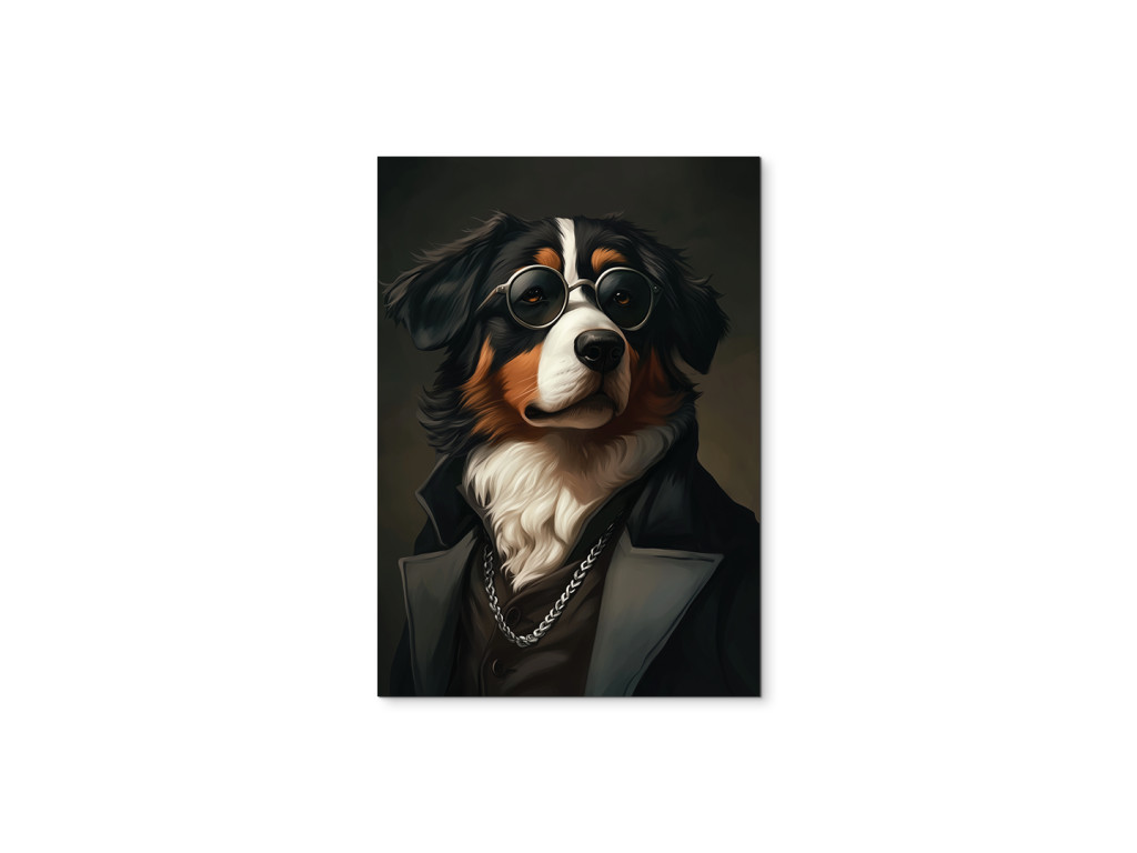 Az Elegáns Berni pásztorkutya egy modern portré egy berni pásztorkutyáról, aki stílusos, magabiztos és kissé titokzatos megjelenést kölcsönöz fekete kabátjának, ezüst láncának és kerek napszemüvegének köszönhetően. Fenséges megjelenését sötét háttér egészíti ki, amely minden vonalat kiemel, és elegáns jelleget kölcsönöz a képnek. Ideális kiegészítője egy olyan enteriőrnek, ahol a kutyák szeretete ötvöződik a stílusérzékkel és az eredeti művészi megoldásokkal.